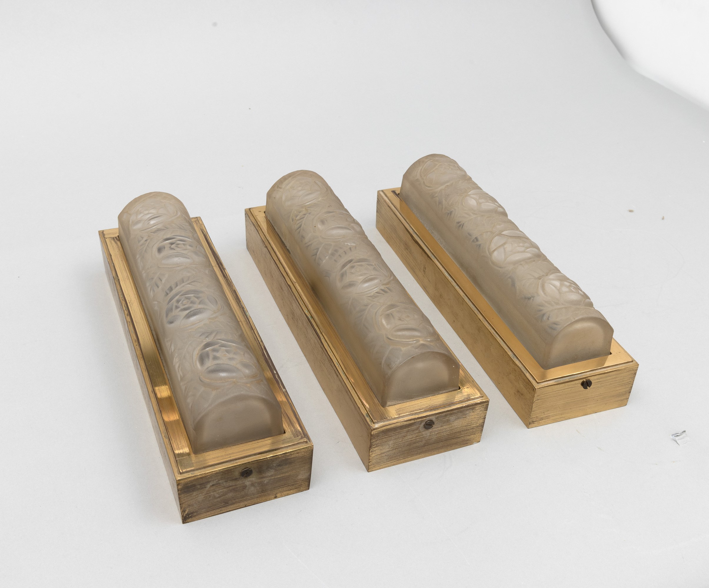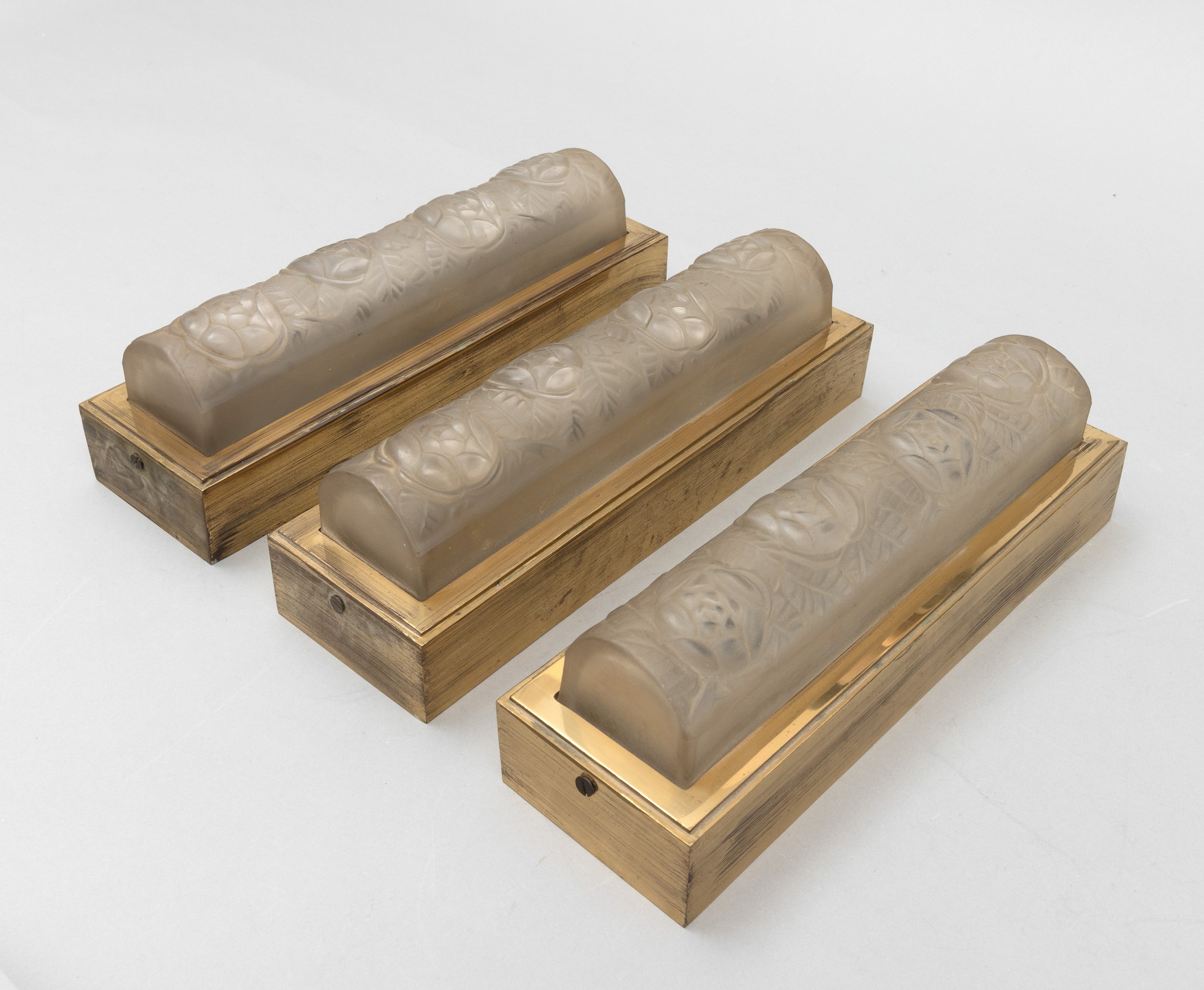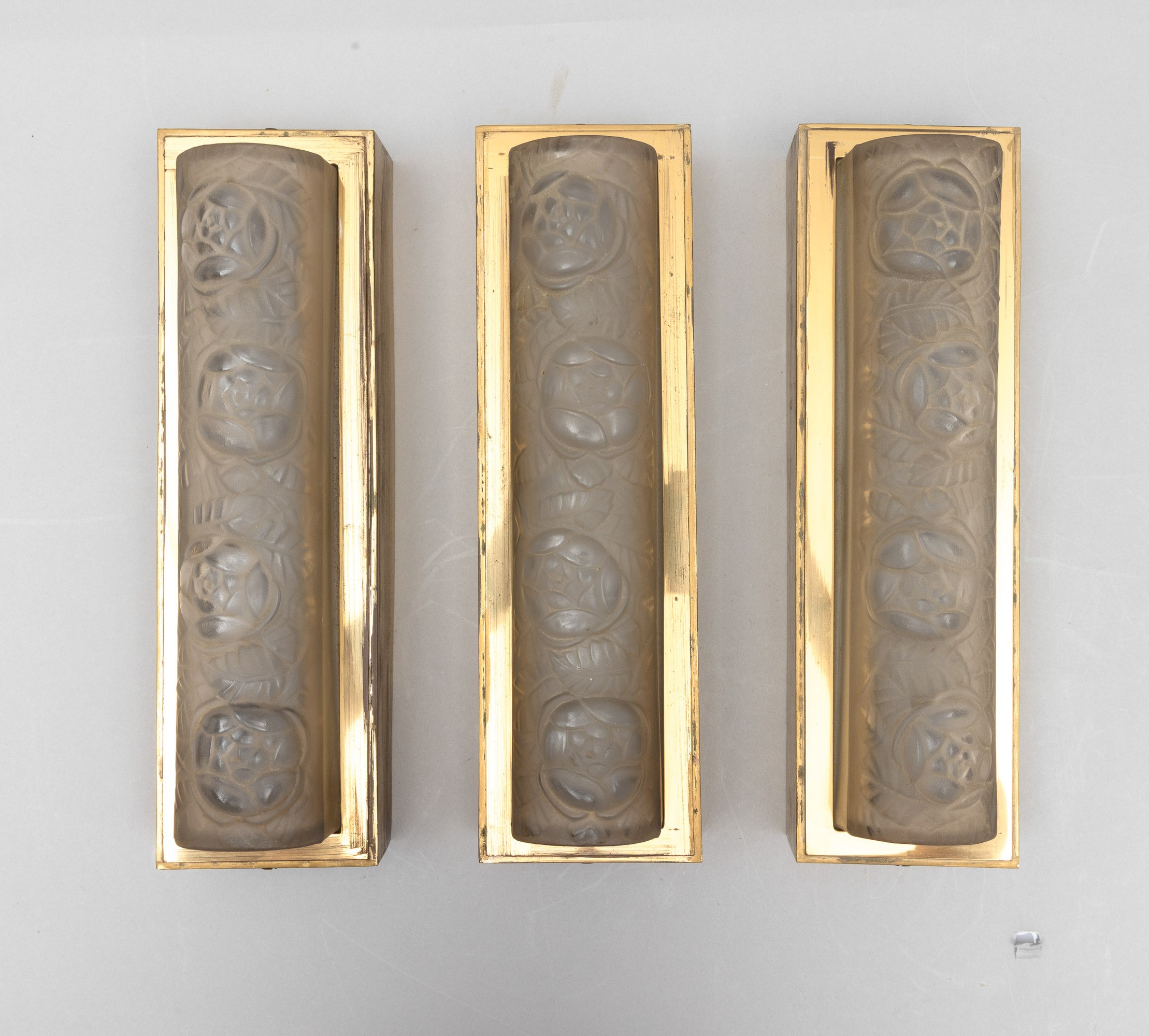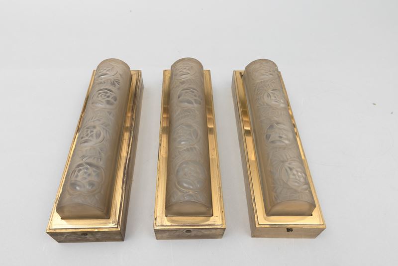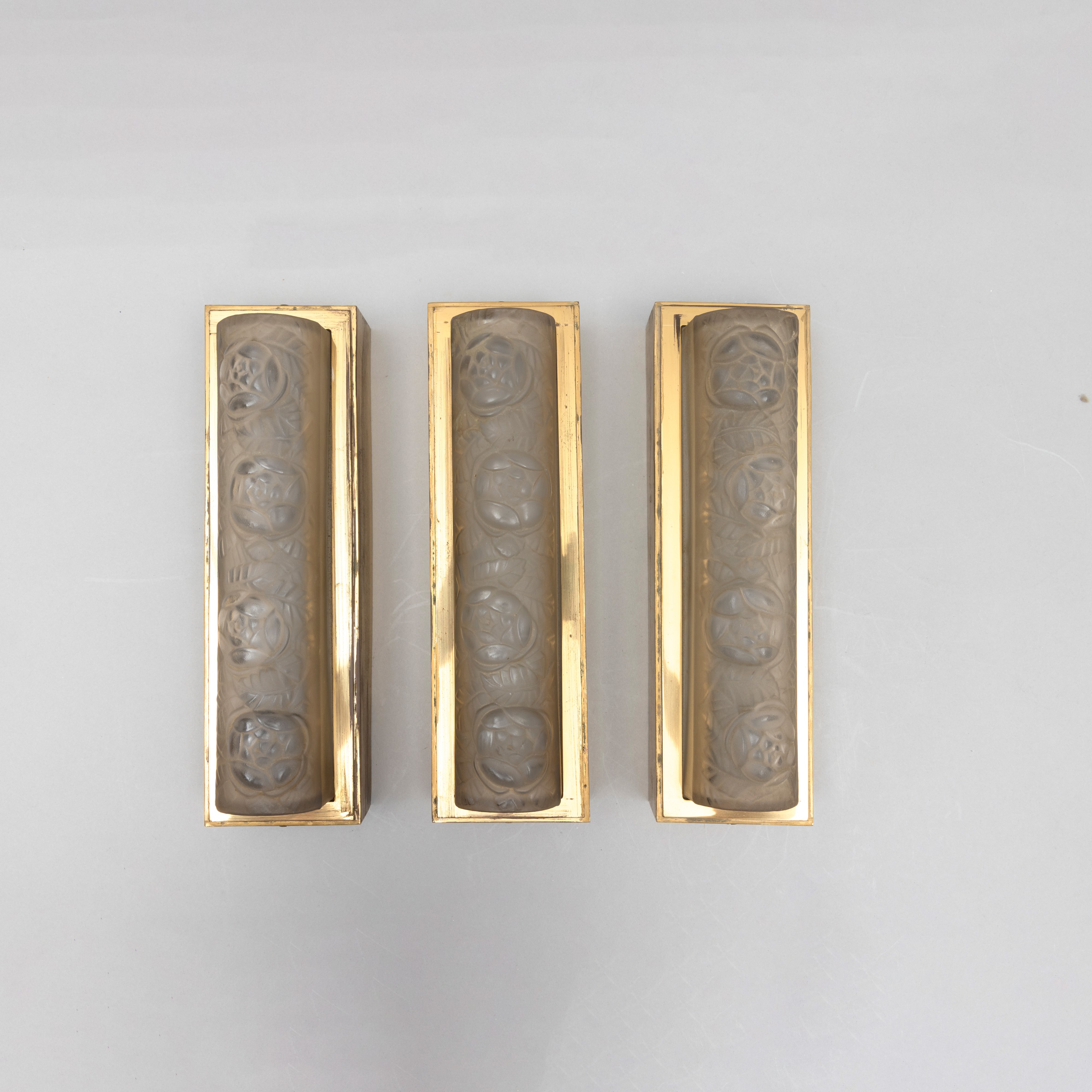 Three brass appliques with moulded crystal diffusers with a floral decor