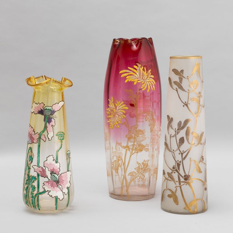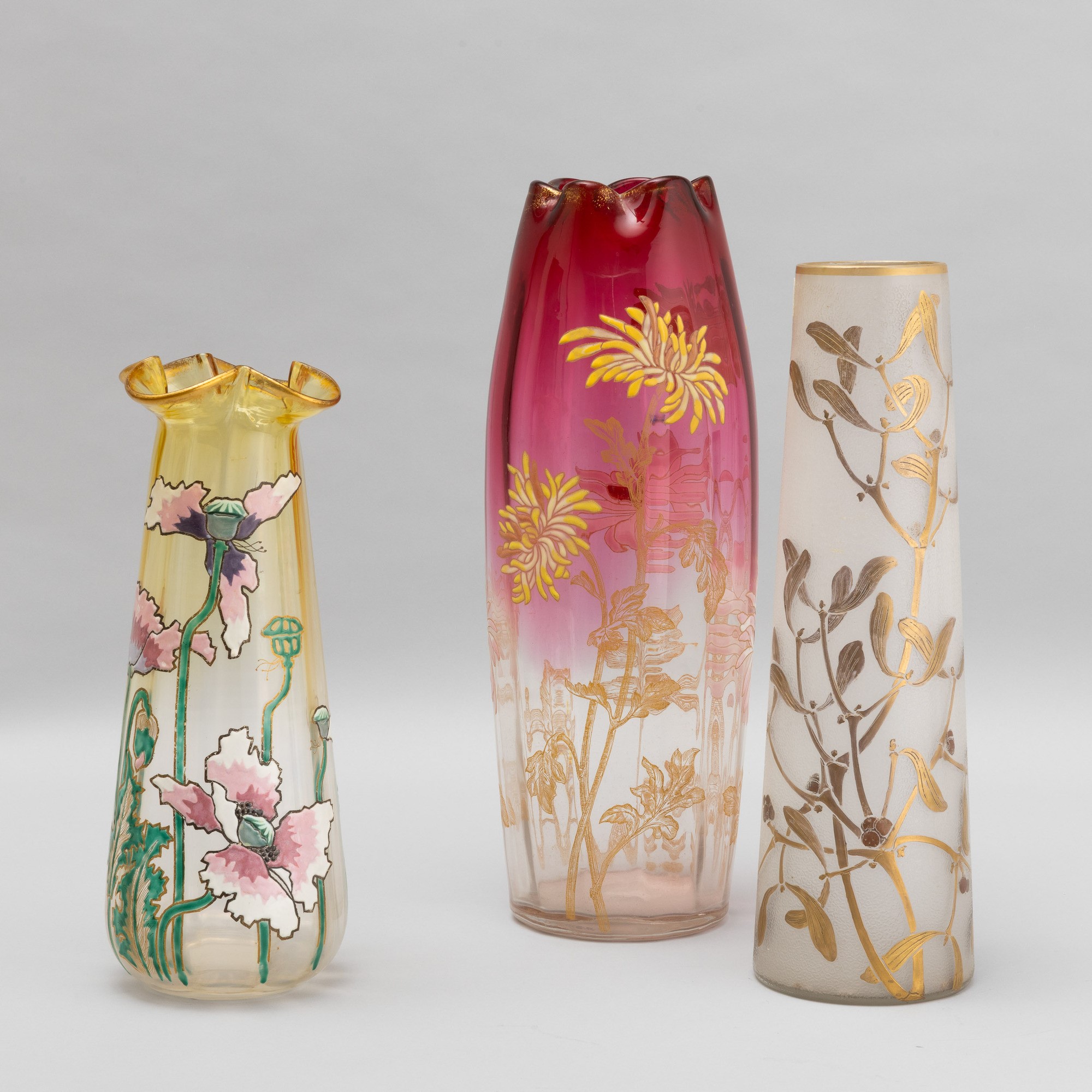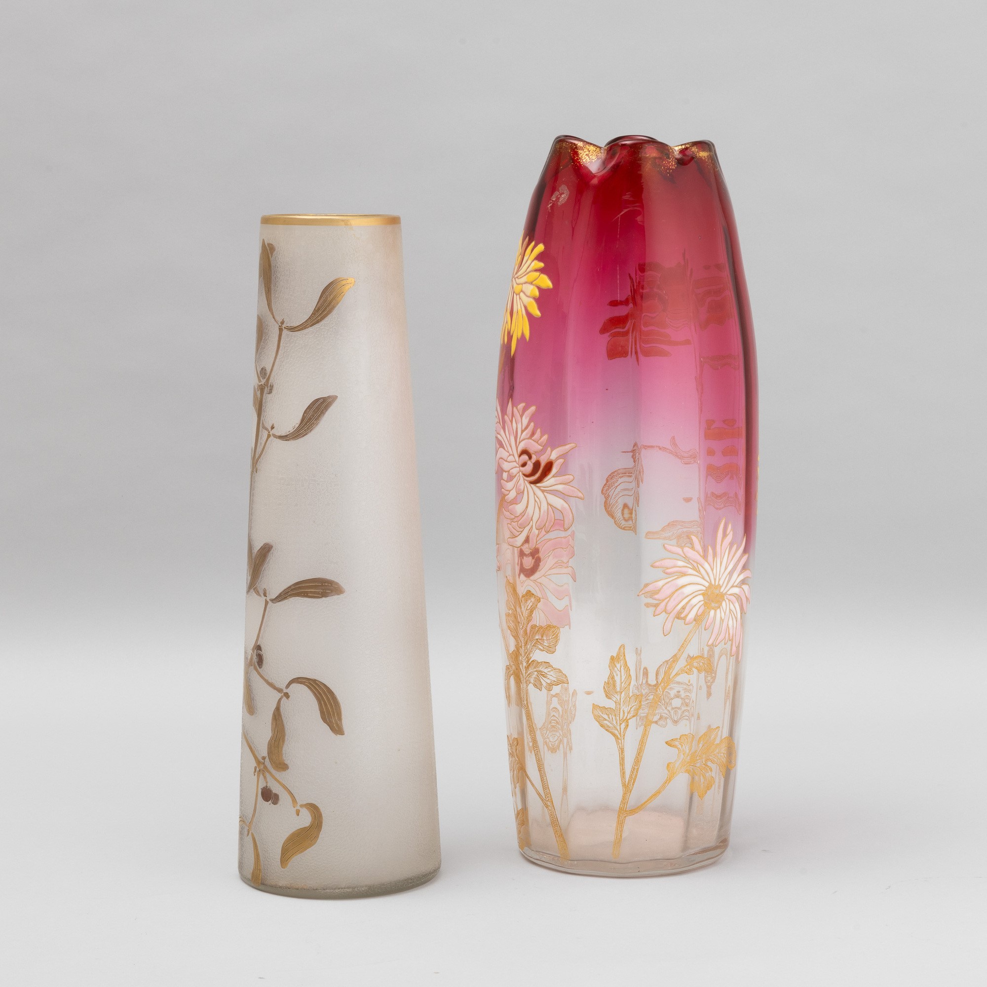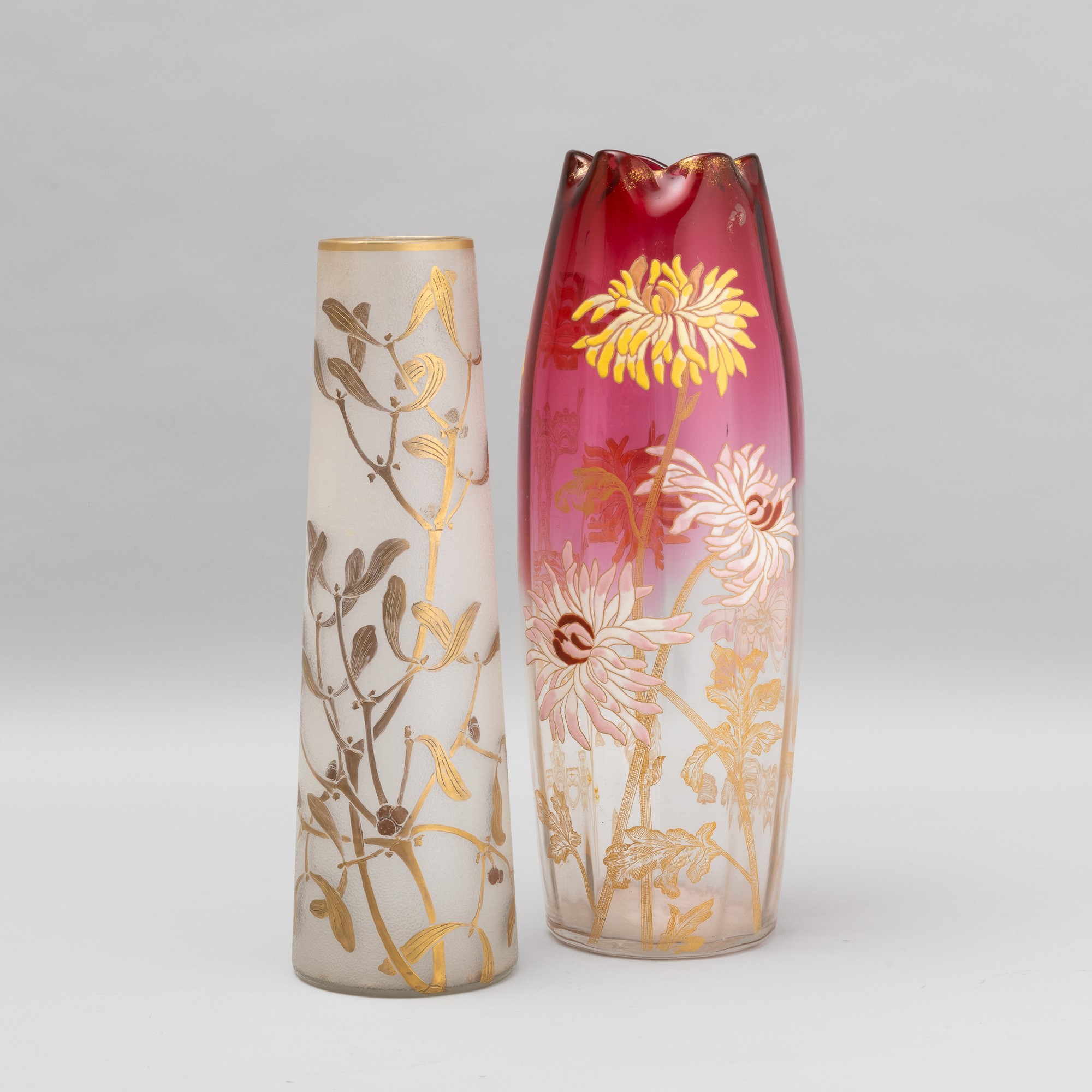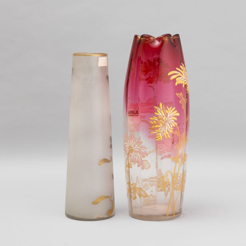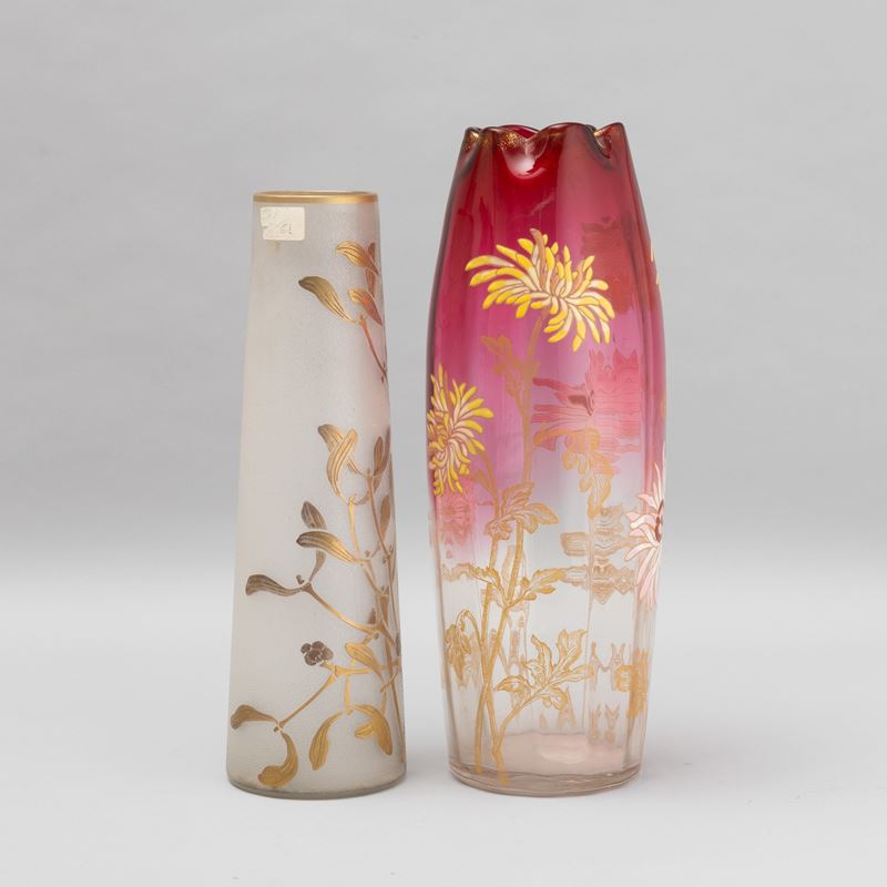 A ribbed blown glass vase with a polychrome enamelled and gilt decor and a corroded glass vase with a gilt decor