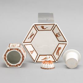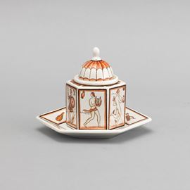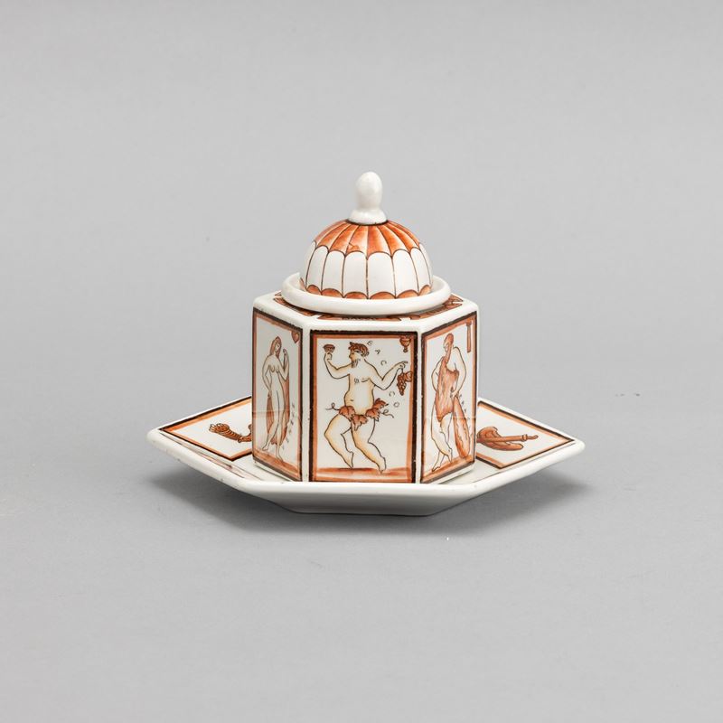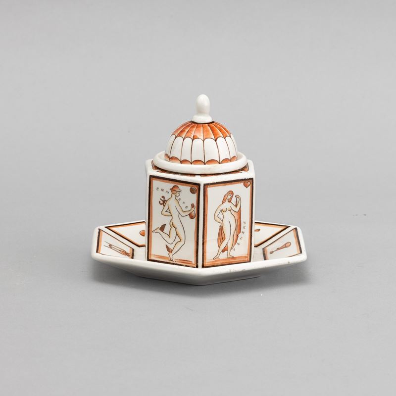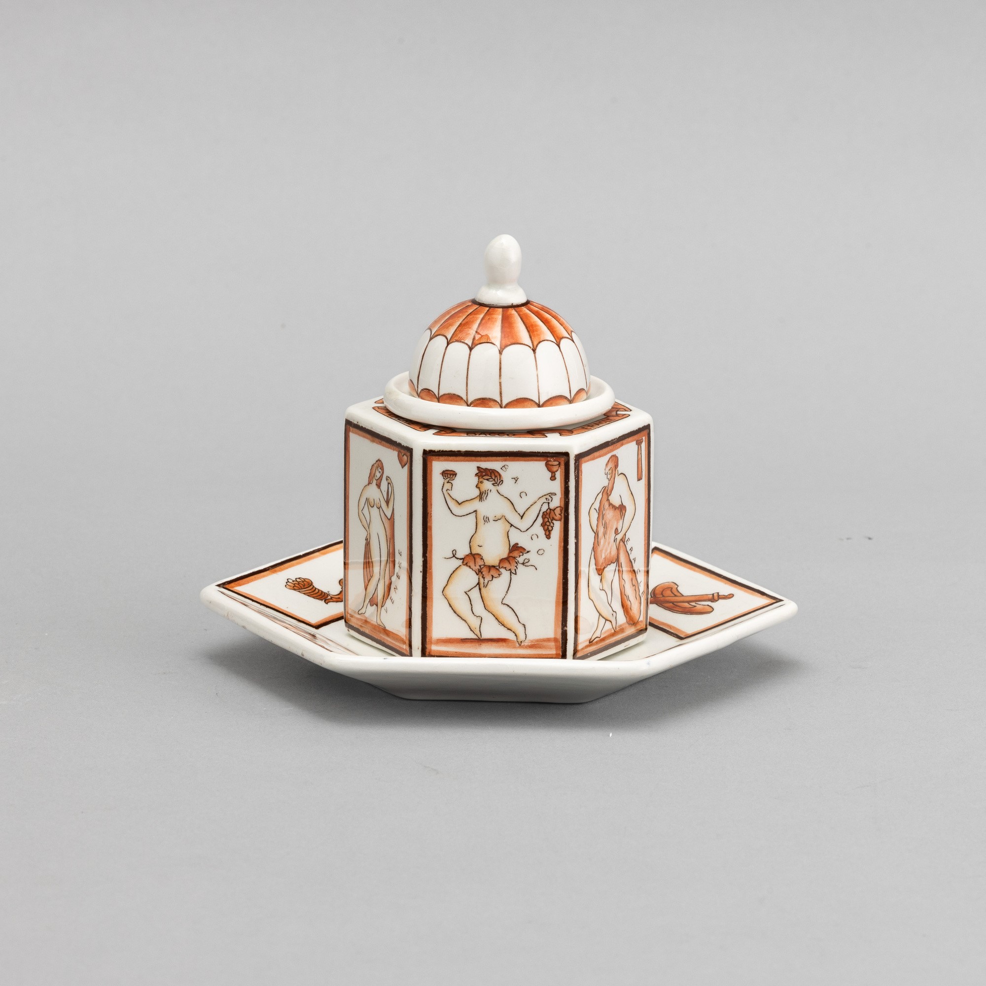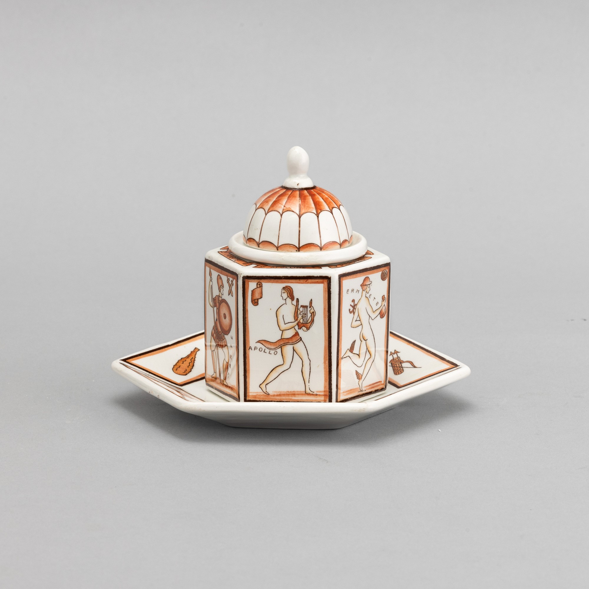 A slip-cast earthenware inkwell with a monochrome decor. Manufacturer's mark