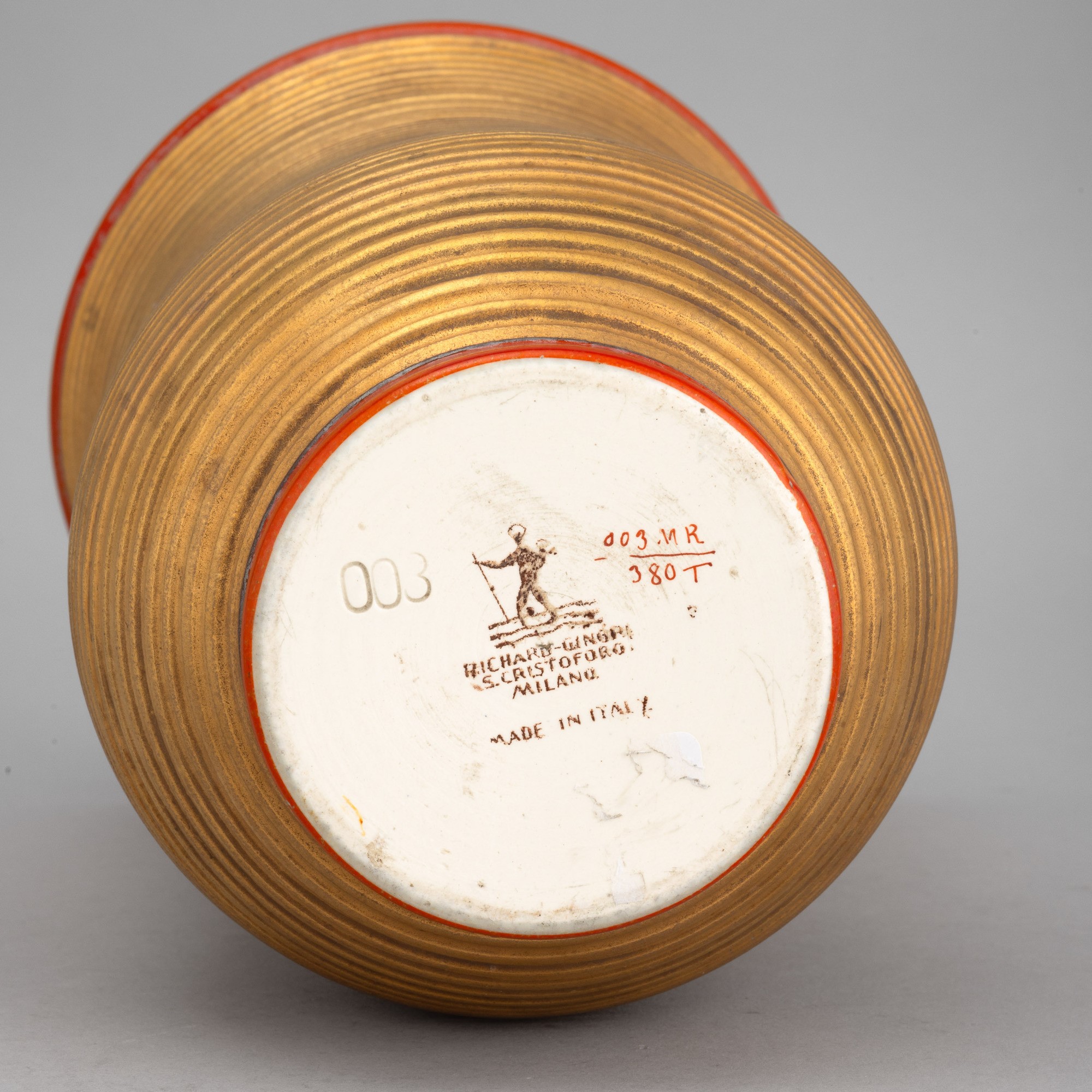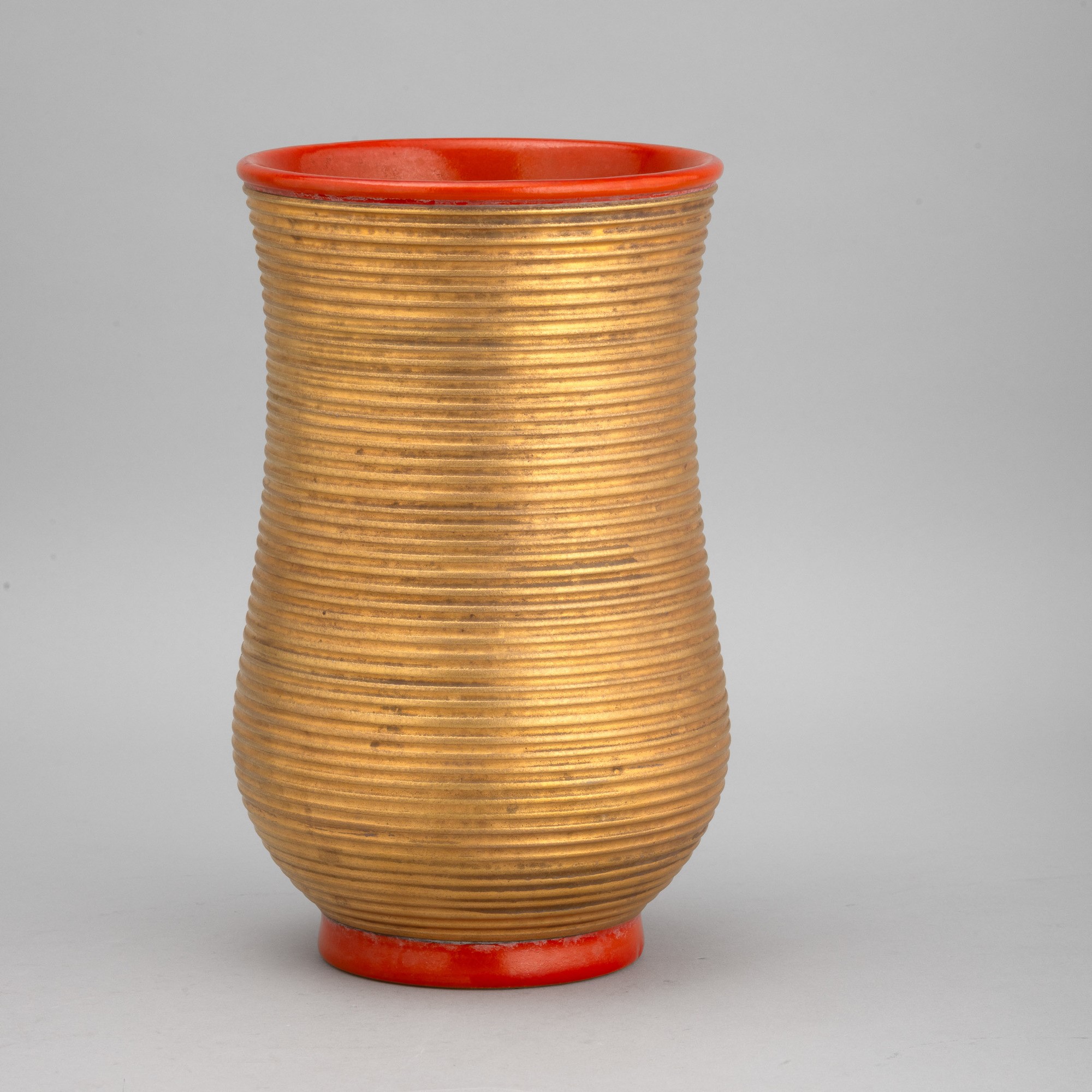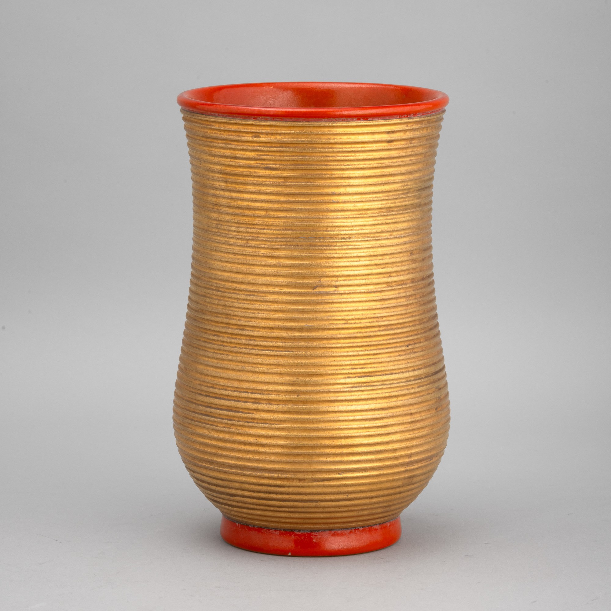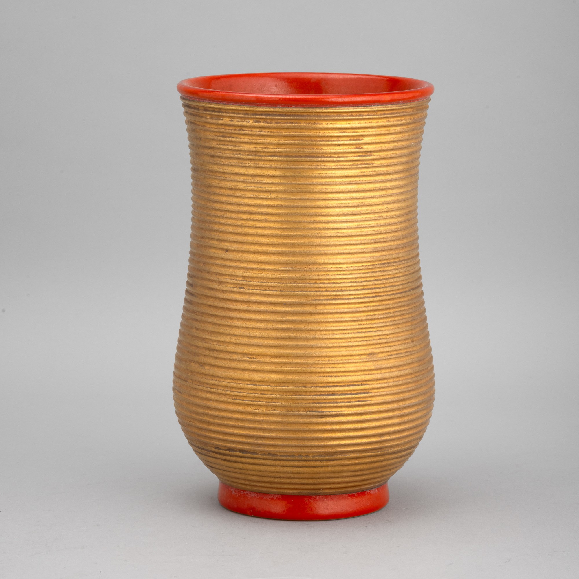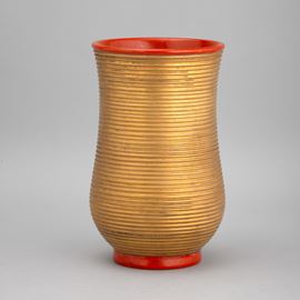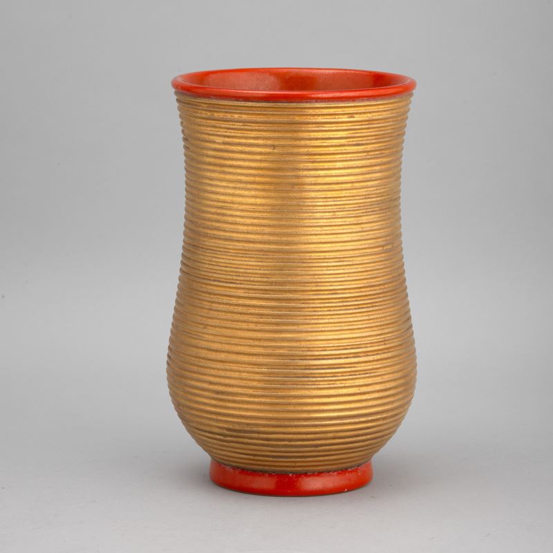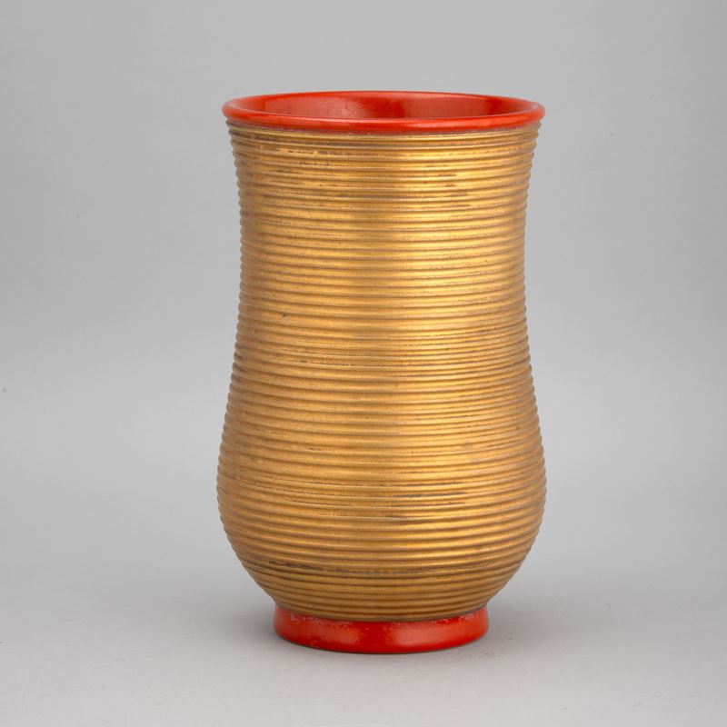 A slip-cast earthenware vase with an overglaze gold leaf decor. Manufacturer's mark