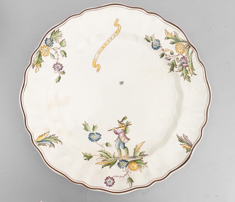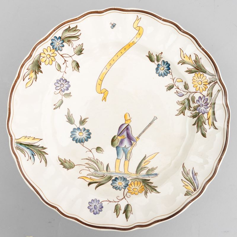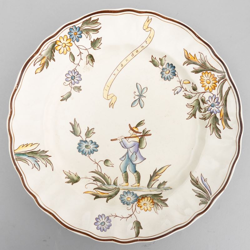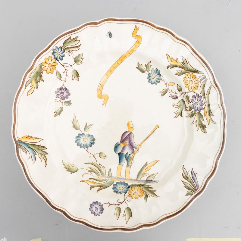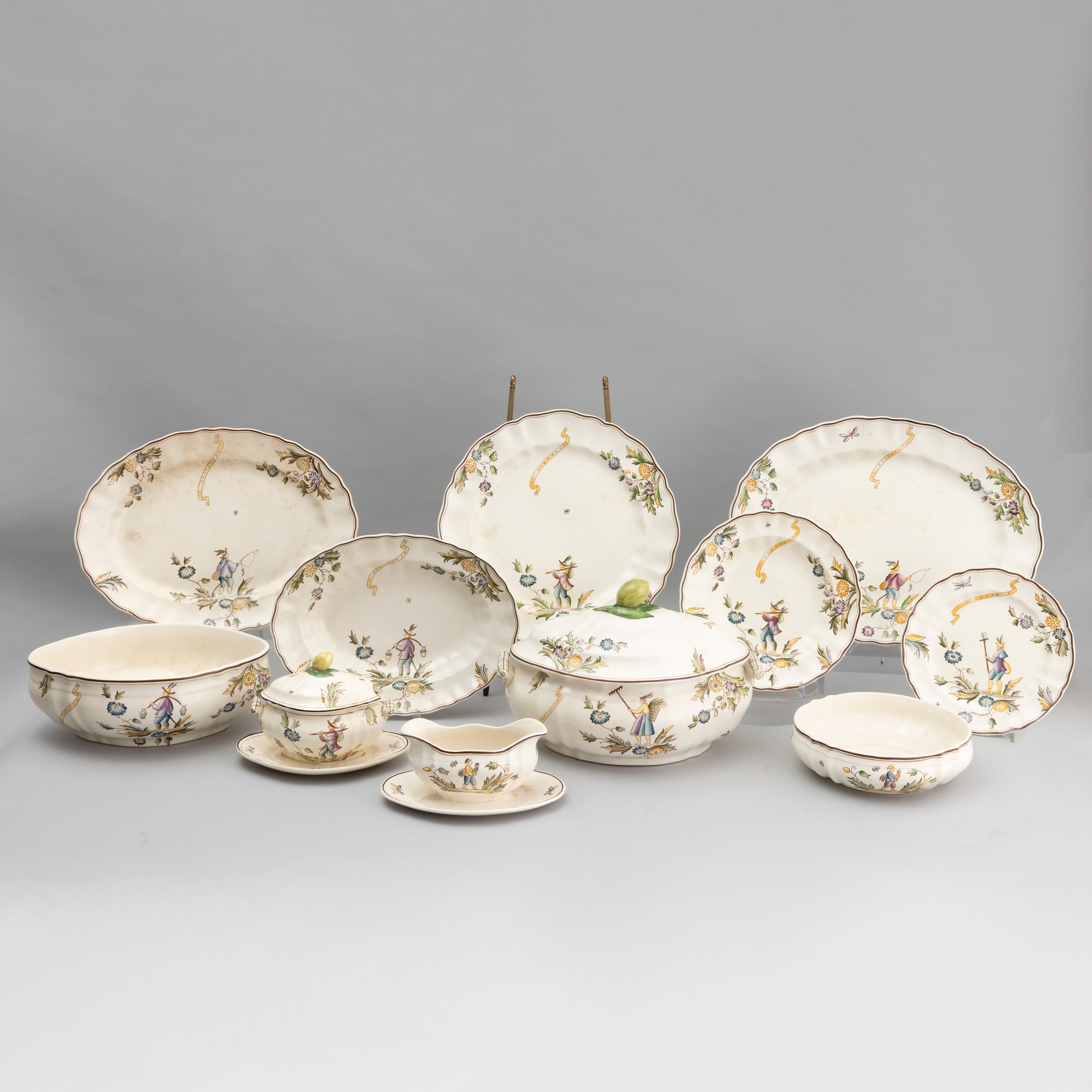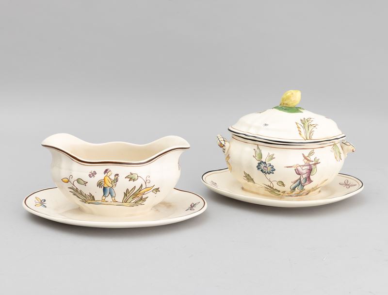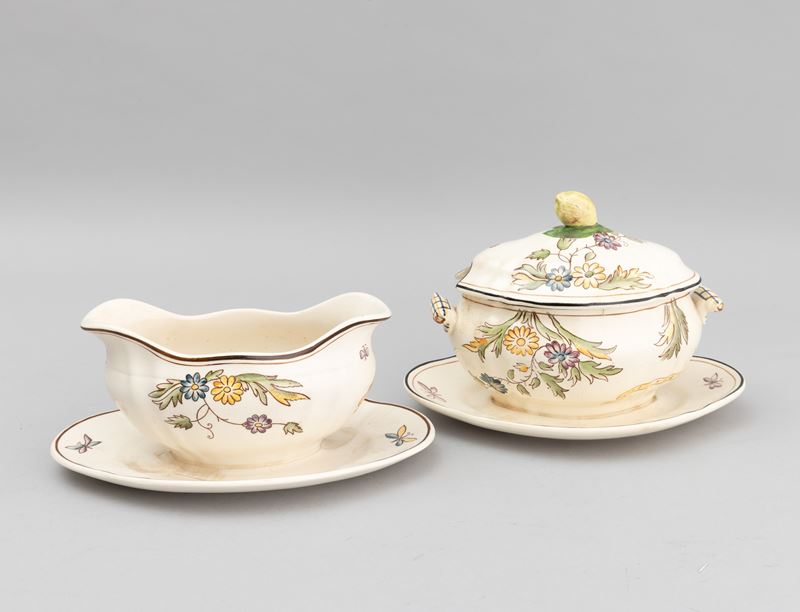 A slip-cast eathenware table set with a polychrome decor. Manufacturer's mark. Made up of 24