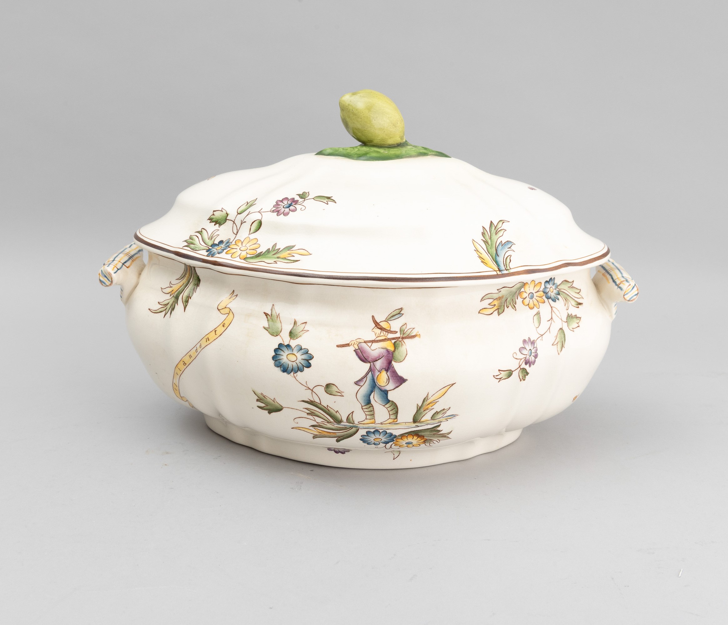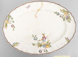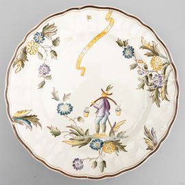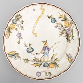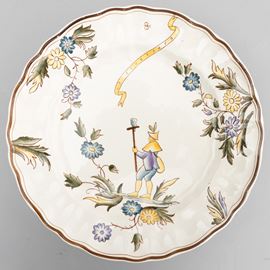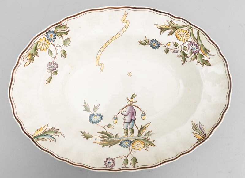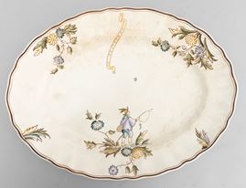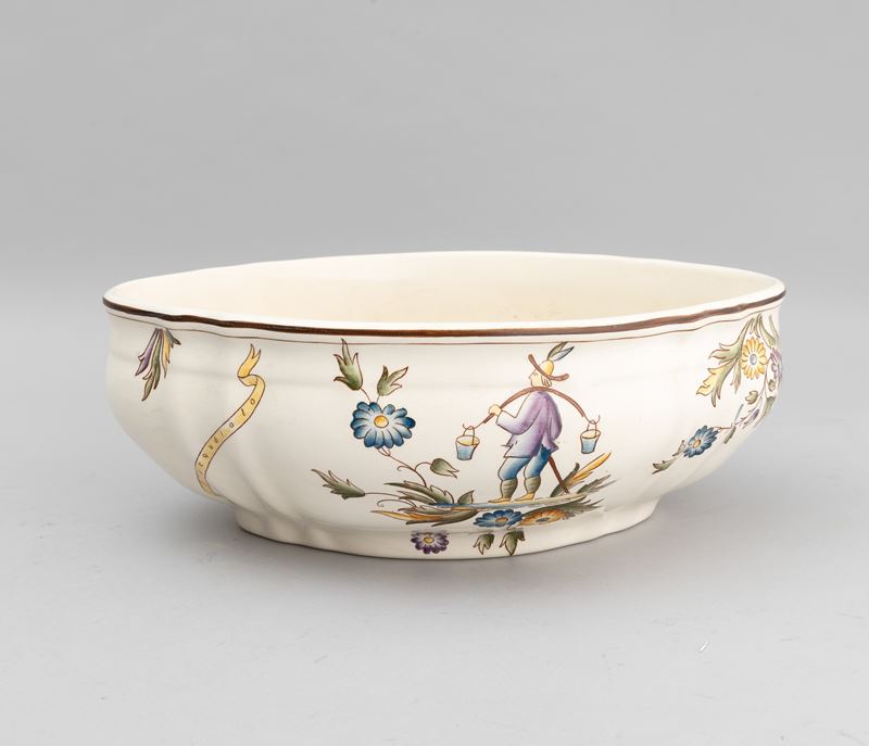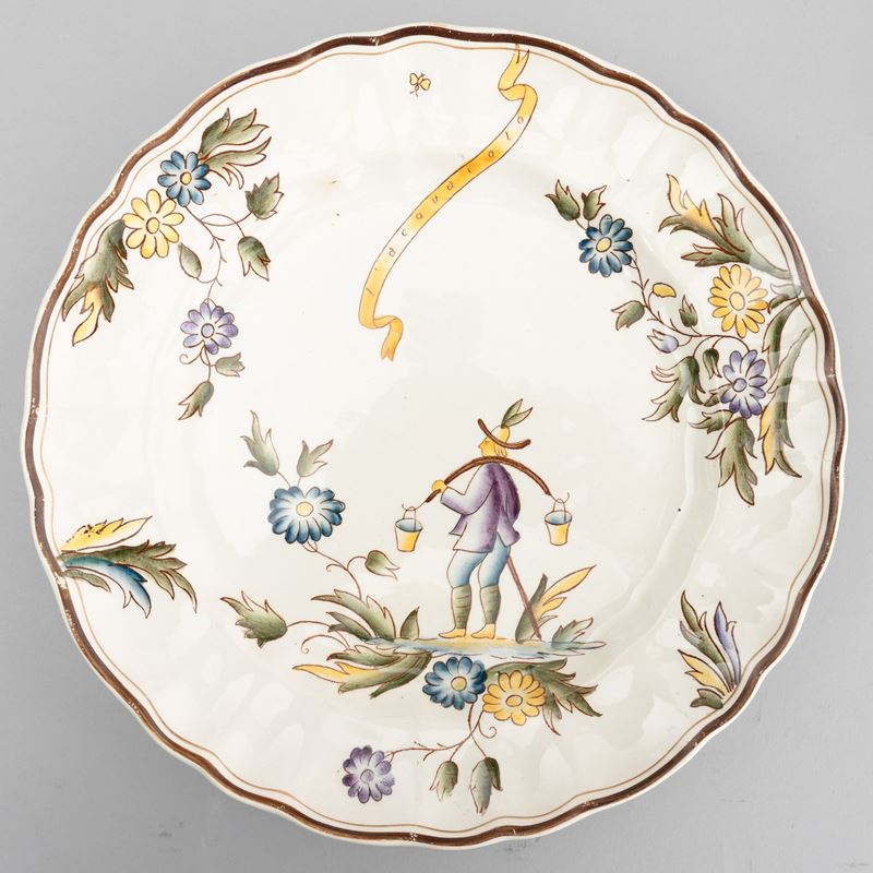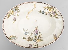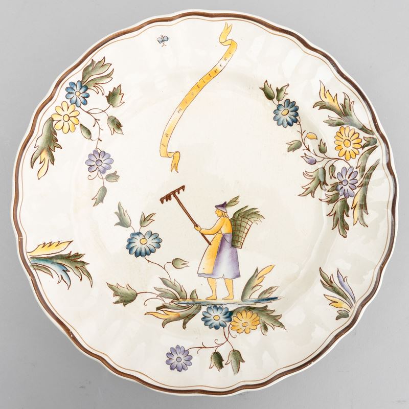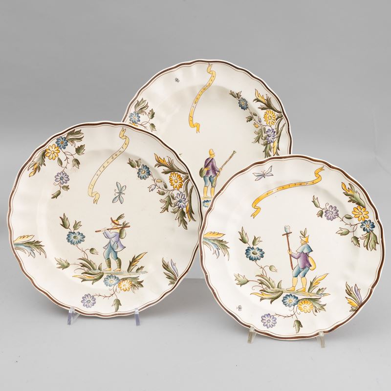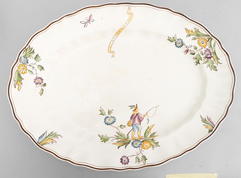 A slip-cast eathenware table set with a polychrome decor. Manufacturer's mark. Made up of 24
