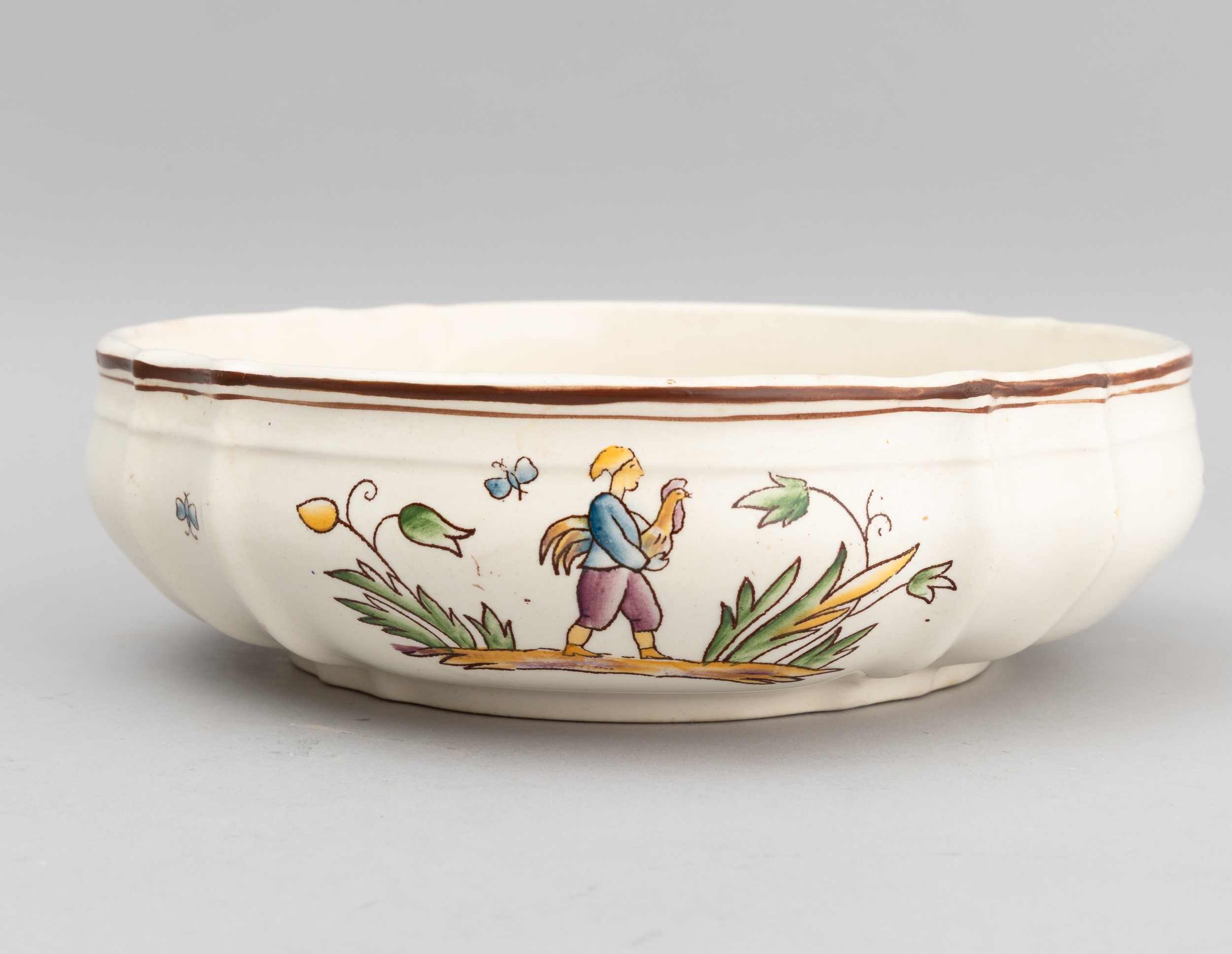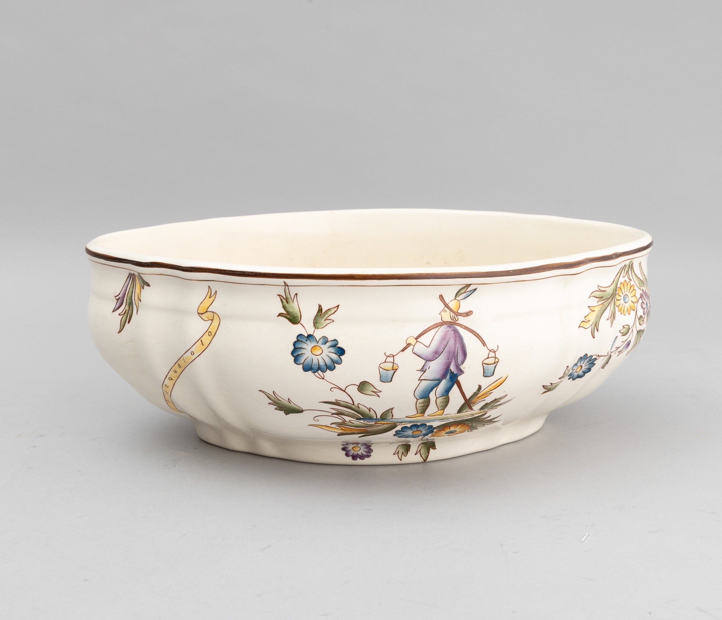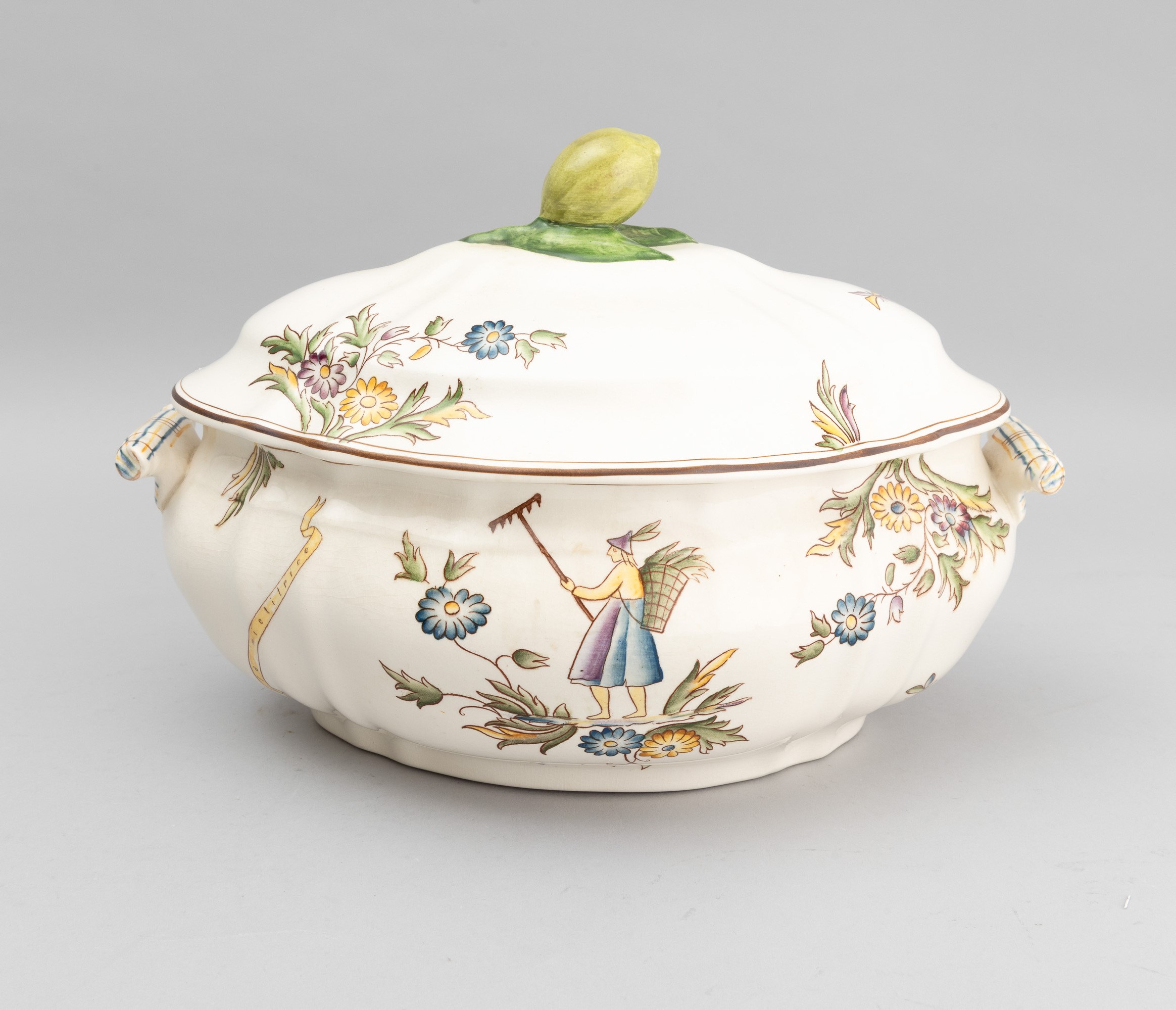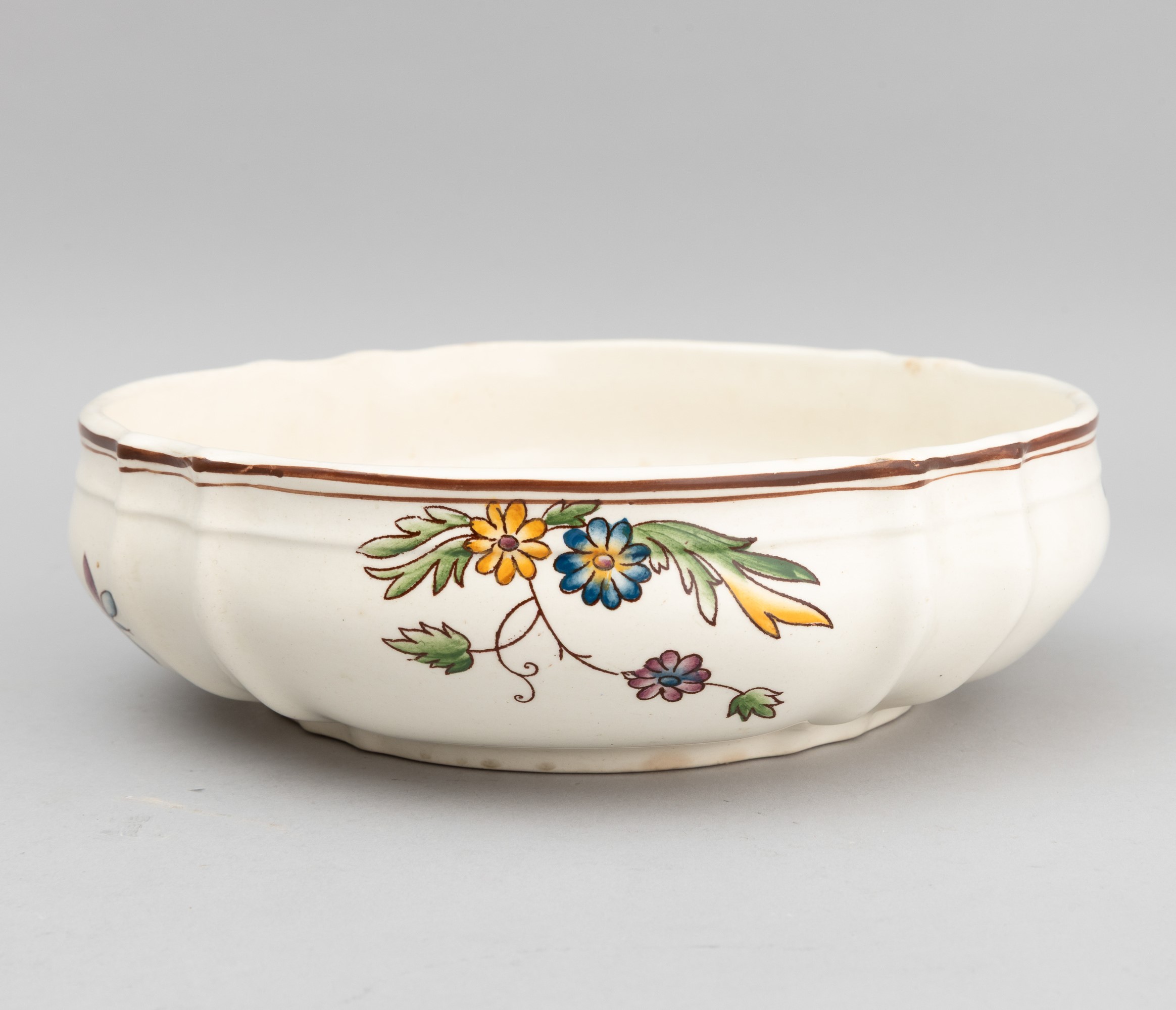 A slip-cast eathenware table set with a polychrome decor. Manufacturer's mark. Made up of 24