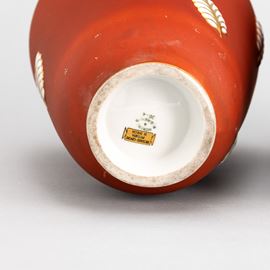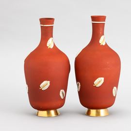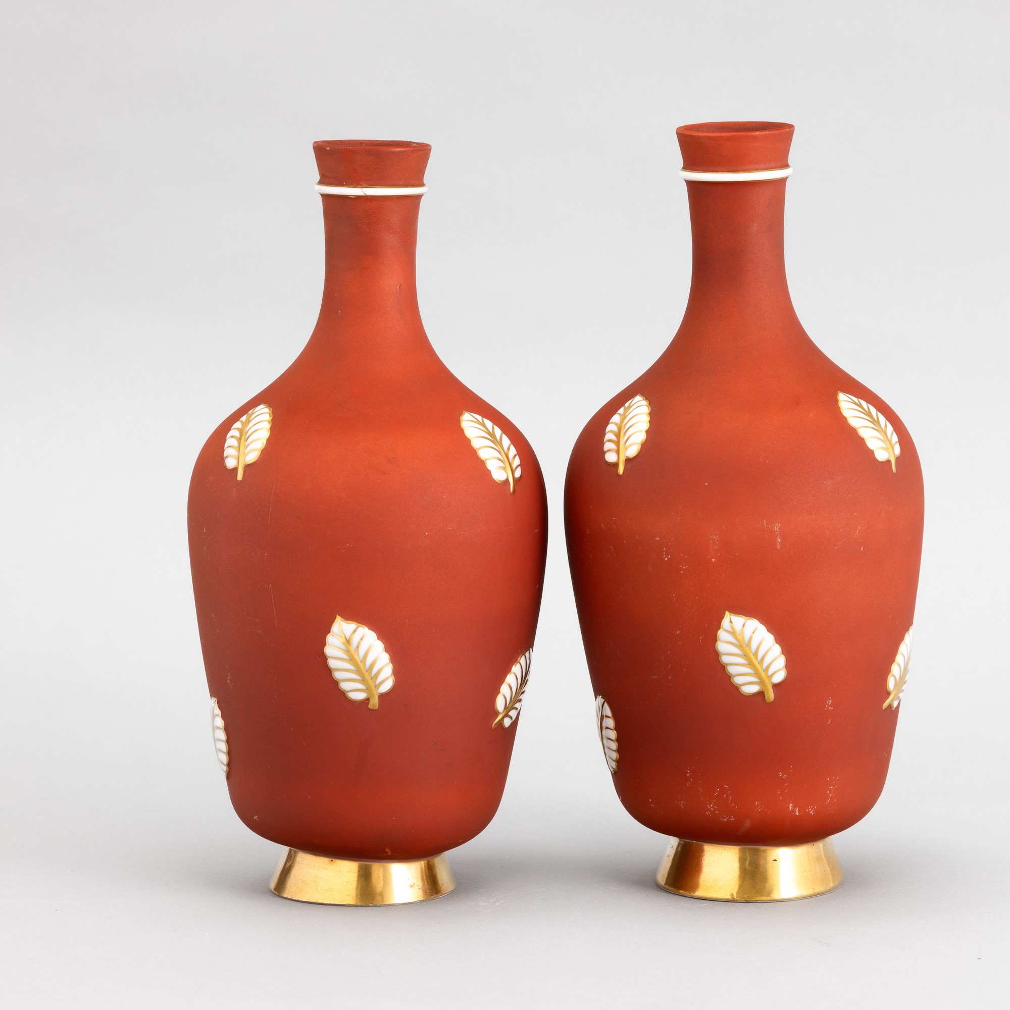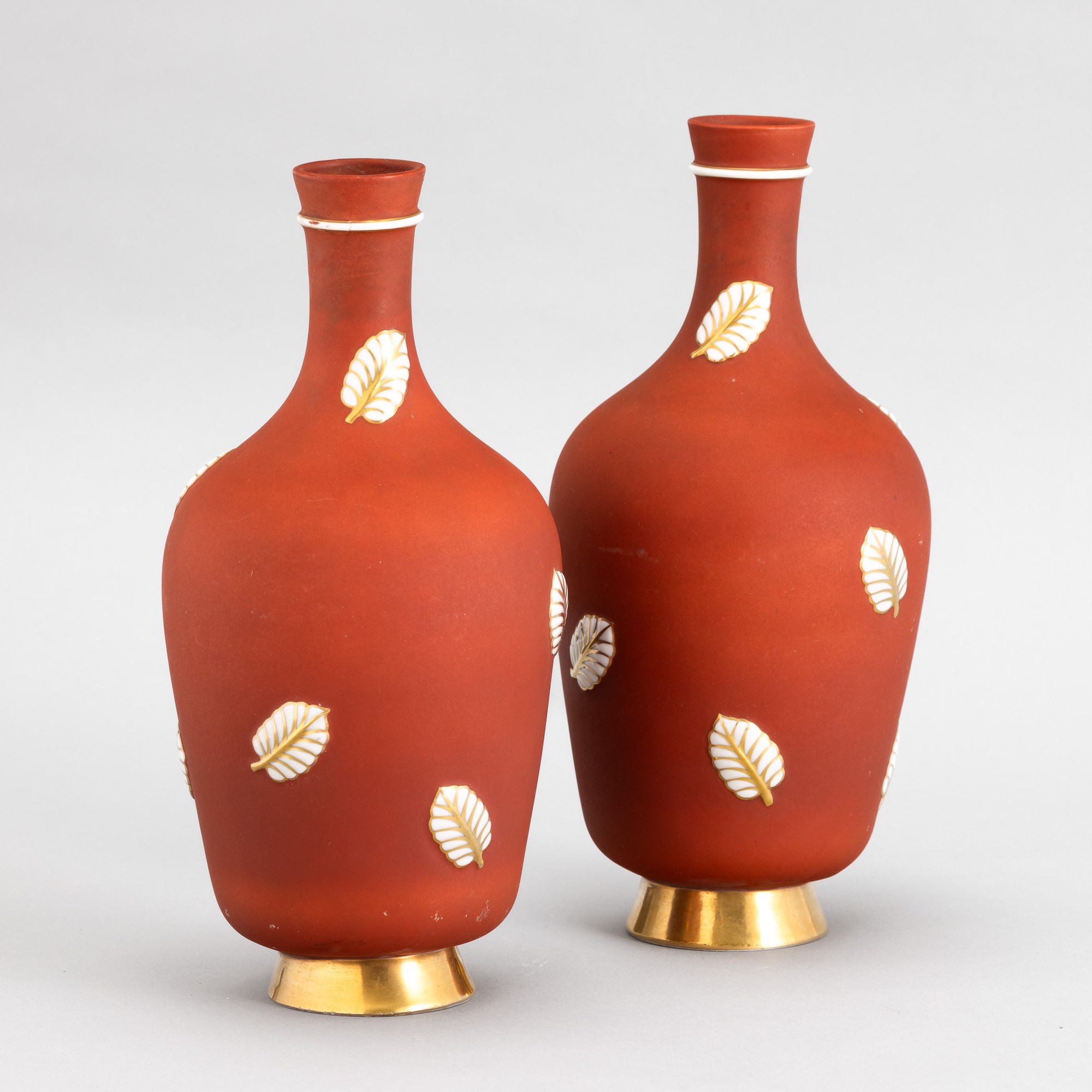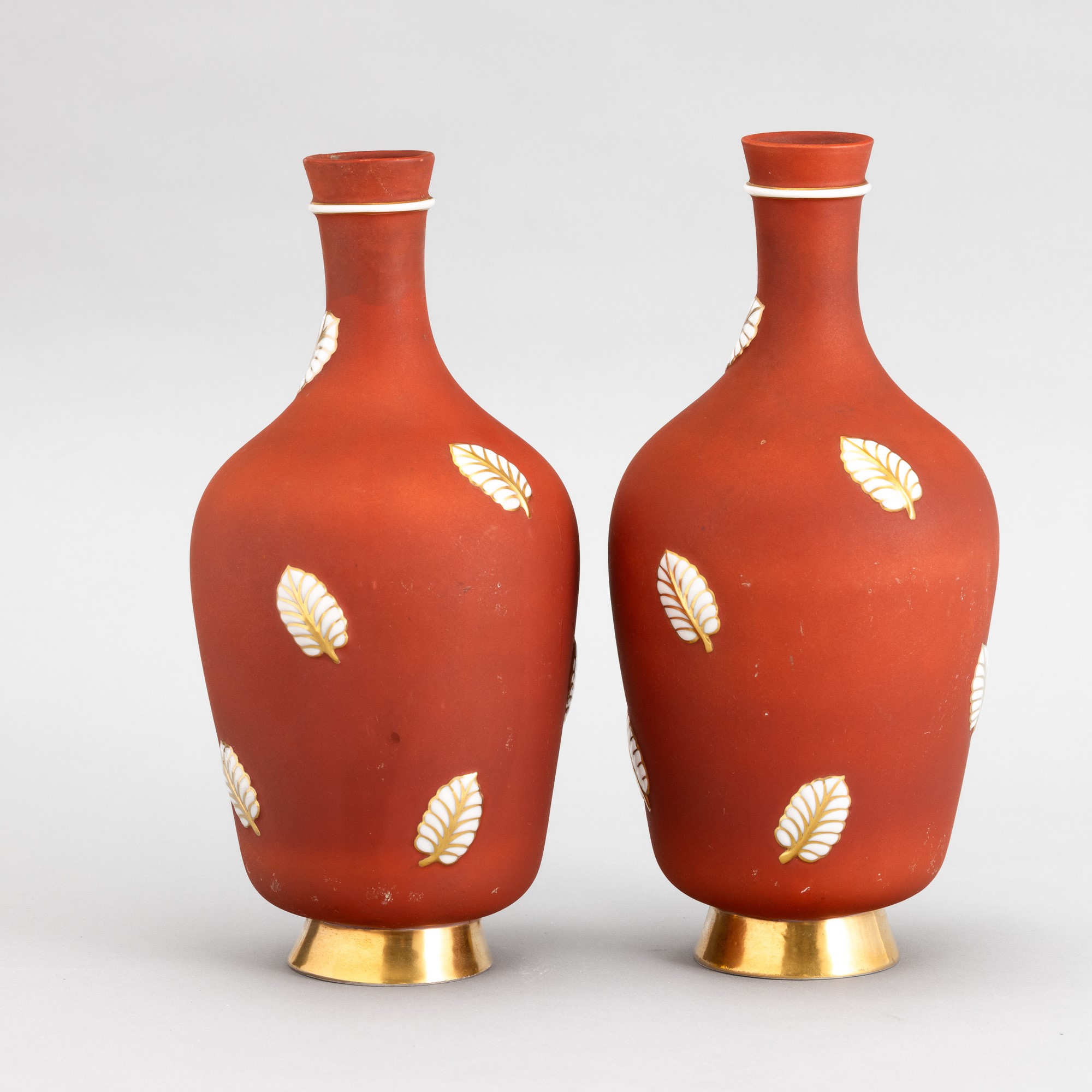 Two porcelain vases with an embossed decor of leaves. Manufacturer's mark. Restored parts