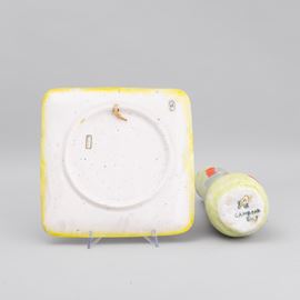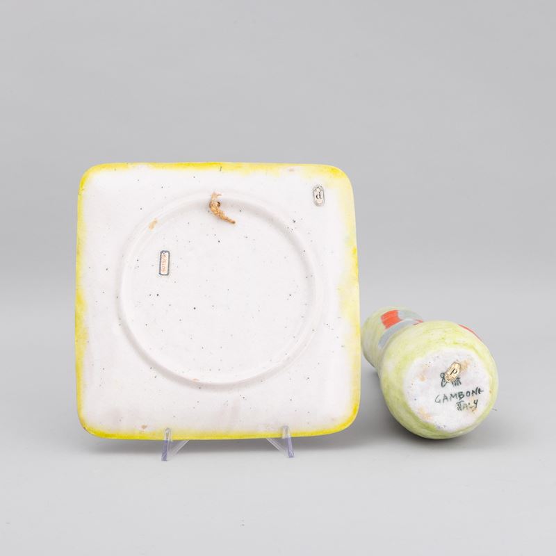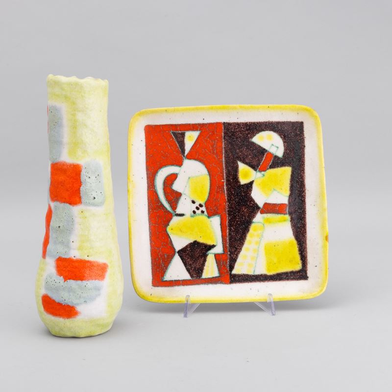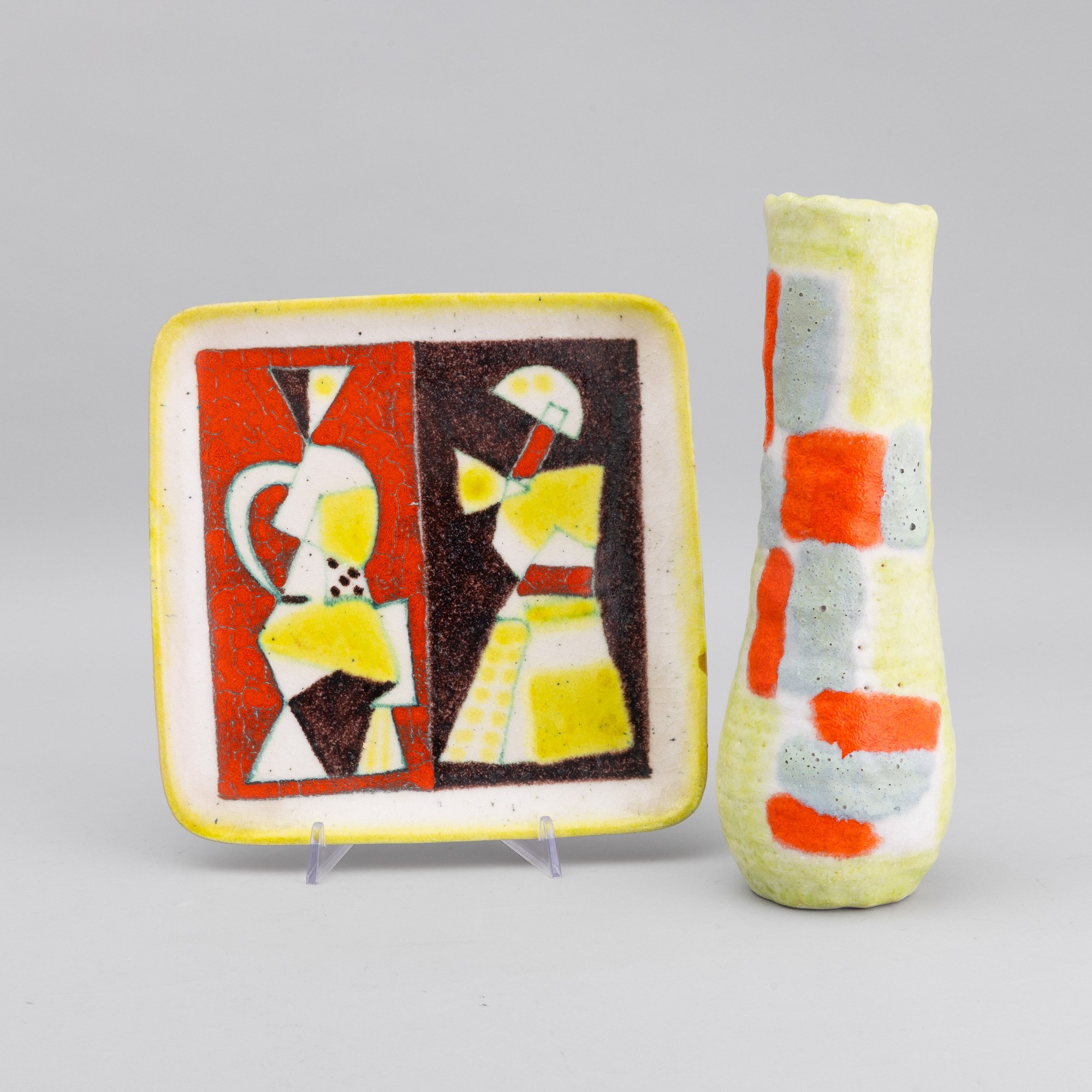 A vase and a tray in glazed ceramic with a polychrome enamel geometric decor. Author's signature