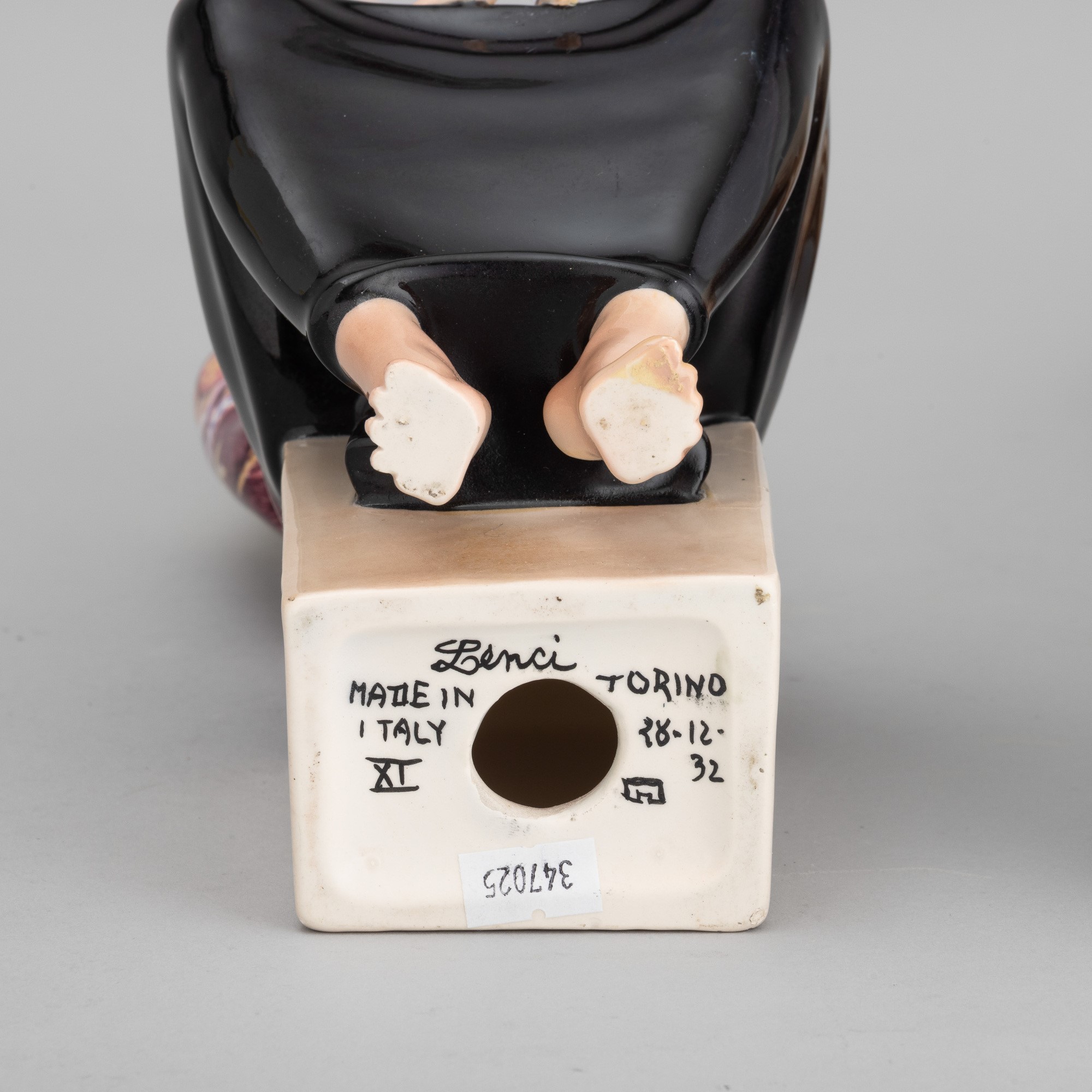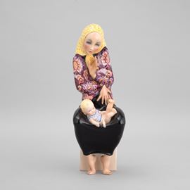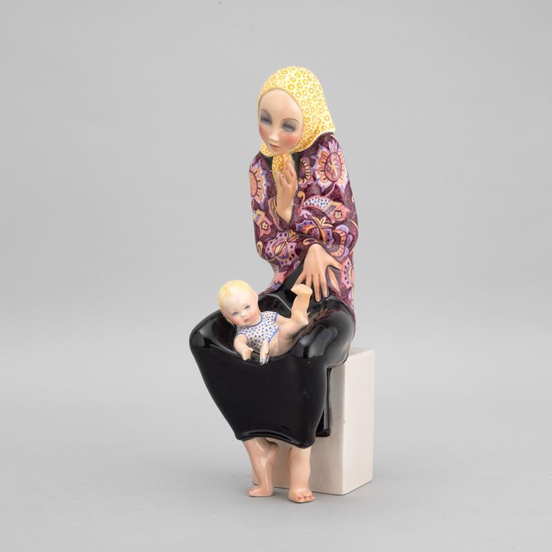 A slip-cast earthenware figure of a mother and child with a polychrome decor. Manufacturer's mark, date on the base and stamped signature. Minor defects and restored parts