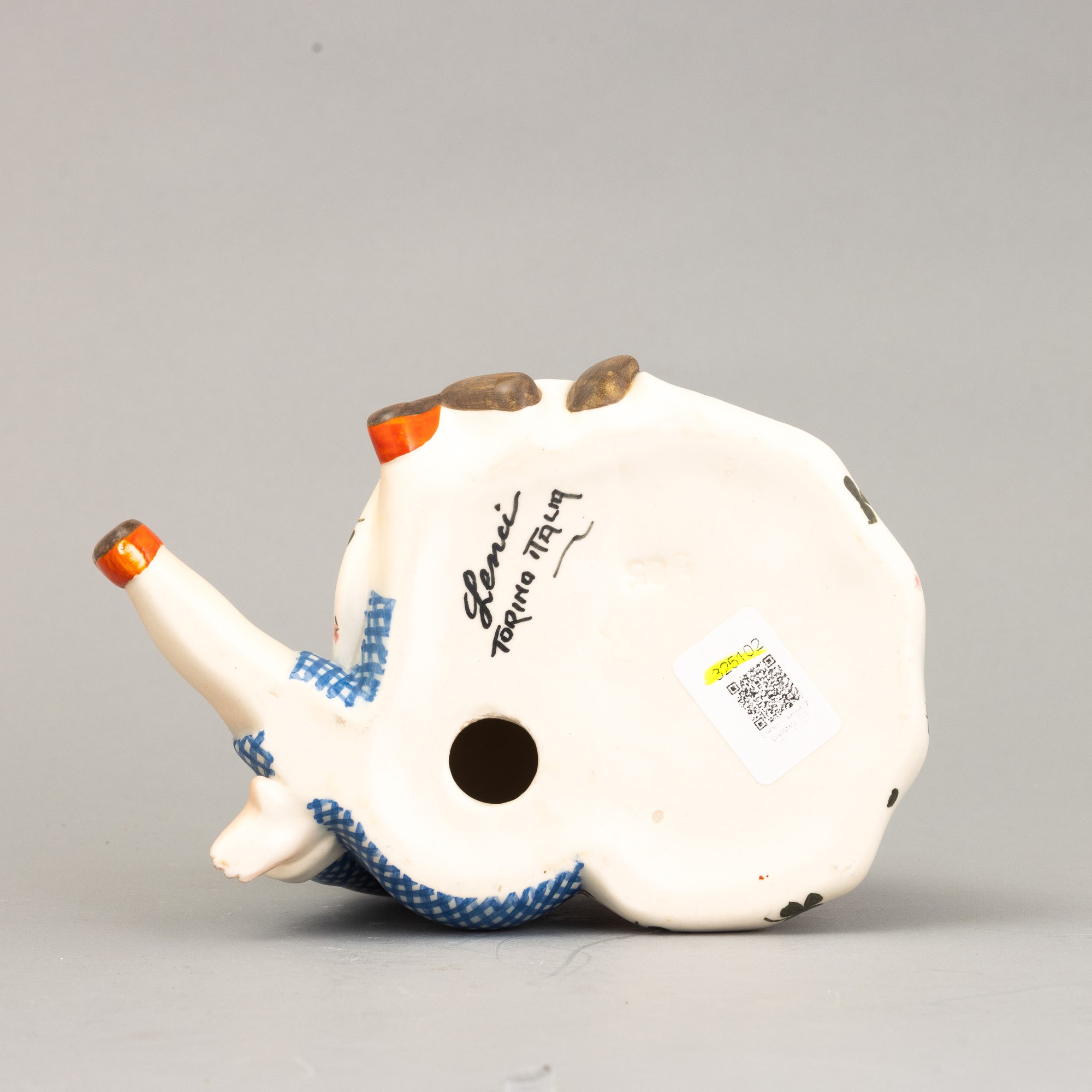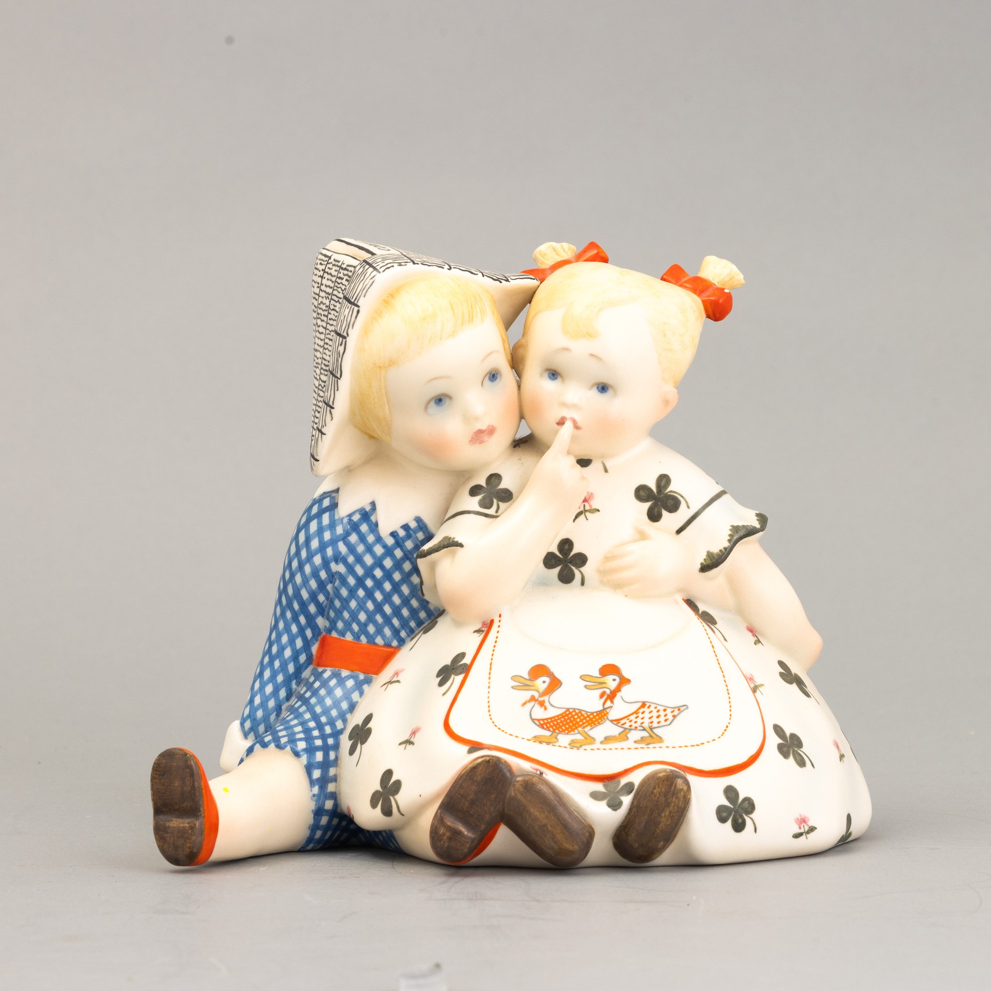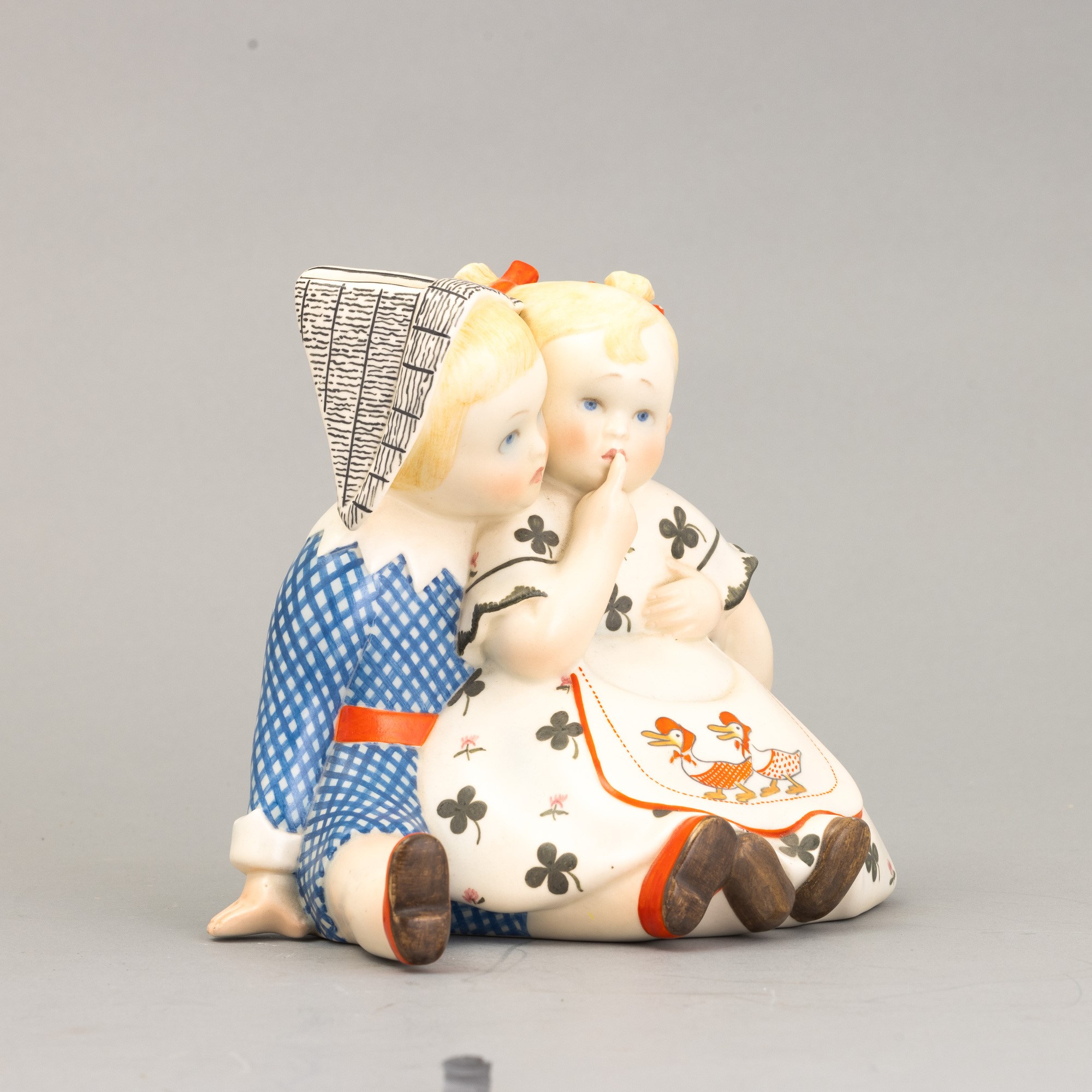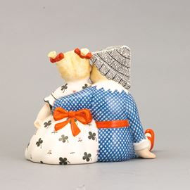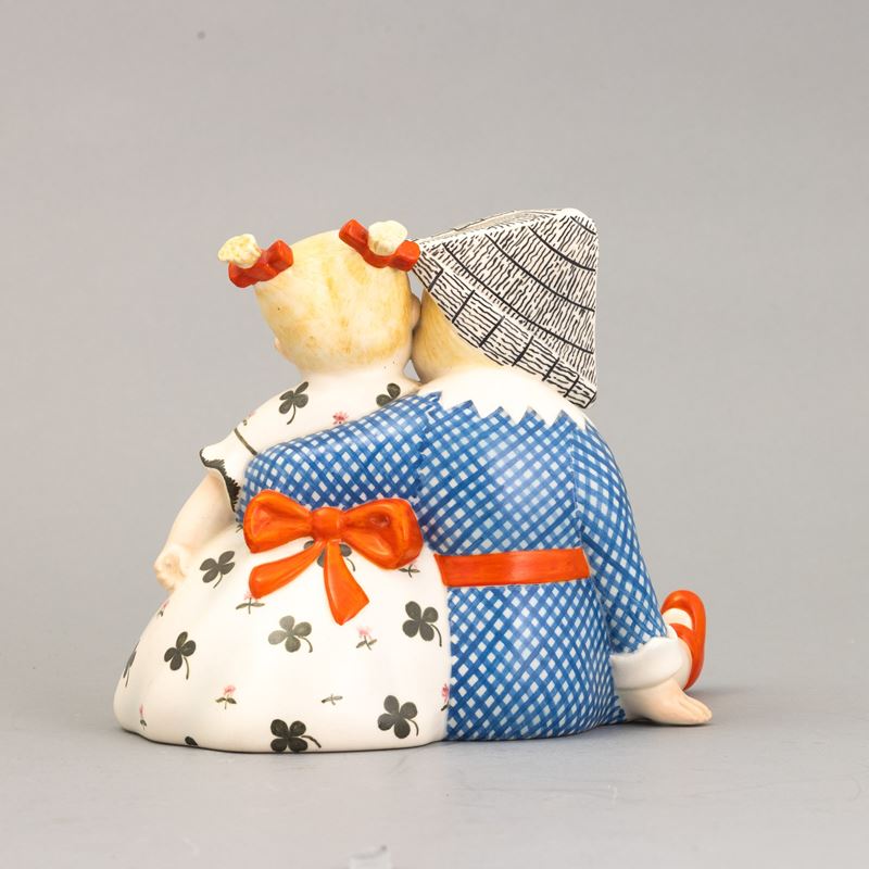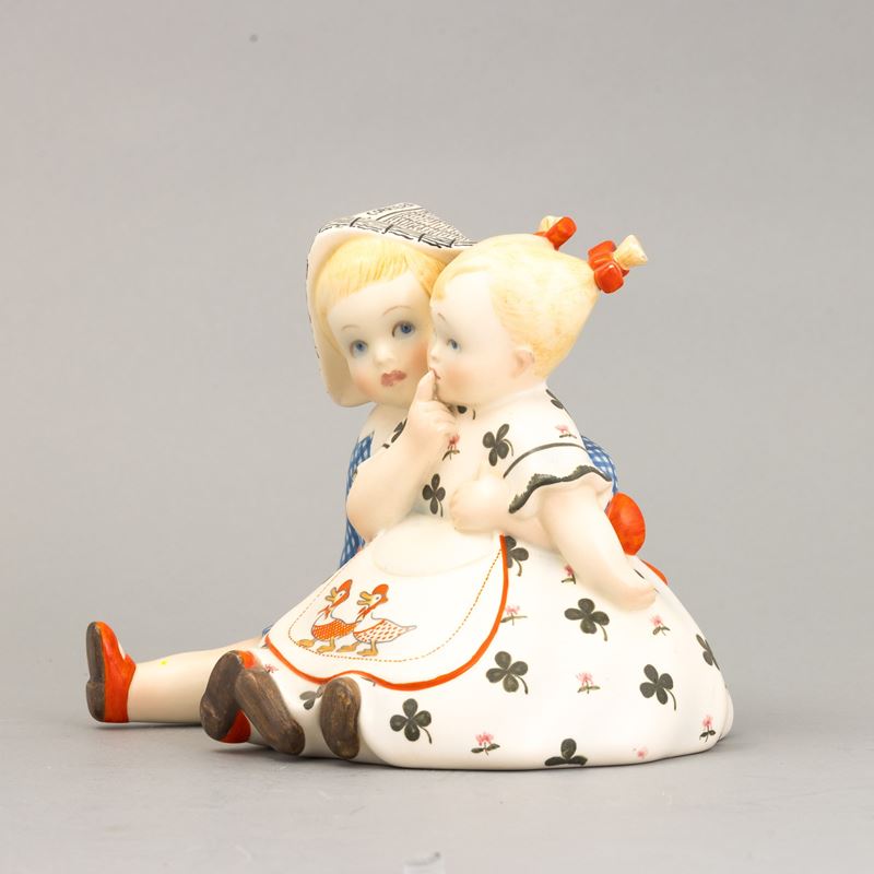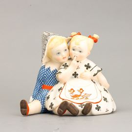 A slip-cast earthenware sculpture of two children with a polychrome decor. Manufacturer's mark