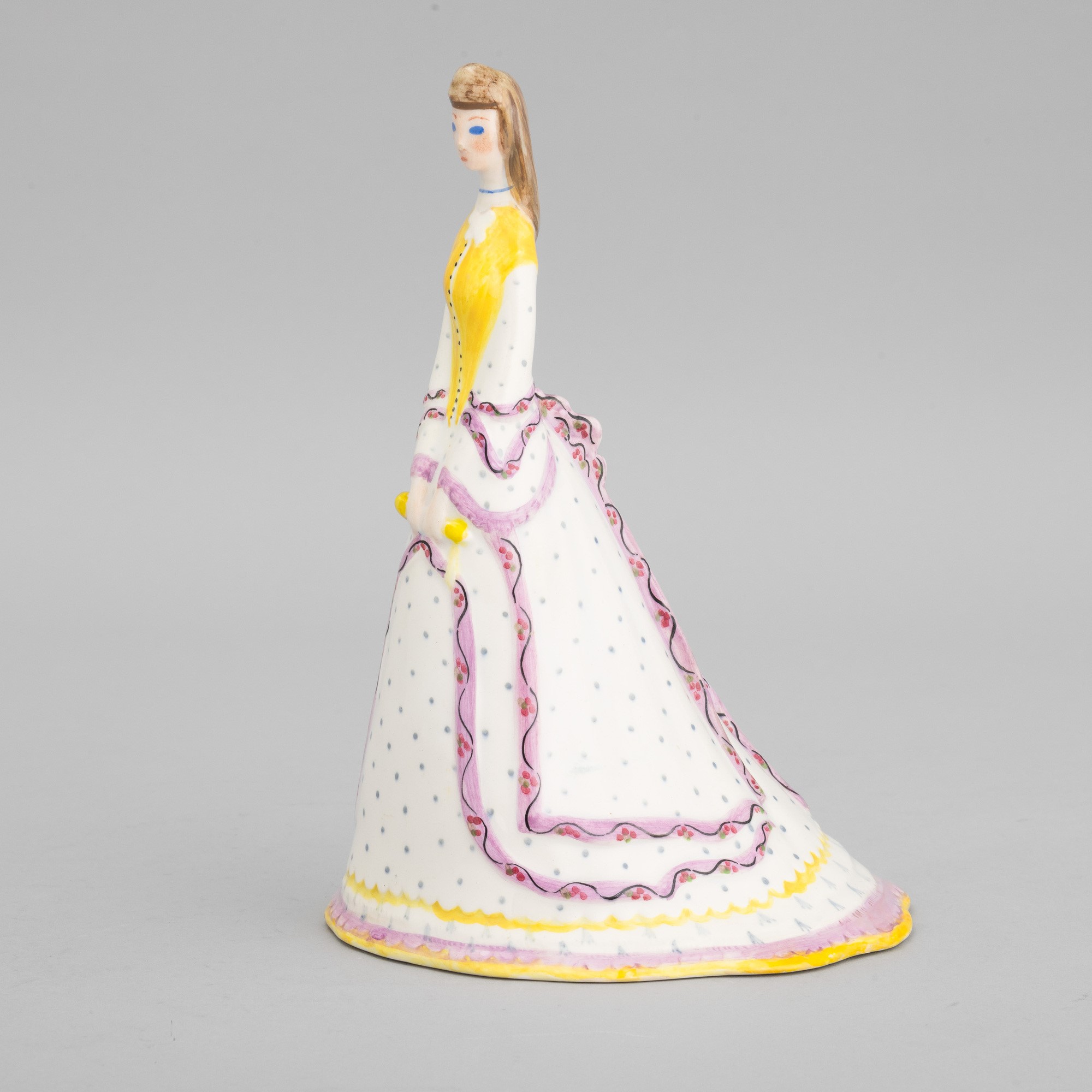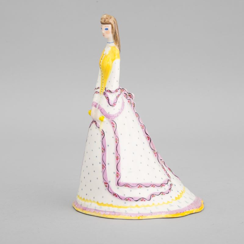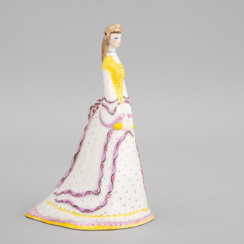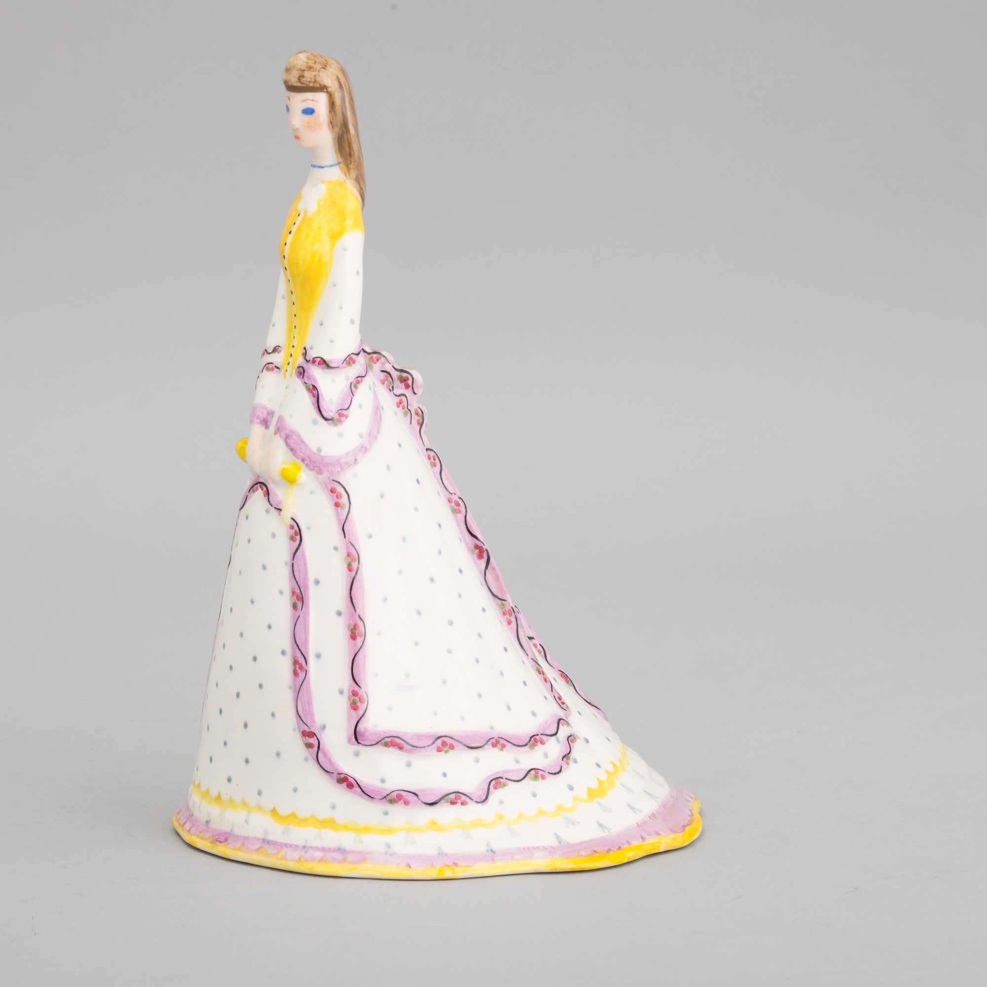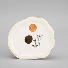 A slip-cast earthenware figurine with a polychrome decor. Author's signature, manufacturer's mark, old label and date
