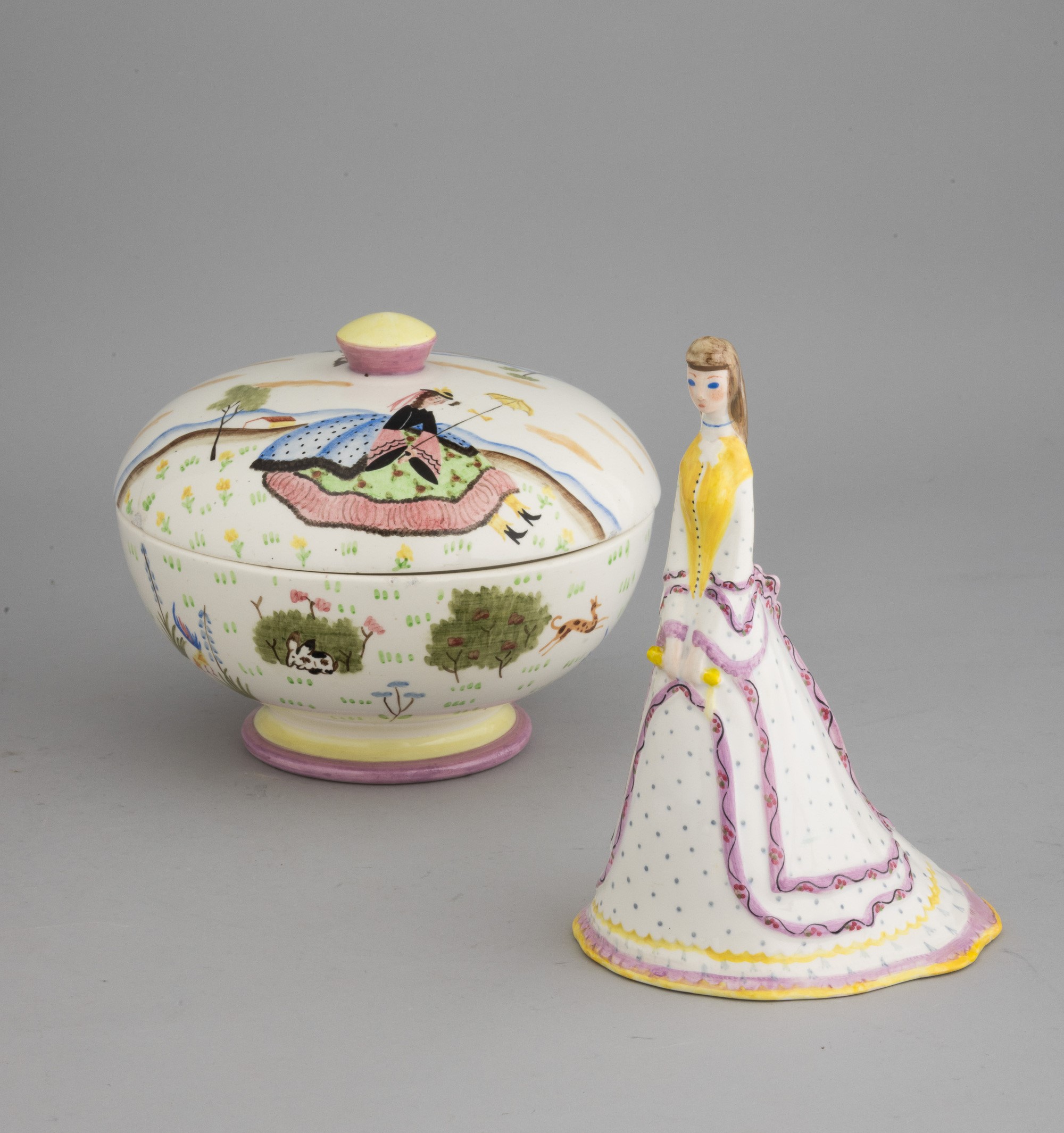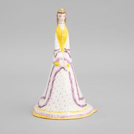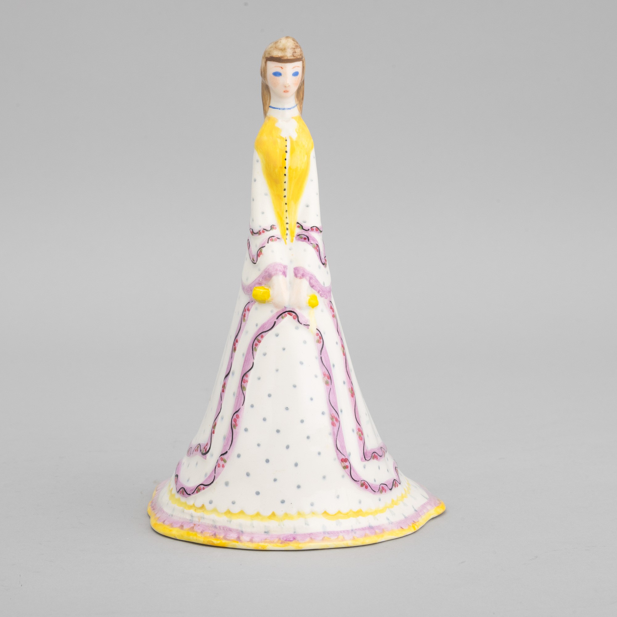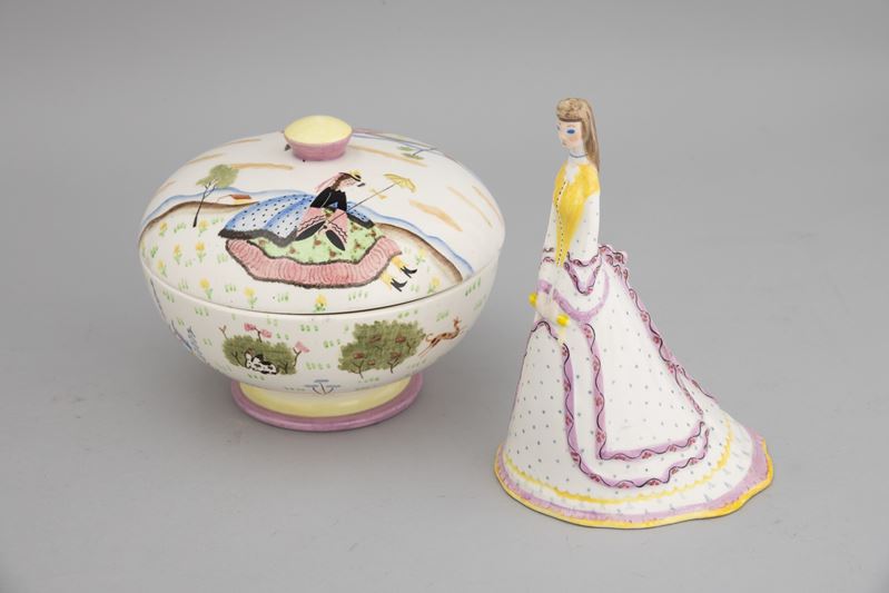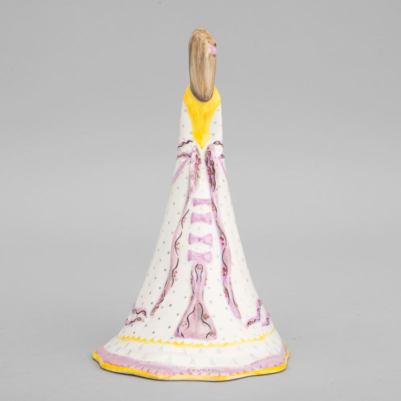 A slip-cast earthenware figurine with a polychrome decor. Author's signature, manufacturer's mark, old label and date