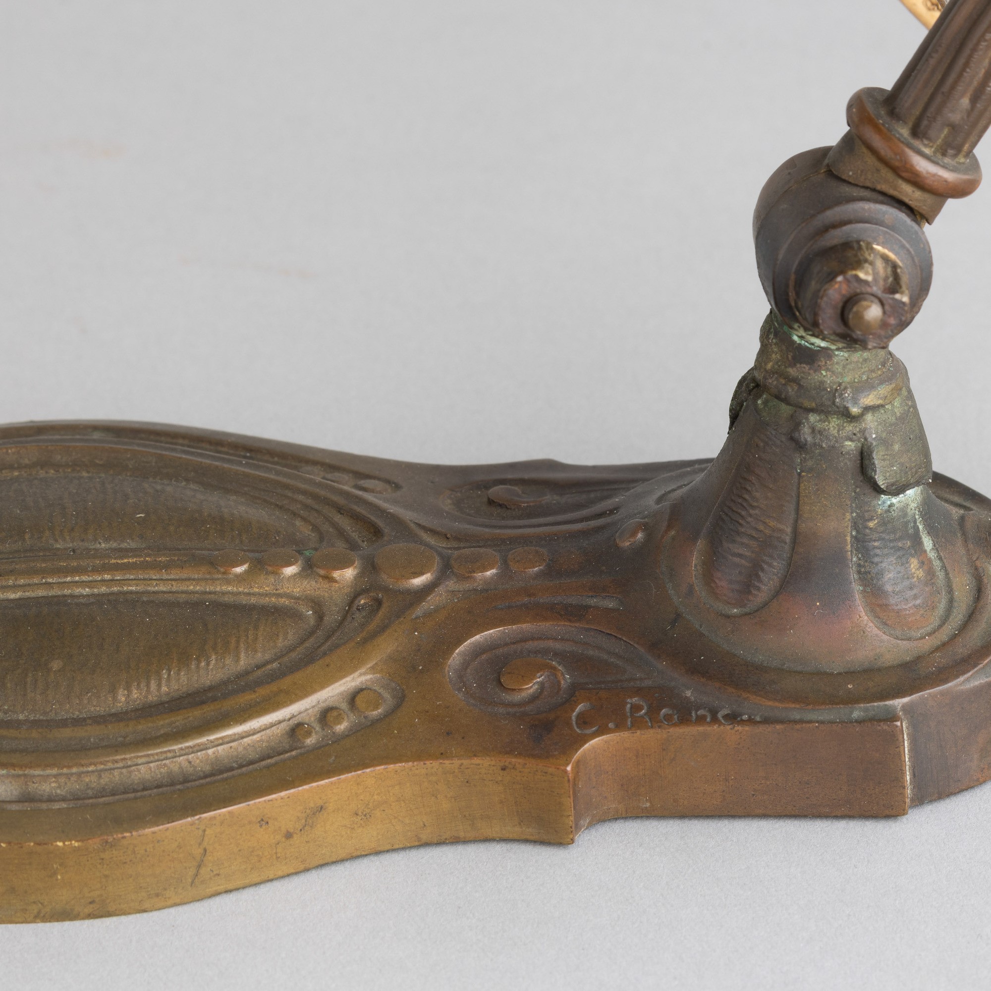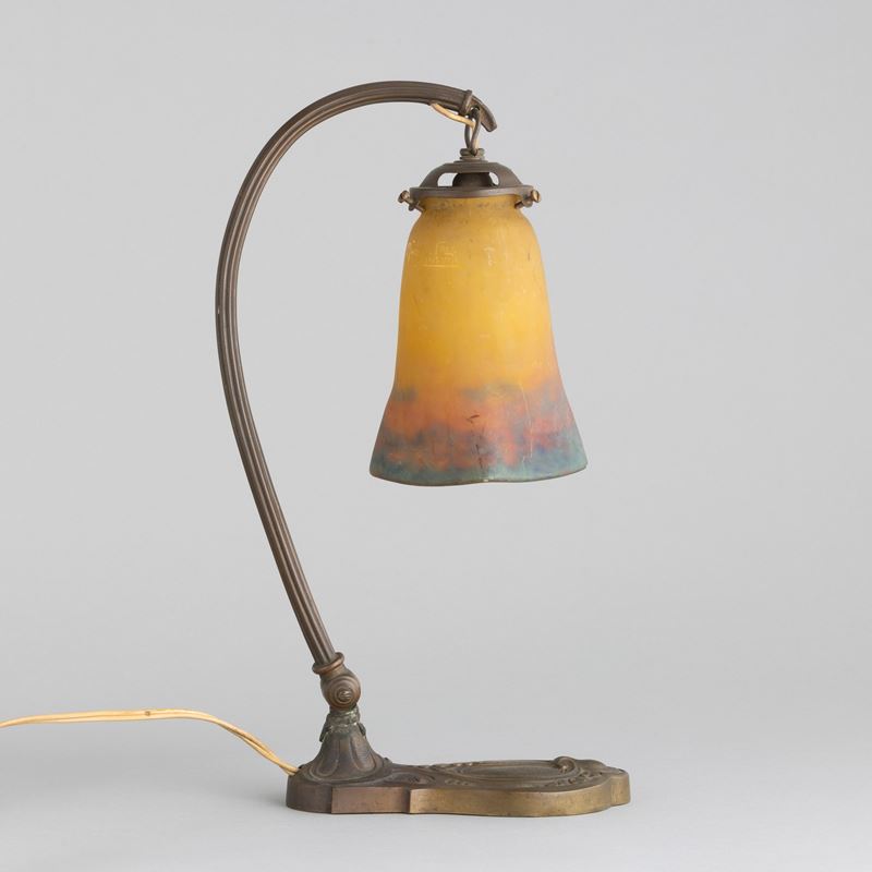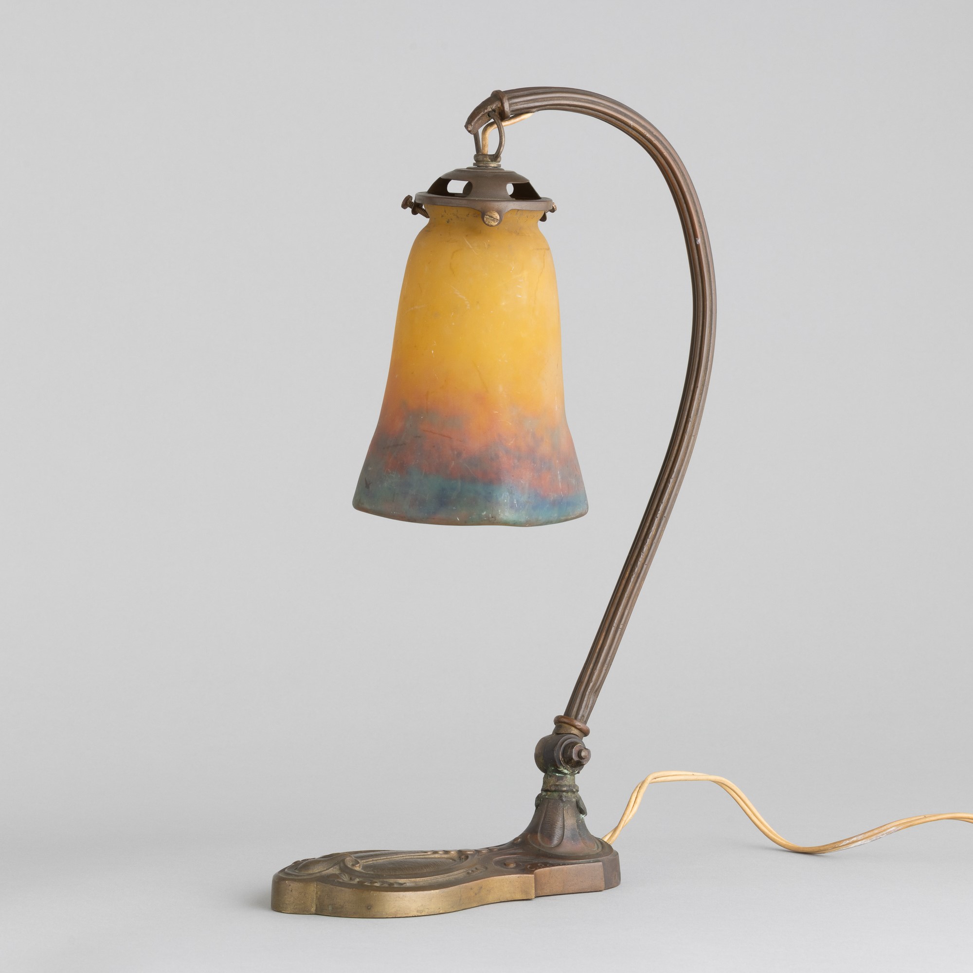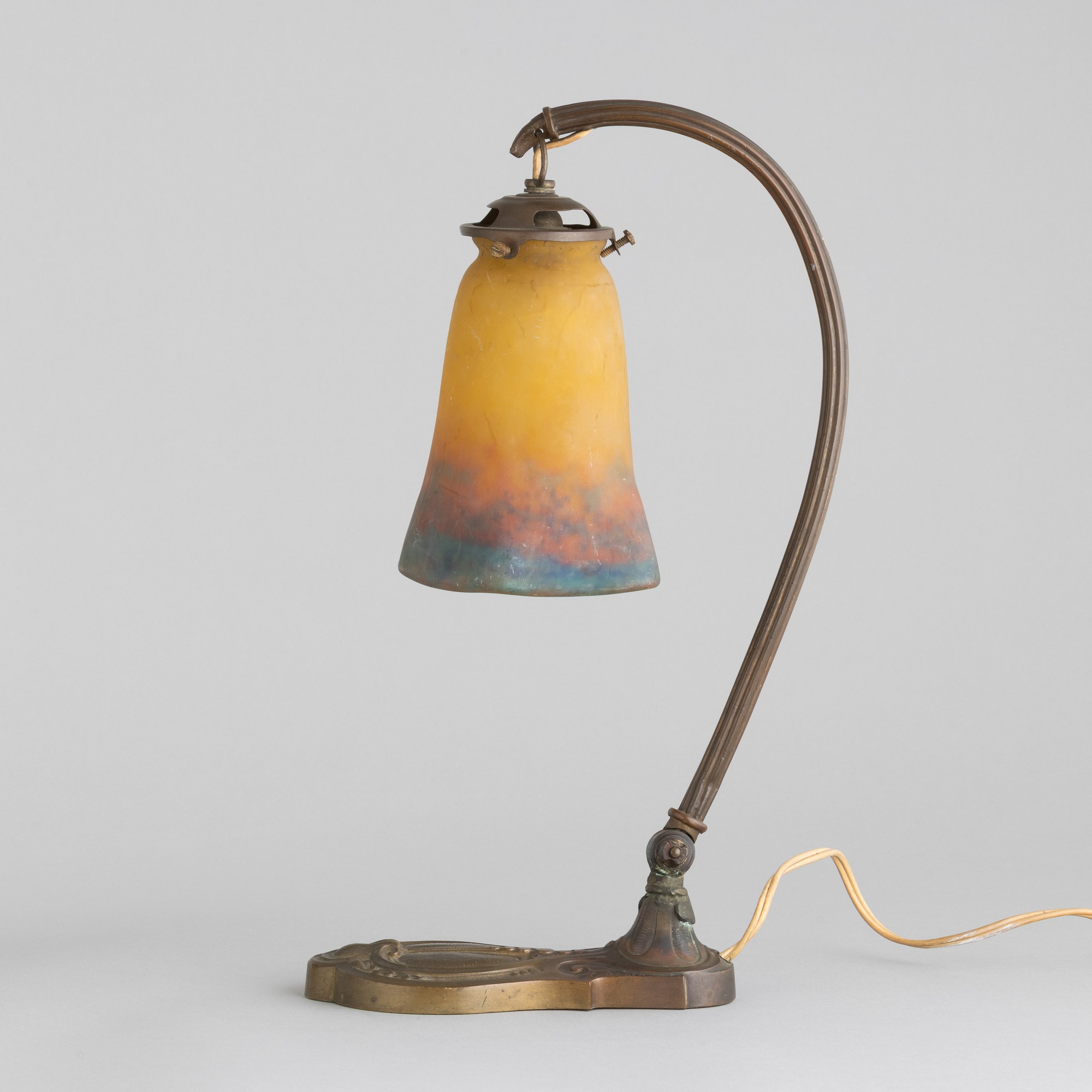 A brass swing-arm desk lamp with a polychrome glass paste diffuser. Sanded signature. Minor chippings