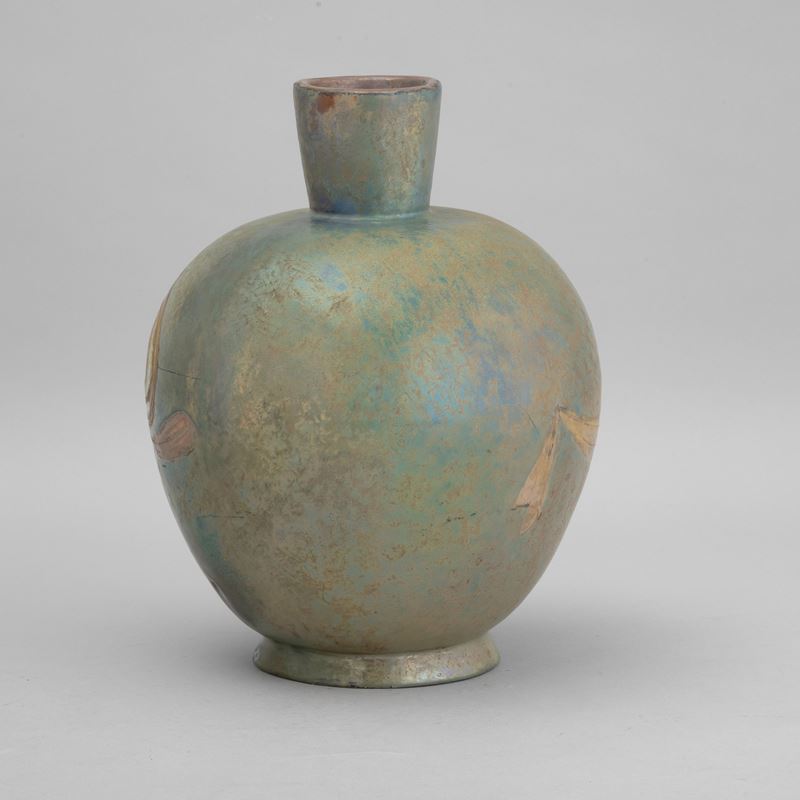 A majolica-tiled terracotta vase with a floral decor. Signed Melandri 1939