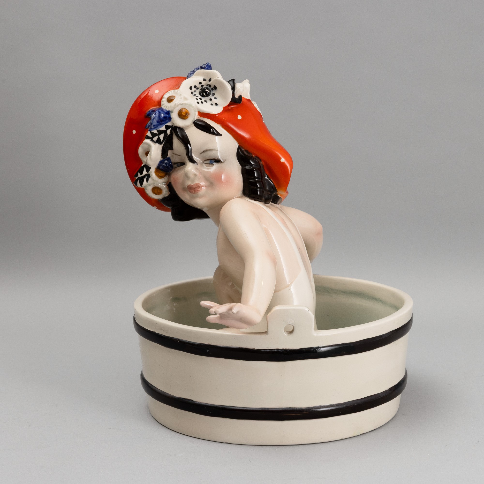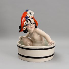 A slip-cast earthenware figurine with a polychrome decor. Manufacturer's mark. Small restored parts