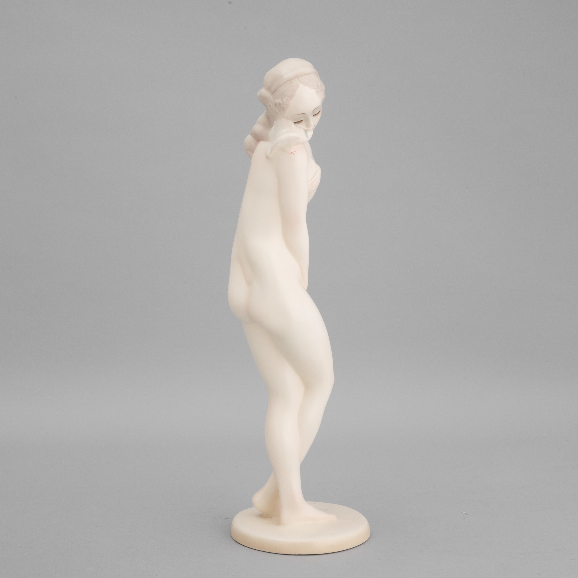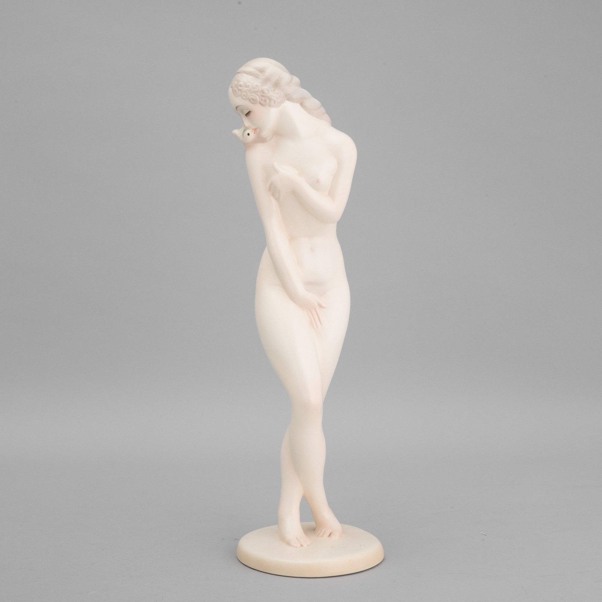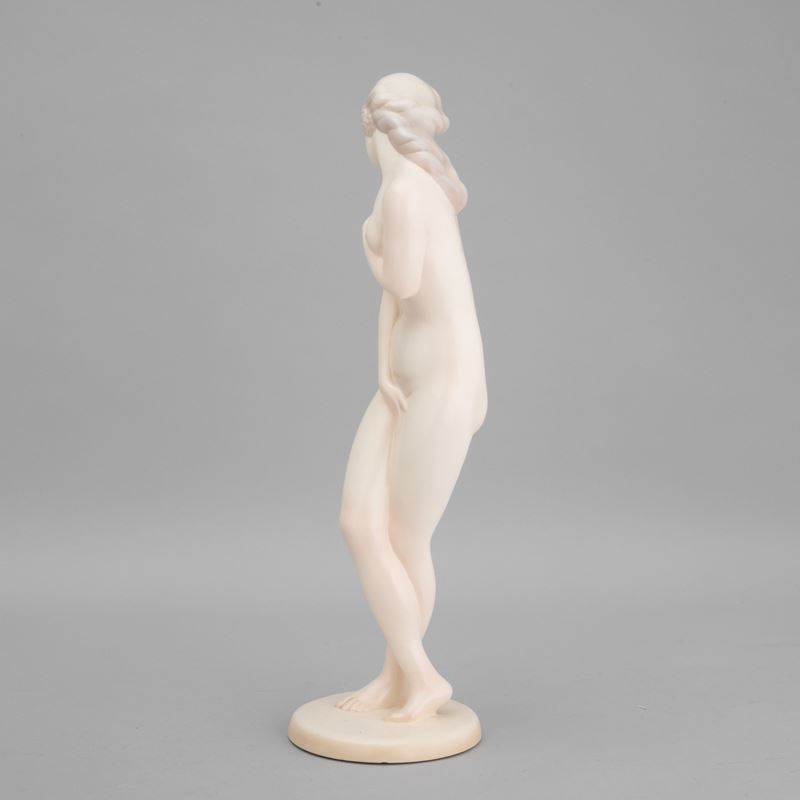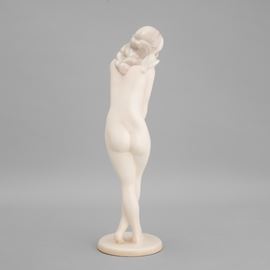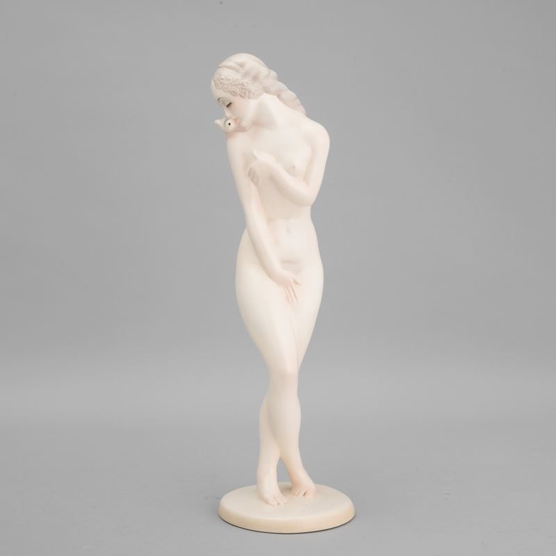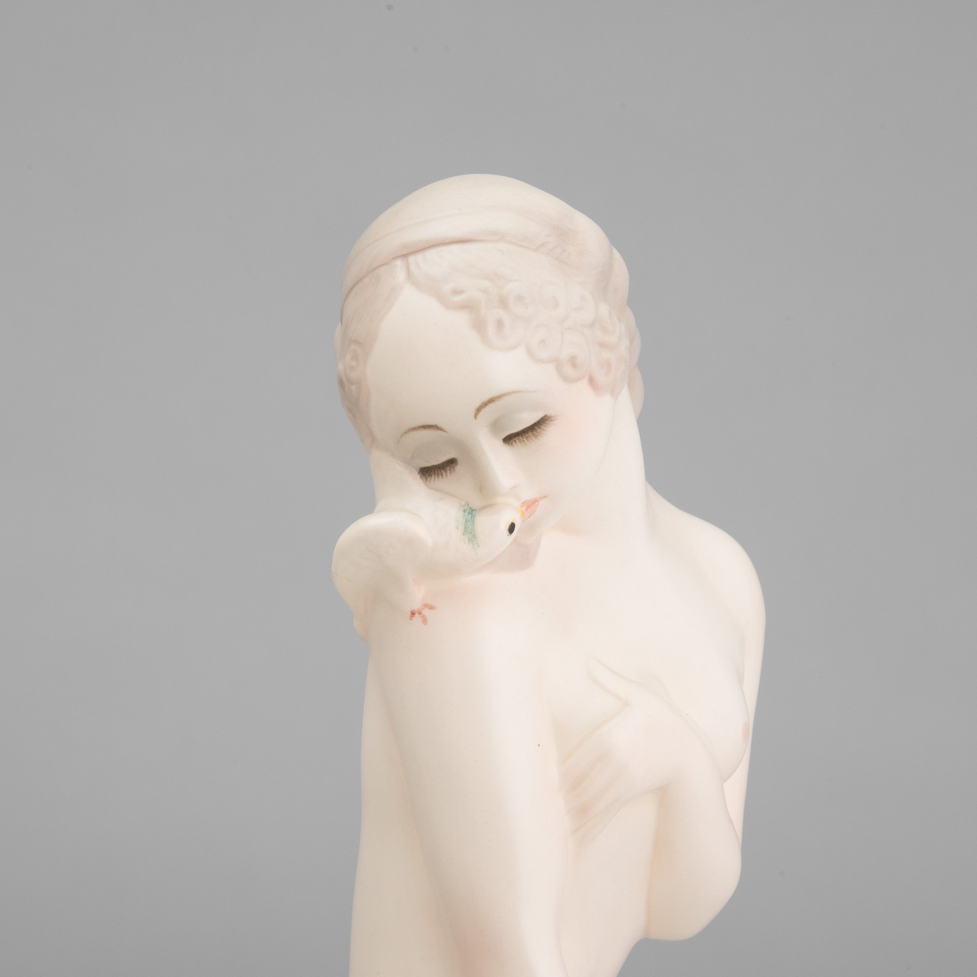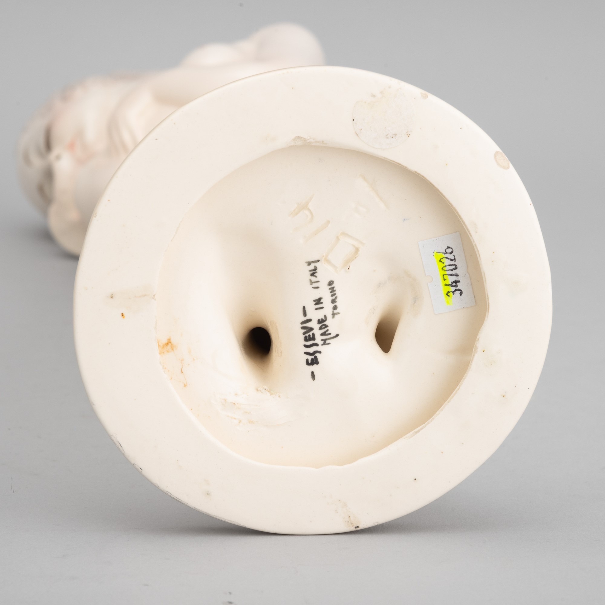A slip-cast earthenware sculpture with a light polychrome decor. Manufacturer's mark