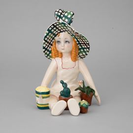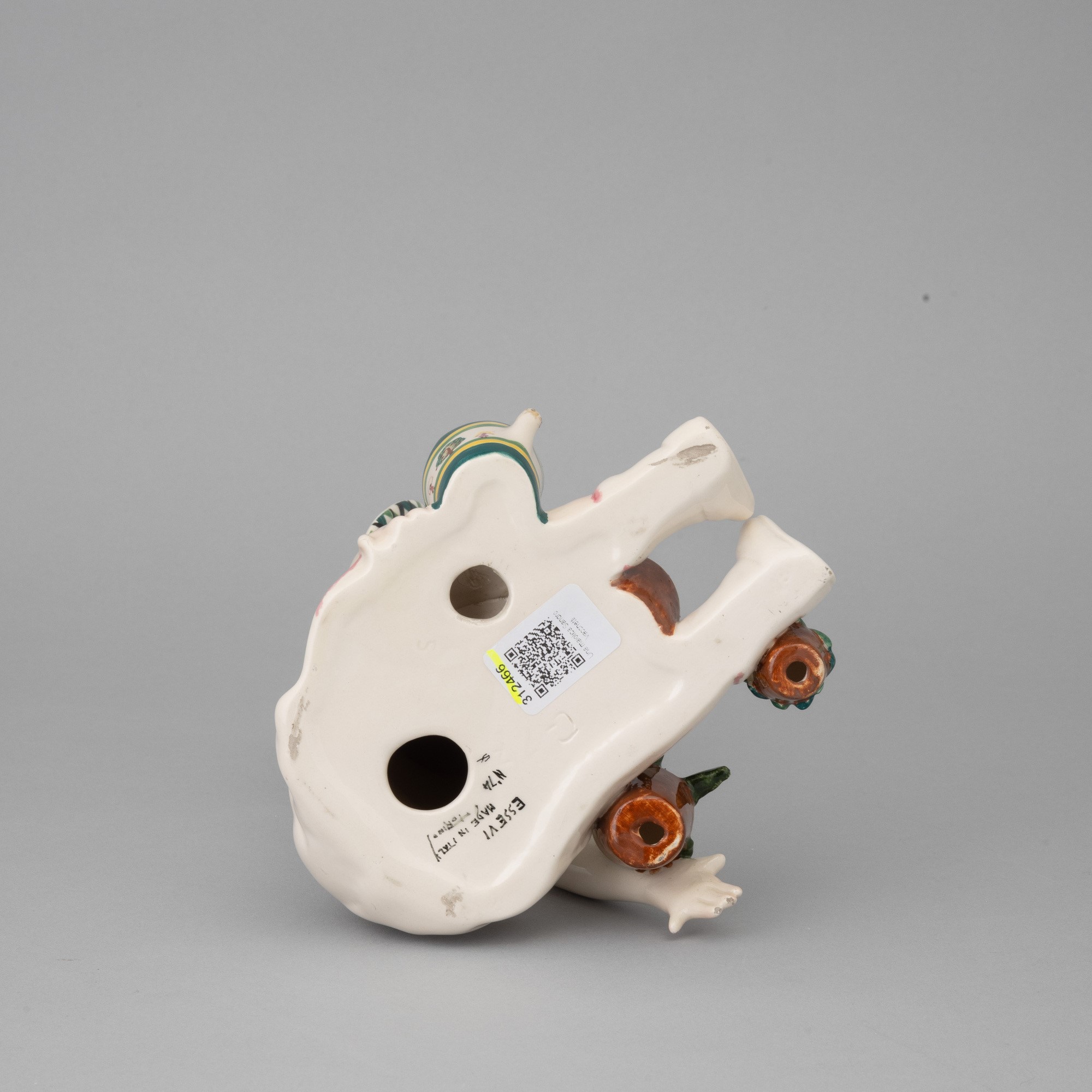 A slip-cast earthenware sculpture with a polychrome decor. Manufacturer's mark. Broken parts