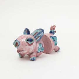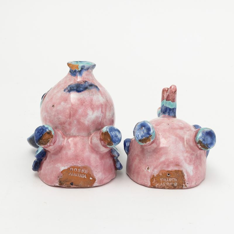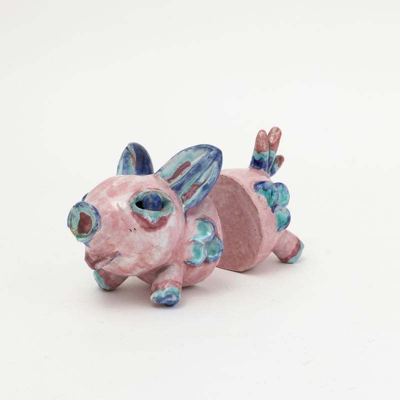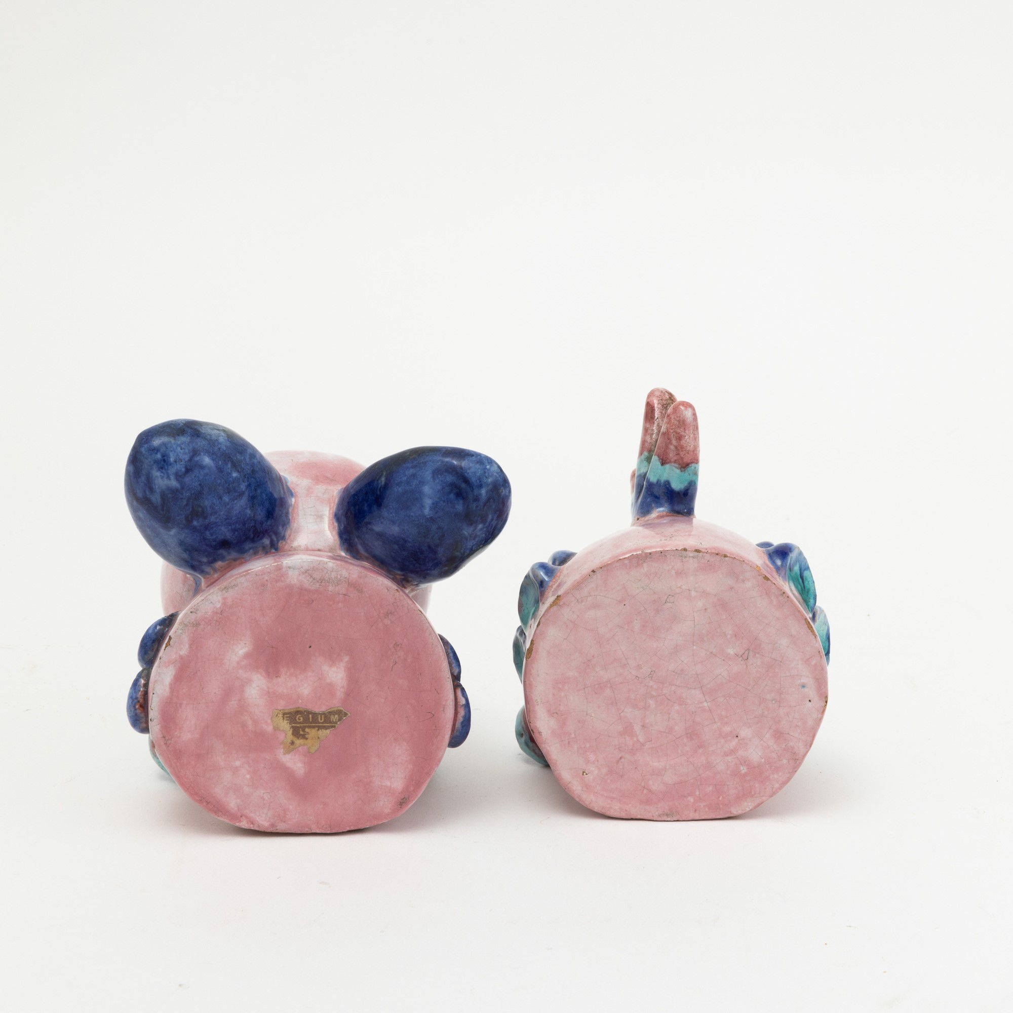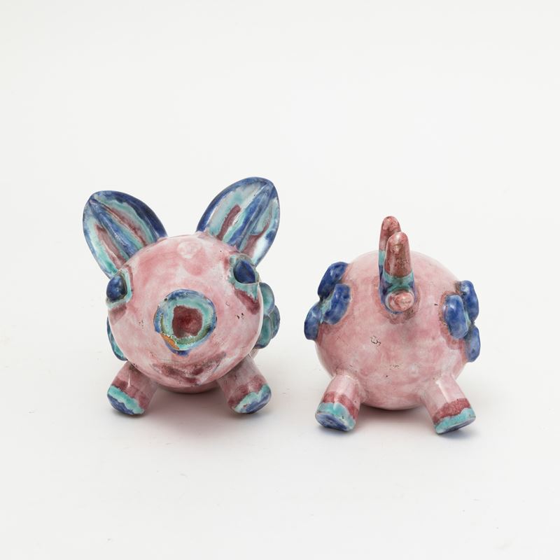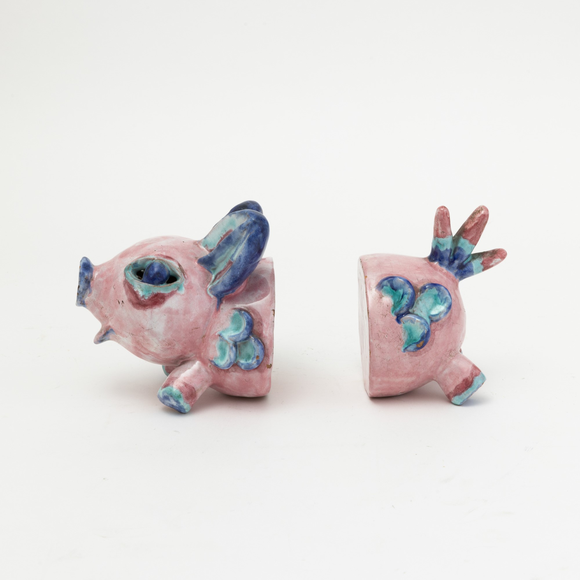 A majolica-tiled terracotta bookend in the shape of a pig. Stamped mark. Minor chipping