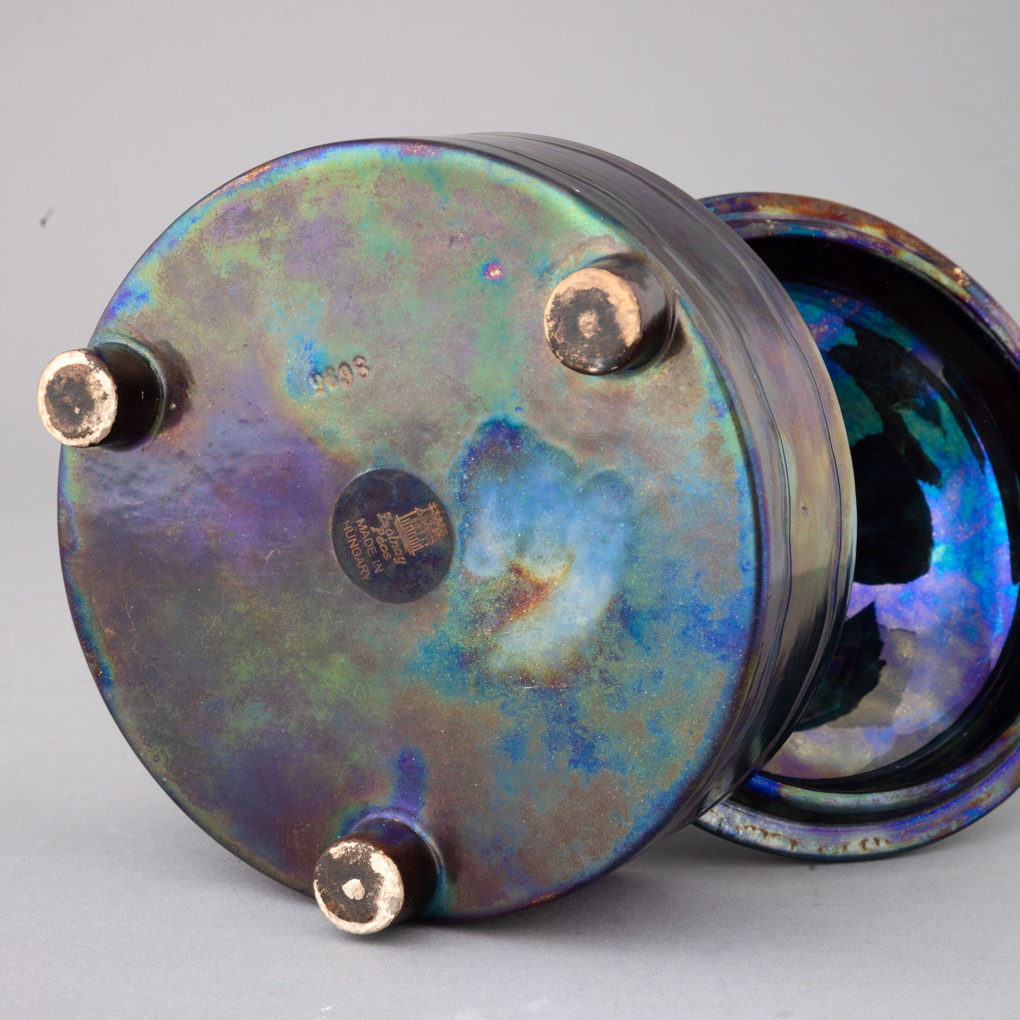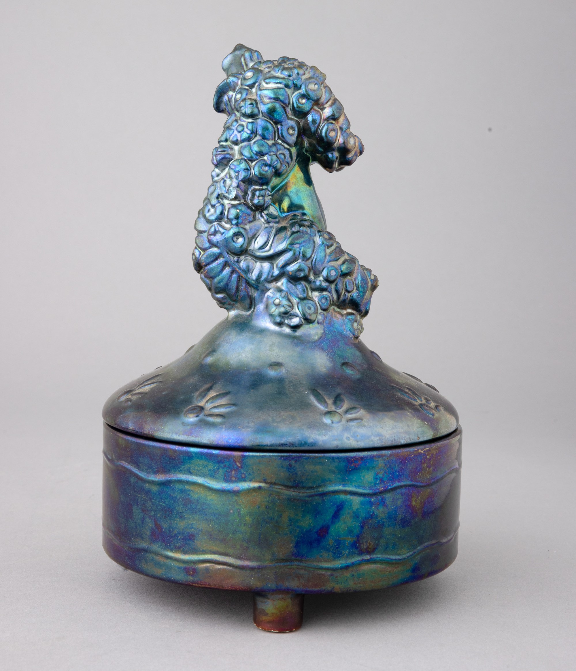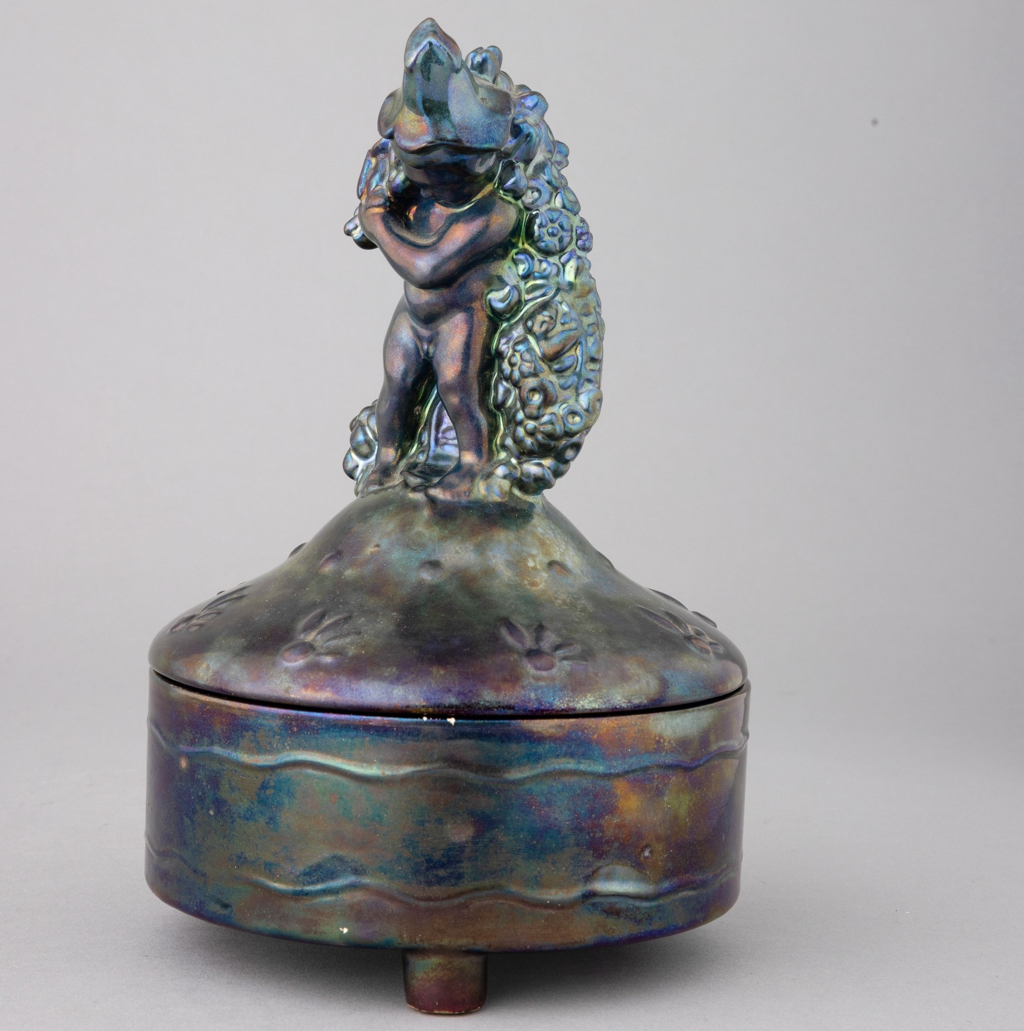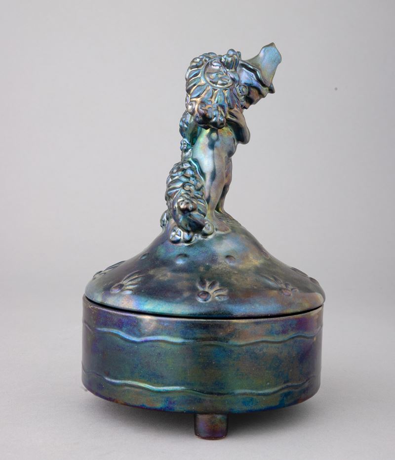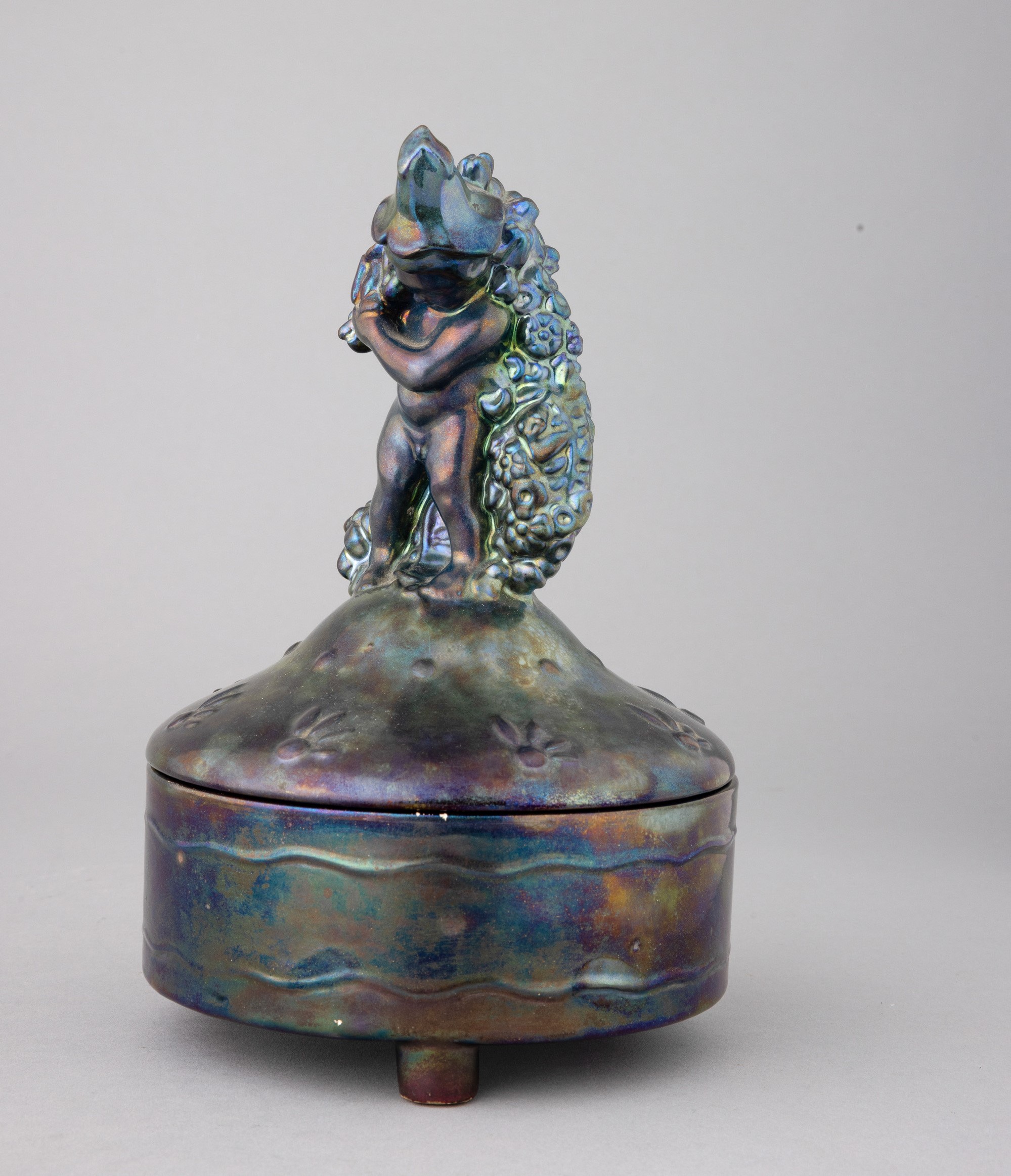 Box with lid, on cylindrical feet with putto decoration holding festoon of flowers. Surface entirely in lustruos blue- light blue.