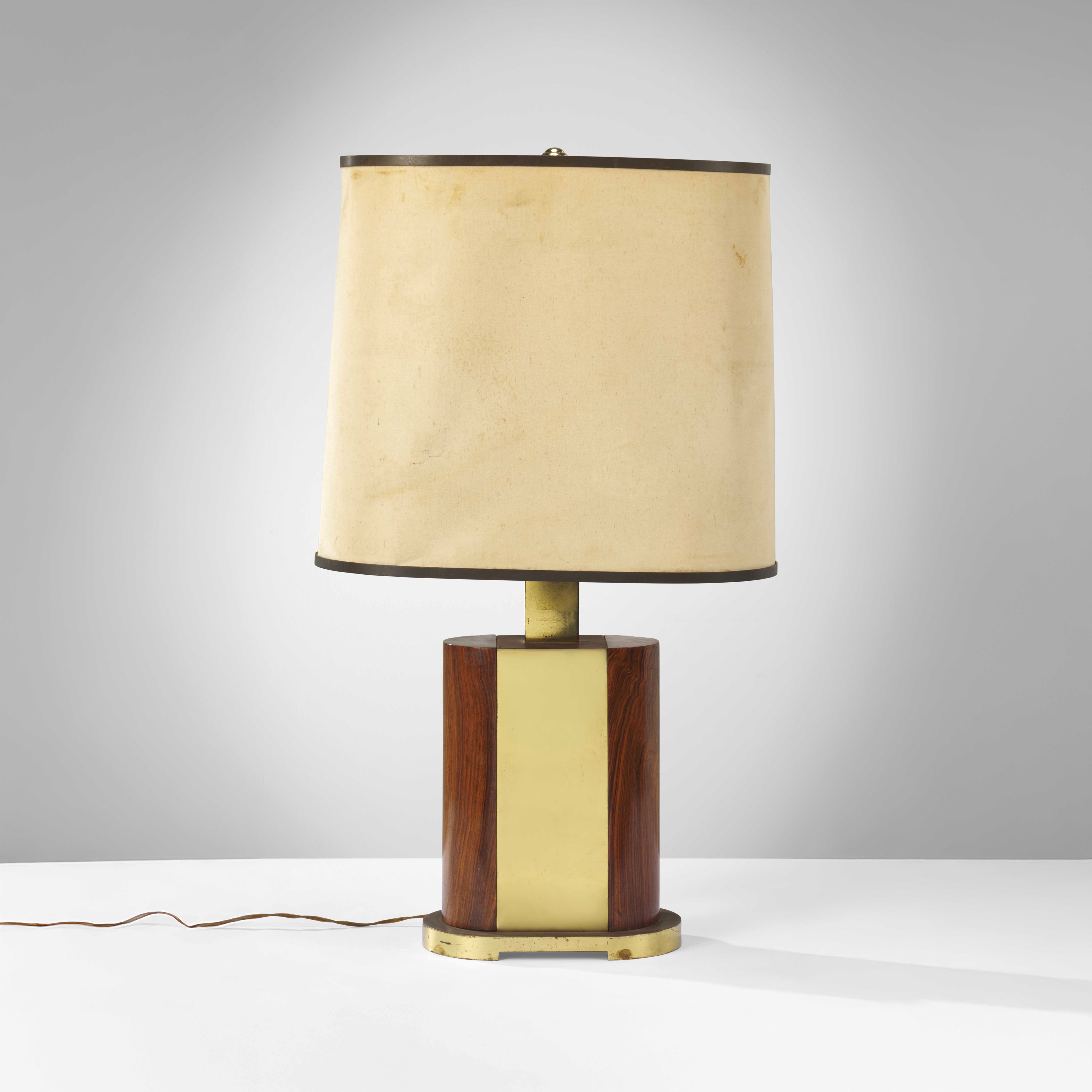 Wood and brass structure, fabric shade and metal details.