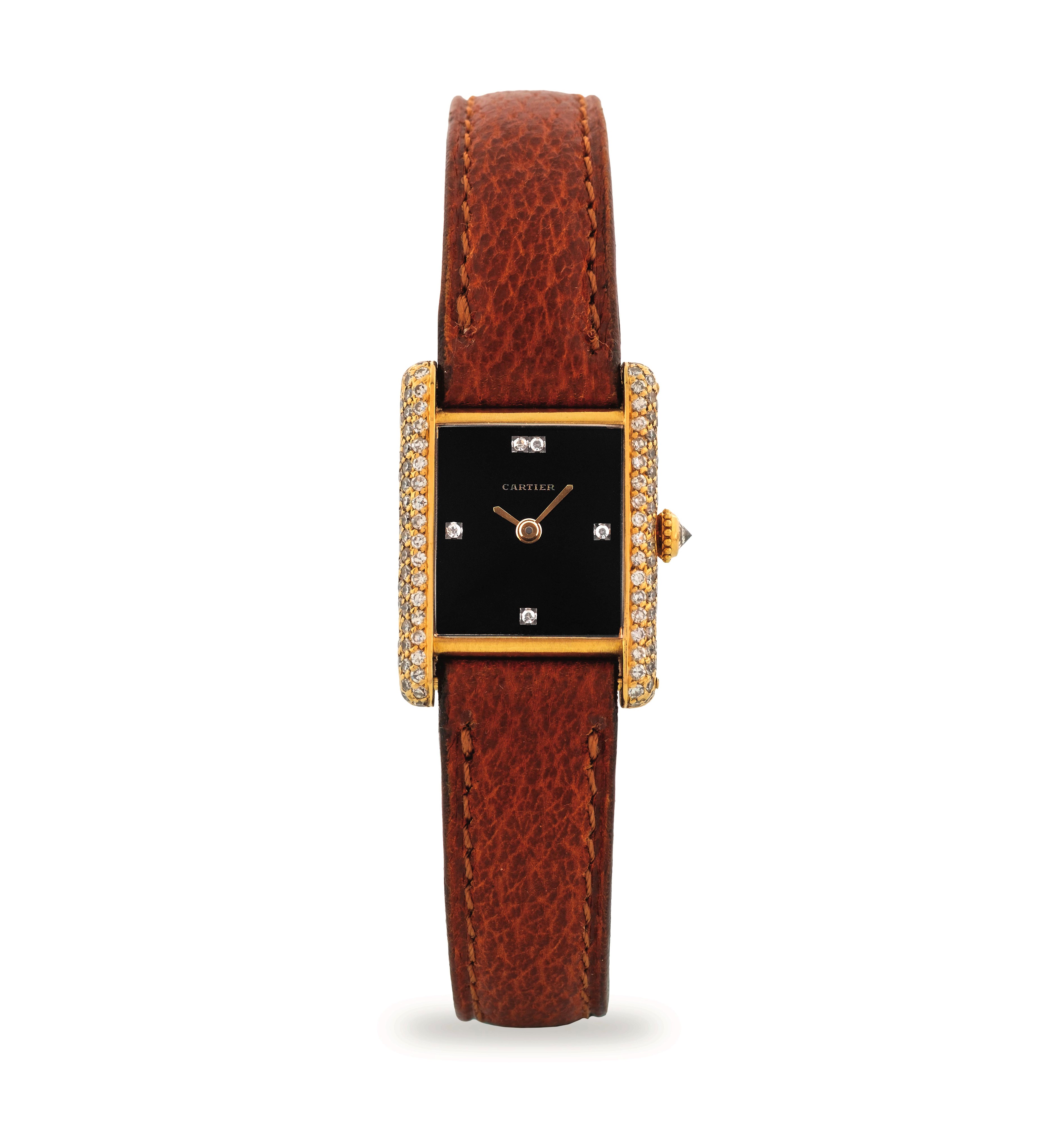 Tank Louis ref 78227 in yellow gold and diamonds, manual winding onyx dial with diamond hour markers, circa 1990