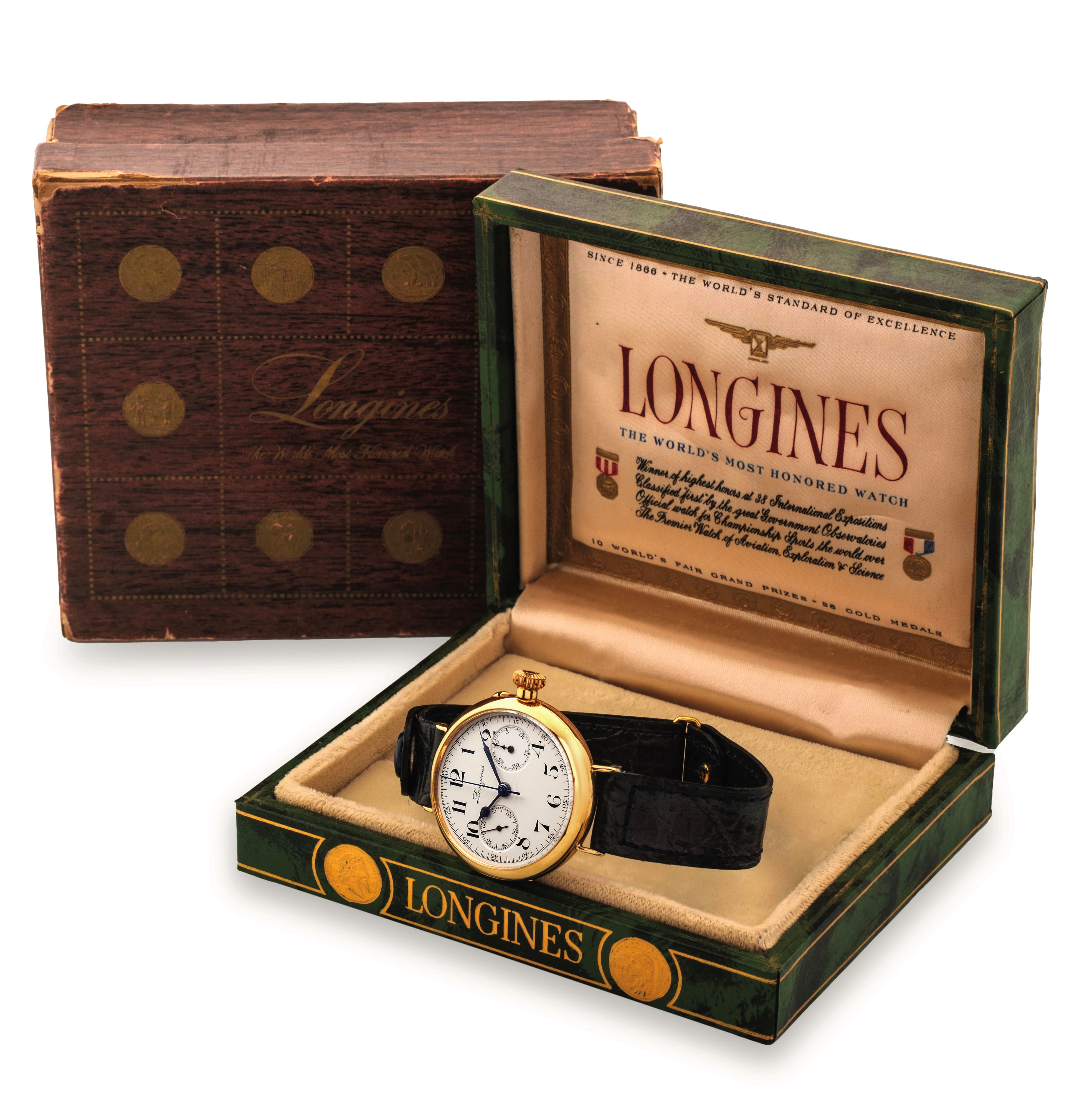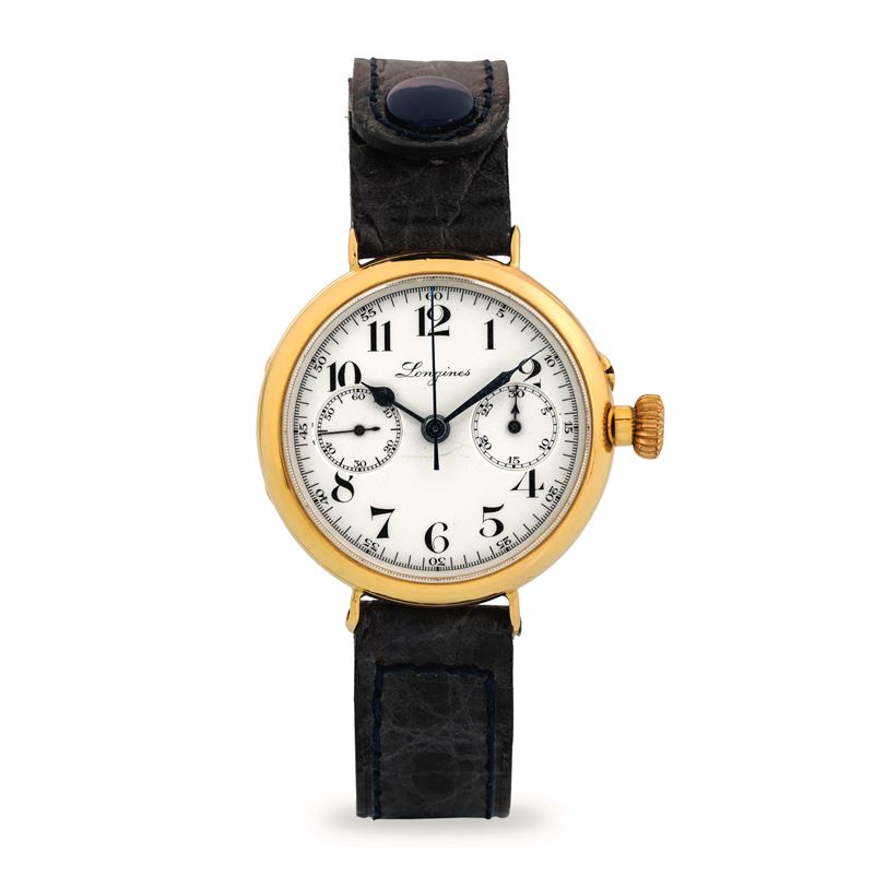 Single-pusher chronograph in crown, 18k yellow gold hinged case, white enamel dial with original box, circa 1925