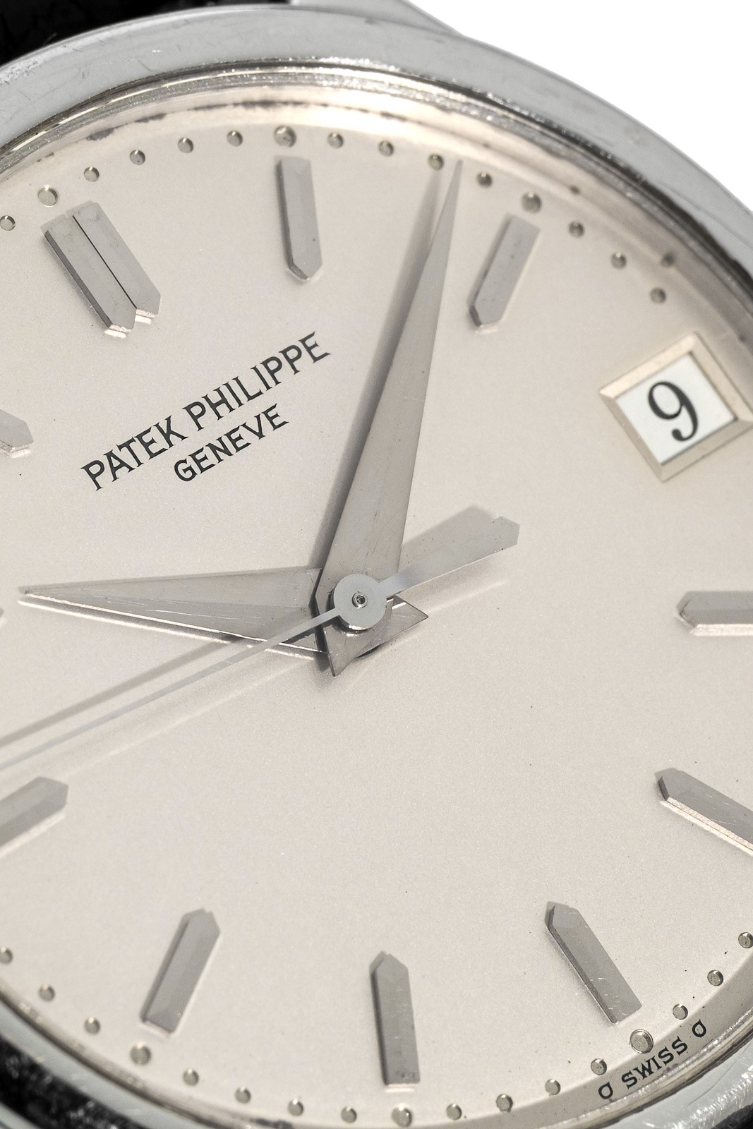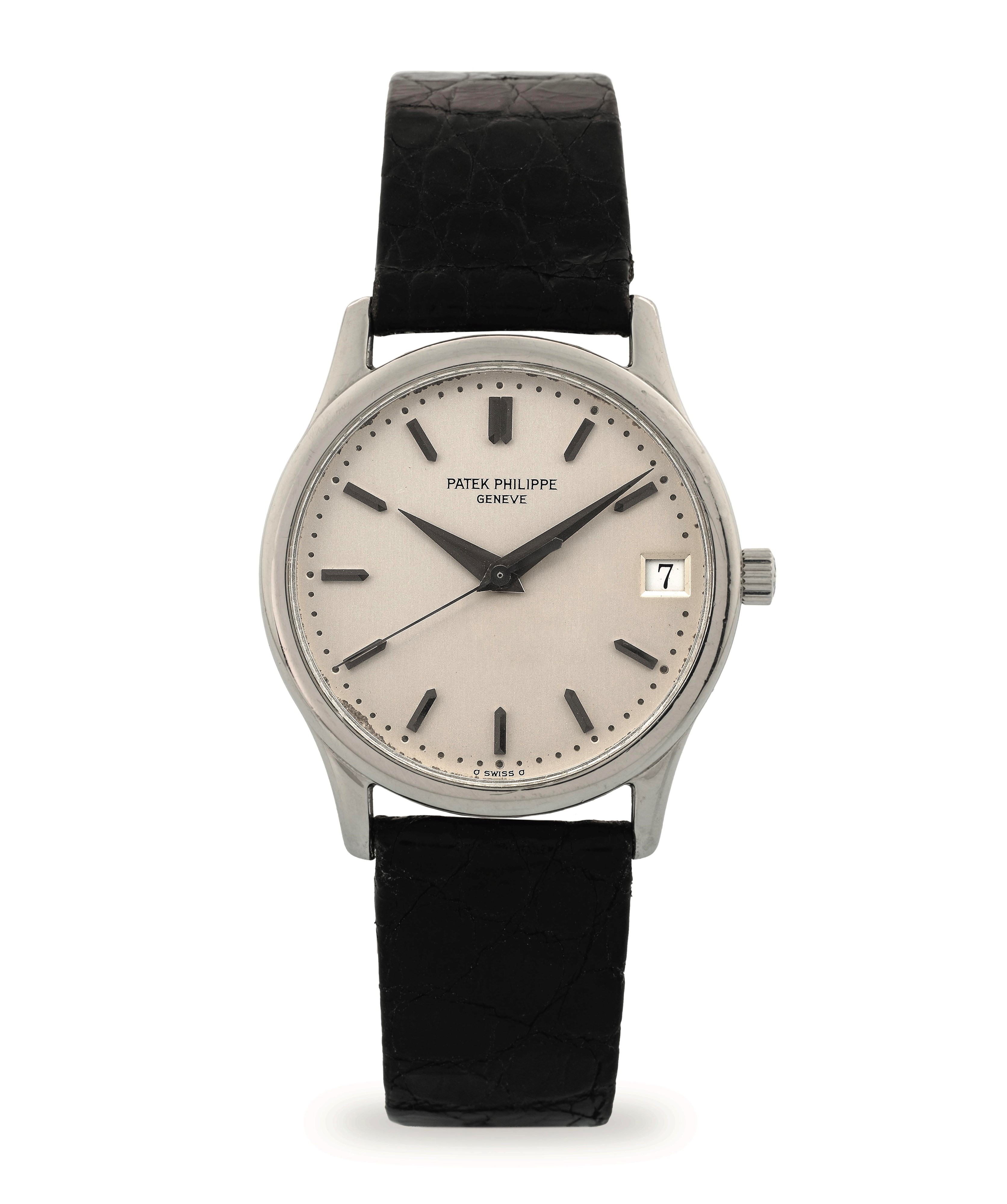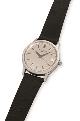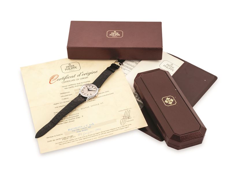 Calatrava ref 3998 P in 950 platinum, silver dial with date window at 3 o'clock, with box and warranty, circa 1991