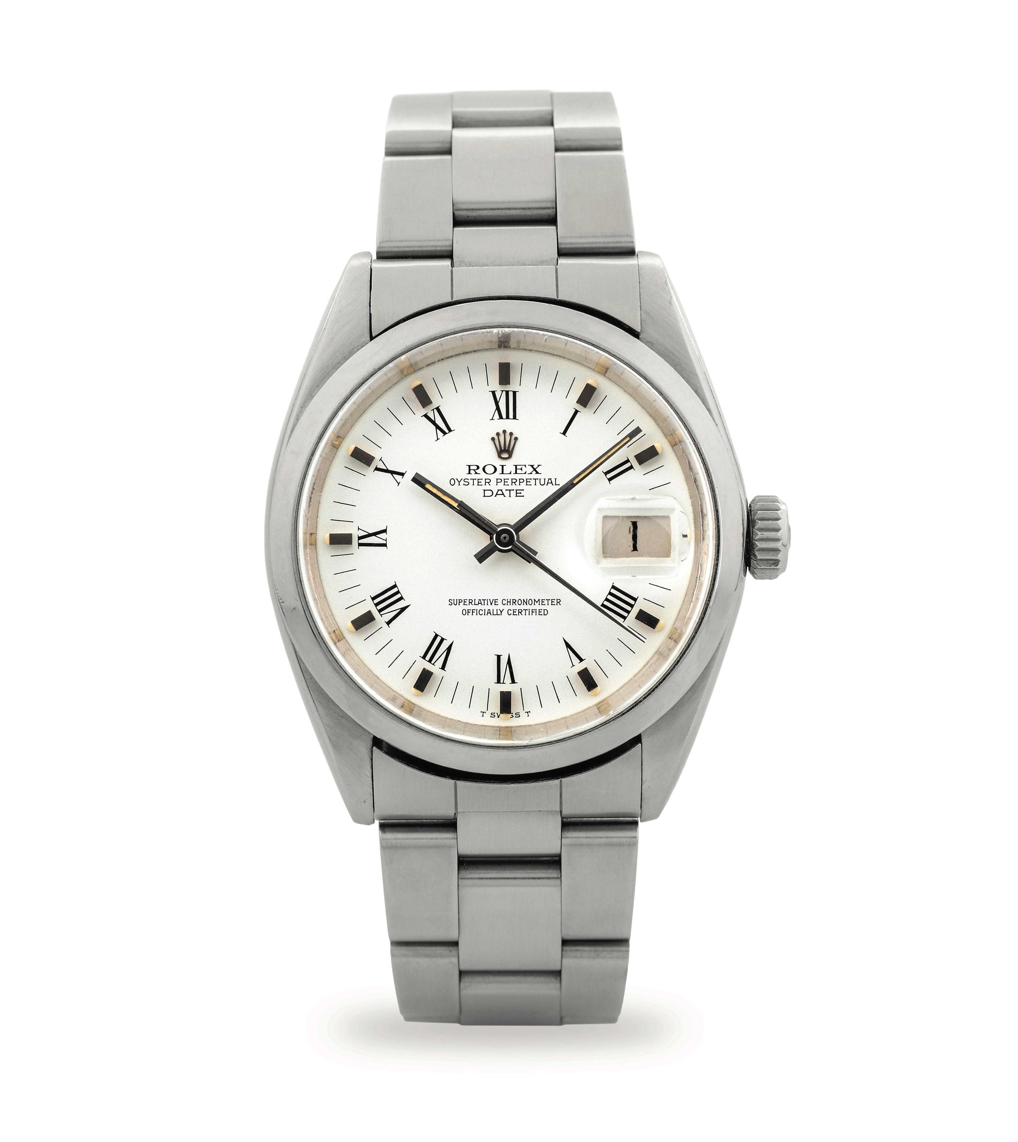 Oyster Perpetual Date ref 1500 in steel, automatic movement with date display, white dial Roman numerals, circa 1972