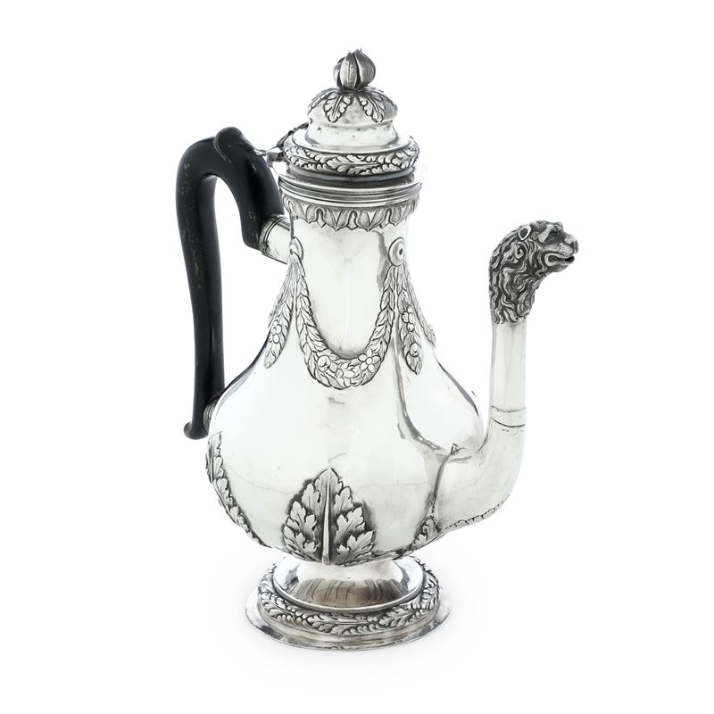 Genova, fine del XVIII secolo, marchio dell'argentiere (consunto di difficile lettura) marchio di ricontrollo con croce veneziana e delfino Caffettiera neoclassica