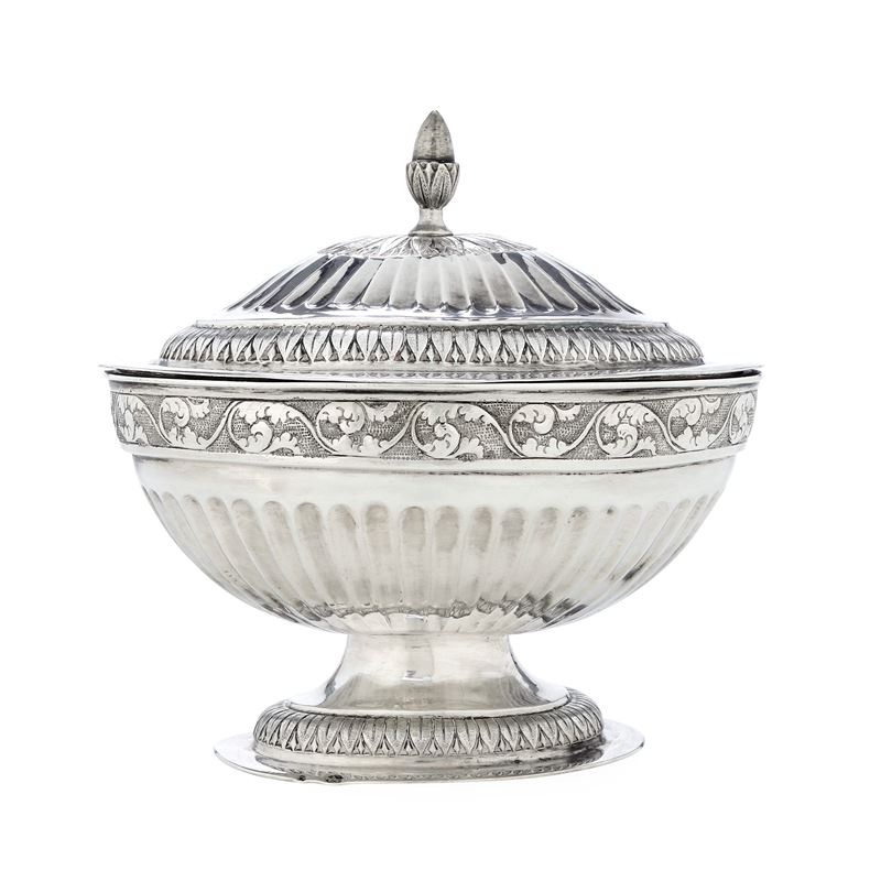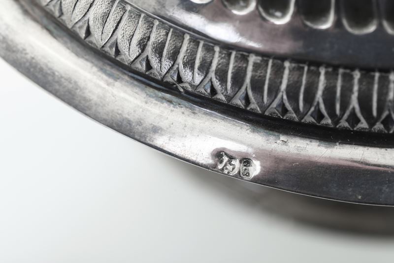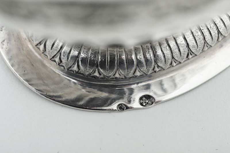 Corpo ovale scanalato poggiante su alto piede. Decori a foglie lanceolate, girali fitomorfe e presa a ghianda