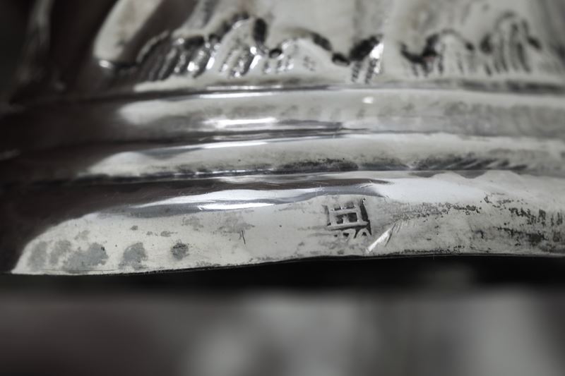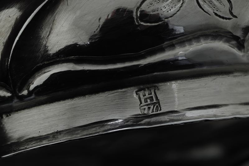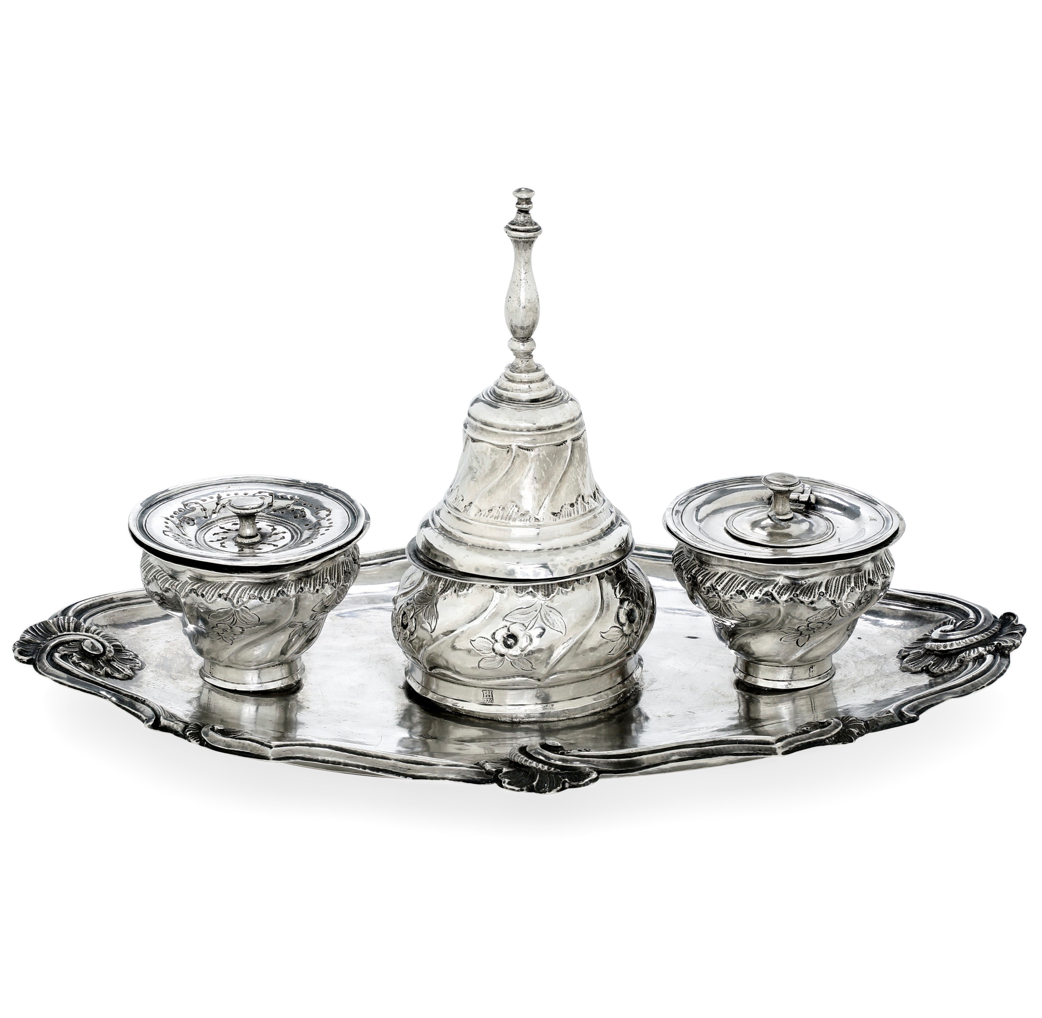 Elegante calamaio completo di vassoio, portapolvere, portainchiostro e campanello, decorati con nervature, pellacce e fiori incisi