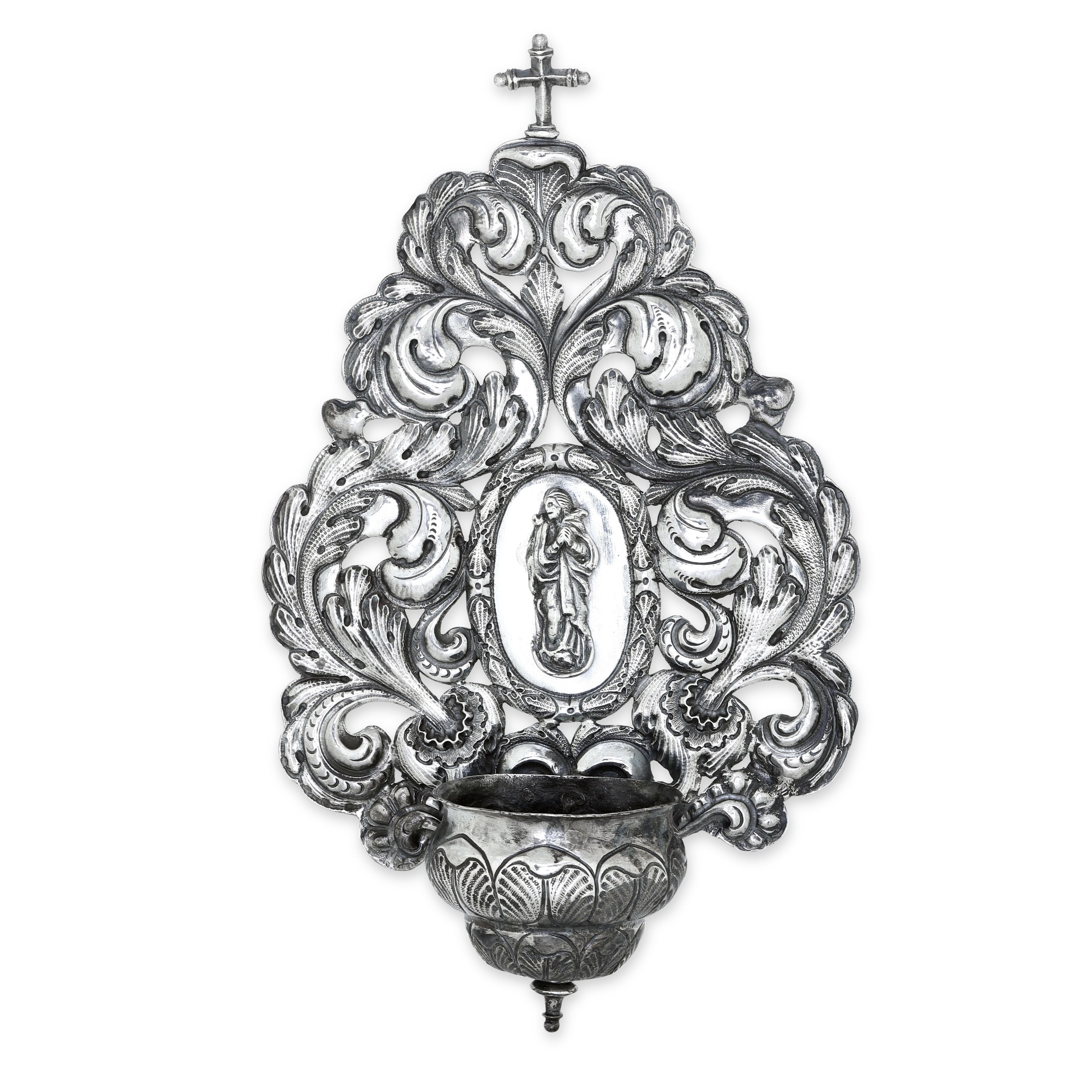 Italia (Toscana?) XVIII secolo. Apparentemente priva di punzonatura Acquasantiera con raffigurazione della Madonna Assunta