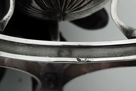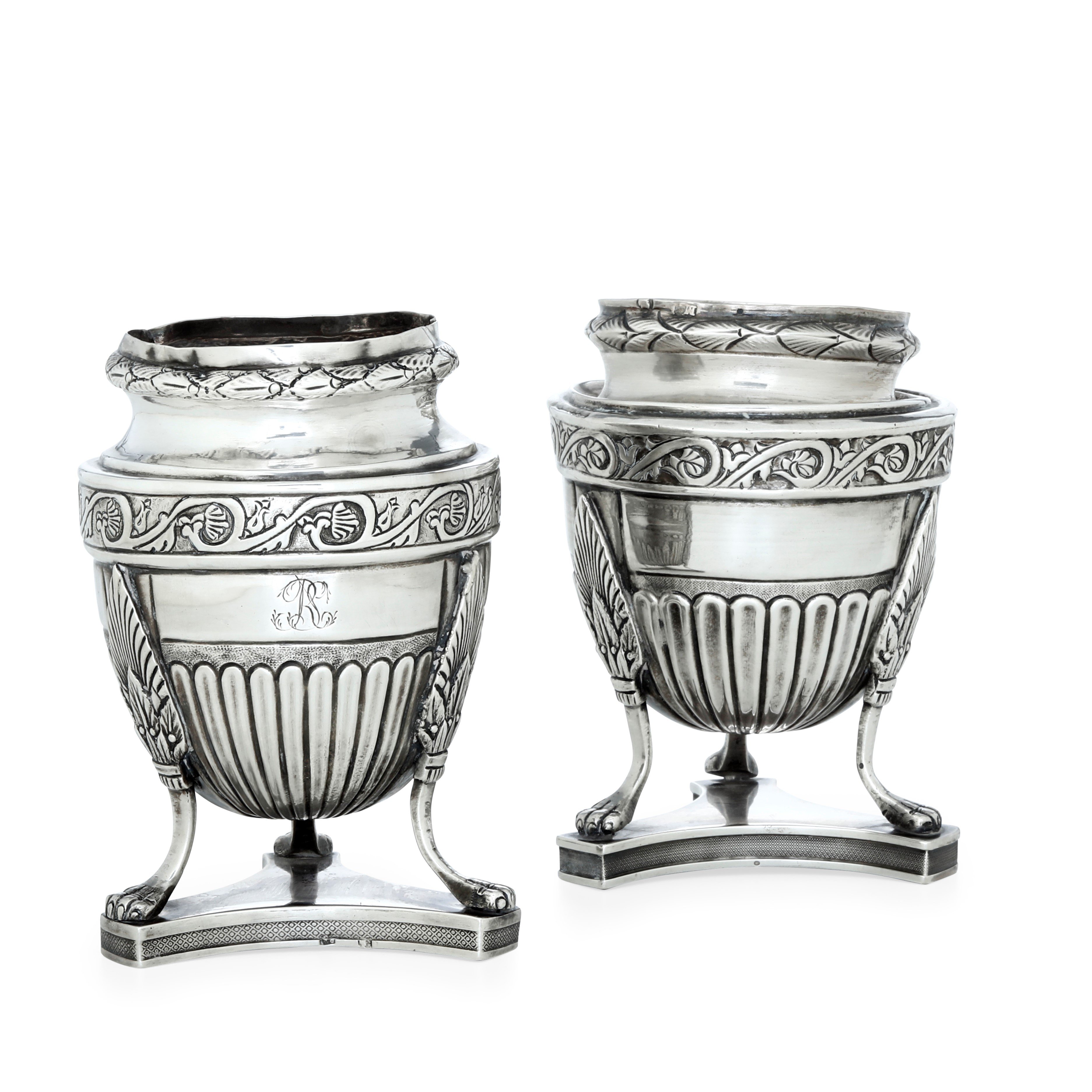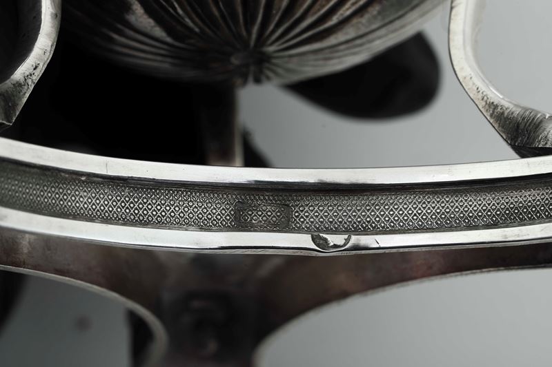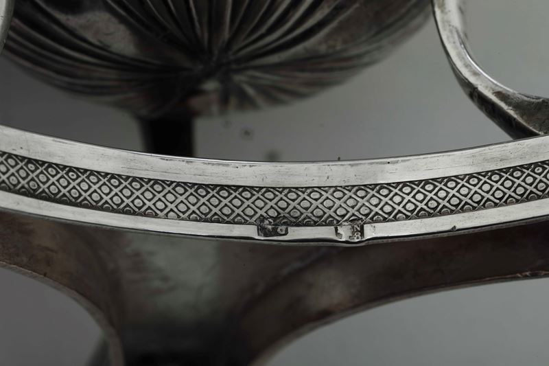 Foggia a tripode con decori di gusto neoclassico. Monogramma R L inciso a cesello