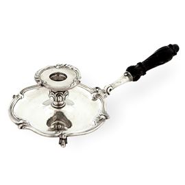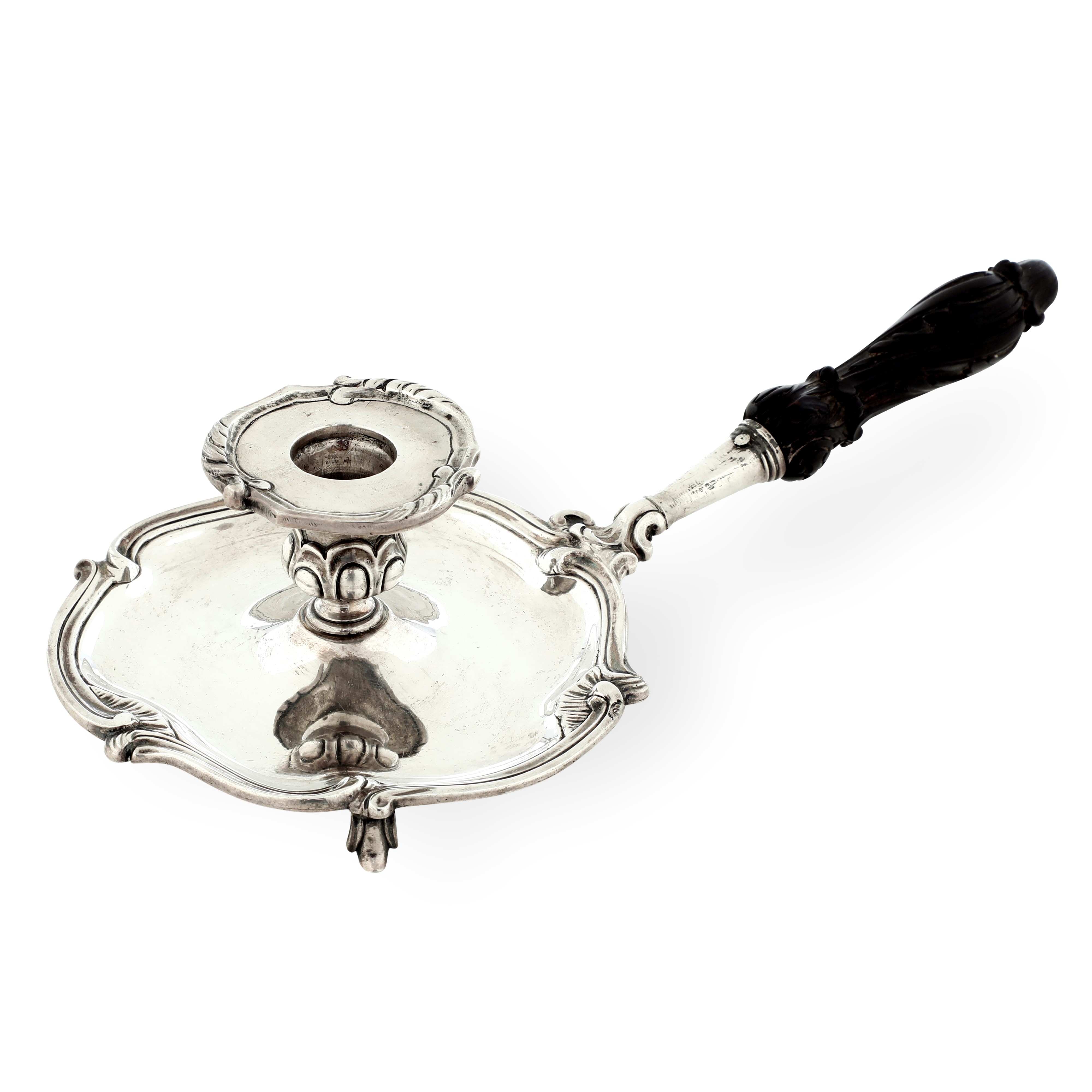 Piatto e bobeche con bordo nervato a volute fogliacee e decoro a baccellatura. Elegante manico in ebano finemente intagliato