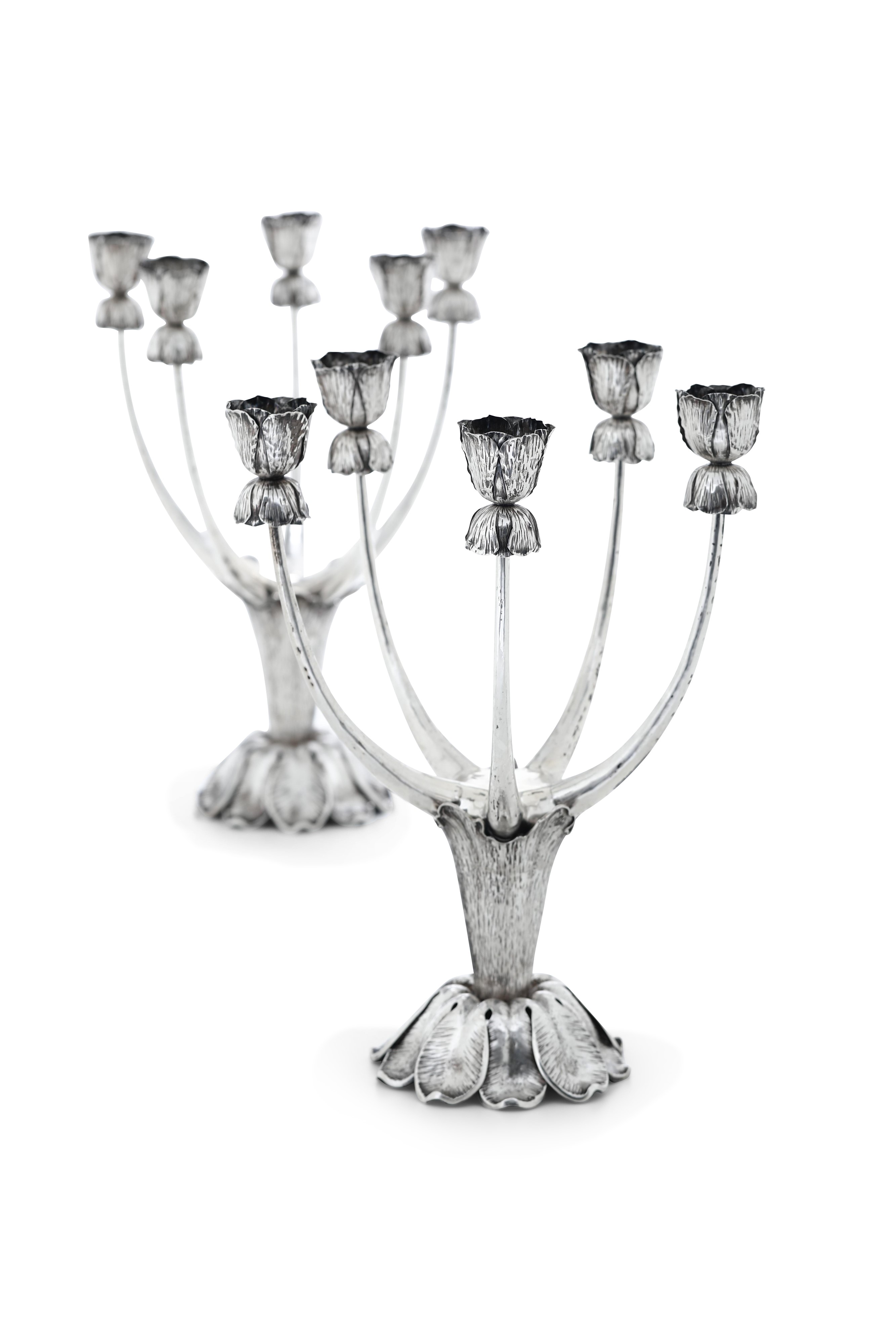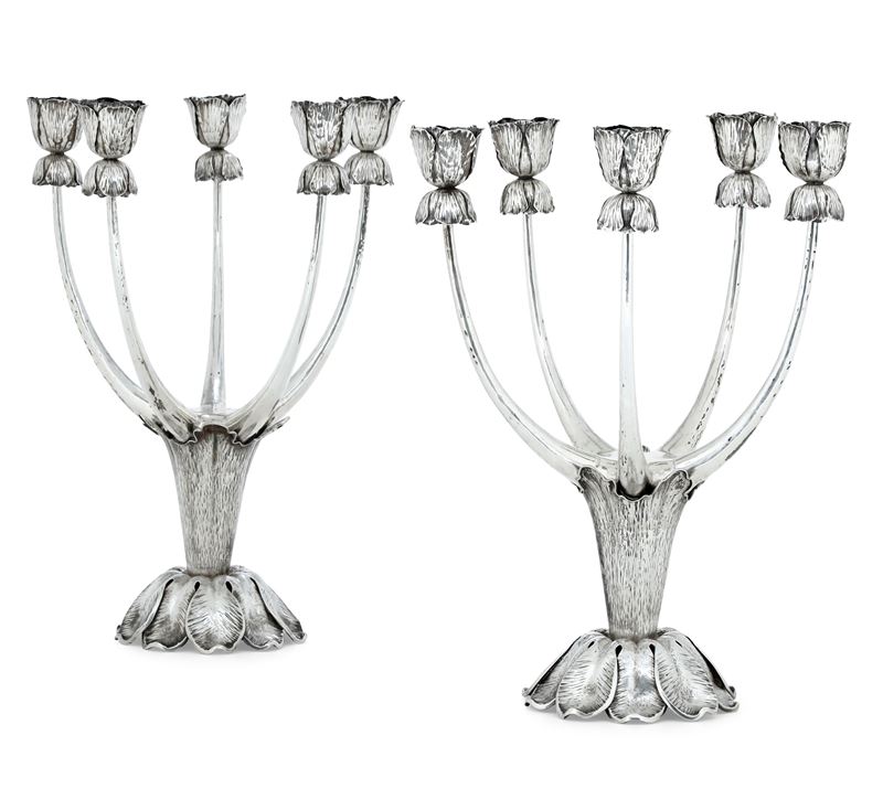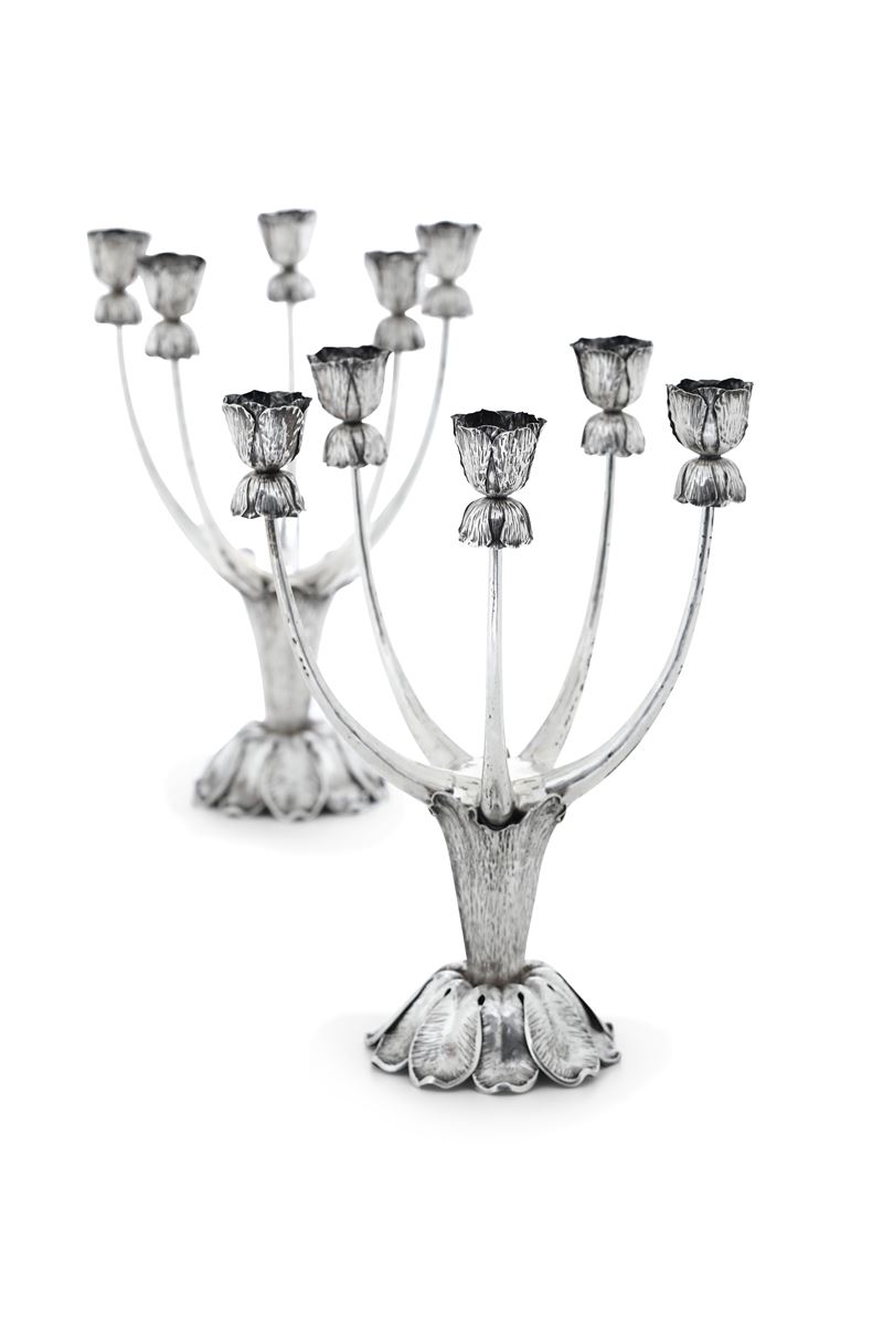 Argenteria artistica milanese, argentiere Lorenzo Martignetti Milano. Marchio con fascio littorio in uso dal 1935 al 1945 Monumentale coppia di candelabri