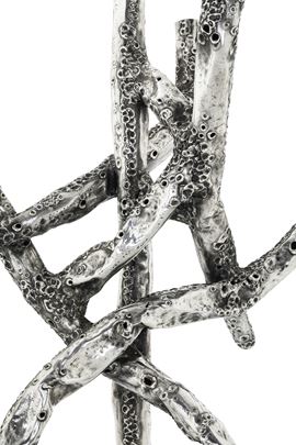 La suggestiva composizione ispirata ai rami di Gorgogna è rara testimonianza dei lavori di oreficeria dello scultore a volte eseguiti per la gioielleria Mesenza di Roma.