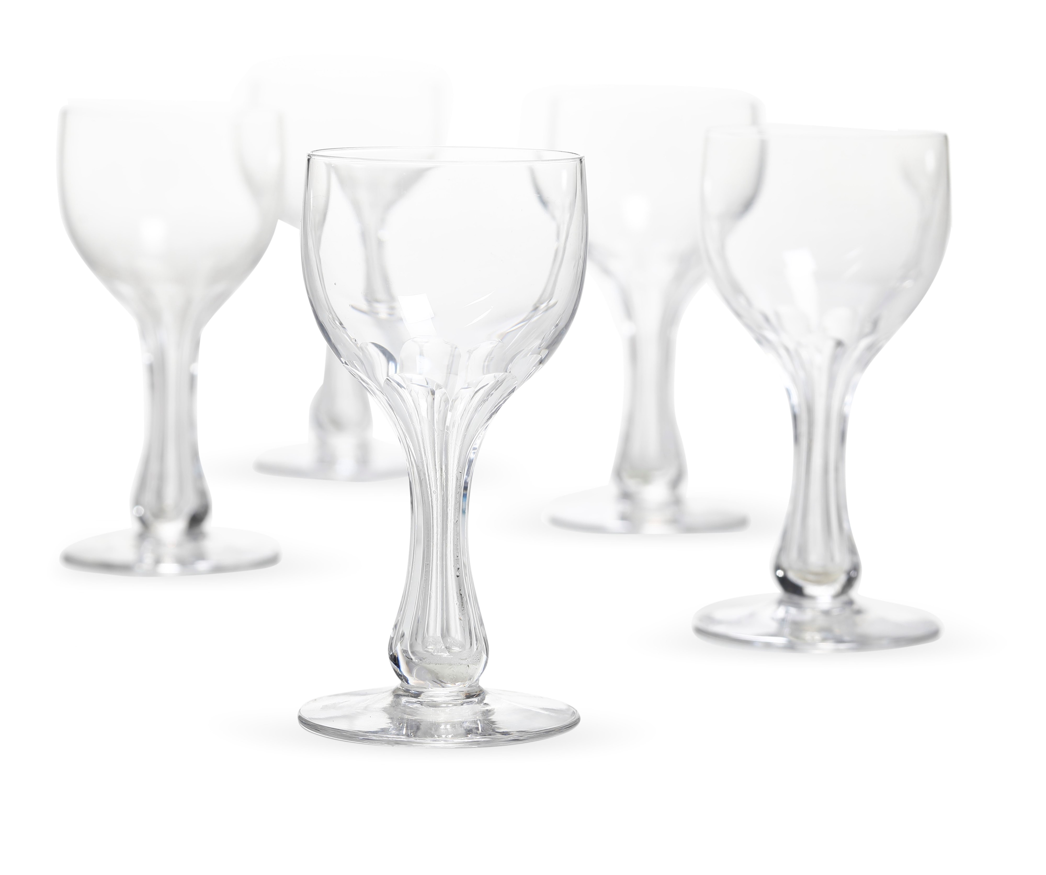 Raffinata serie di calici dalla coppa con molature alla base che formano un "petalo" e stelo cavo scanalato