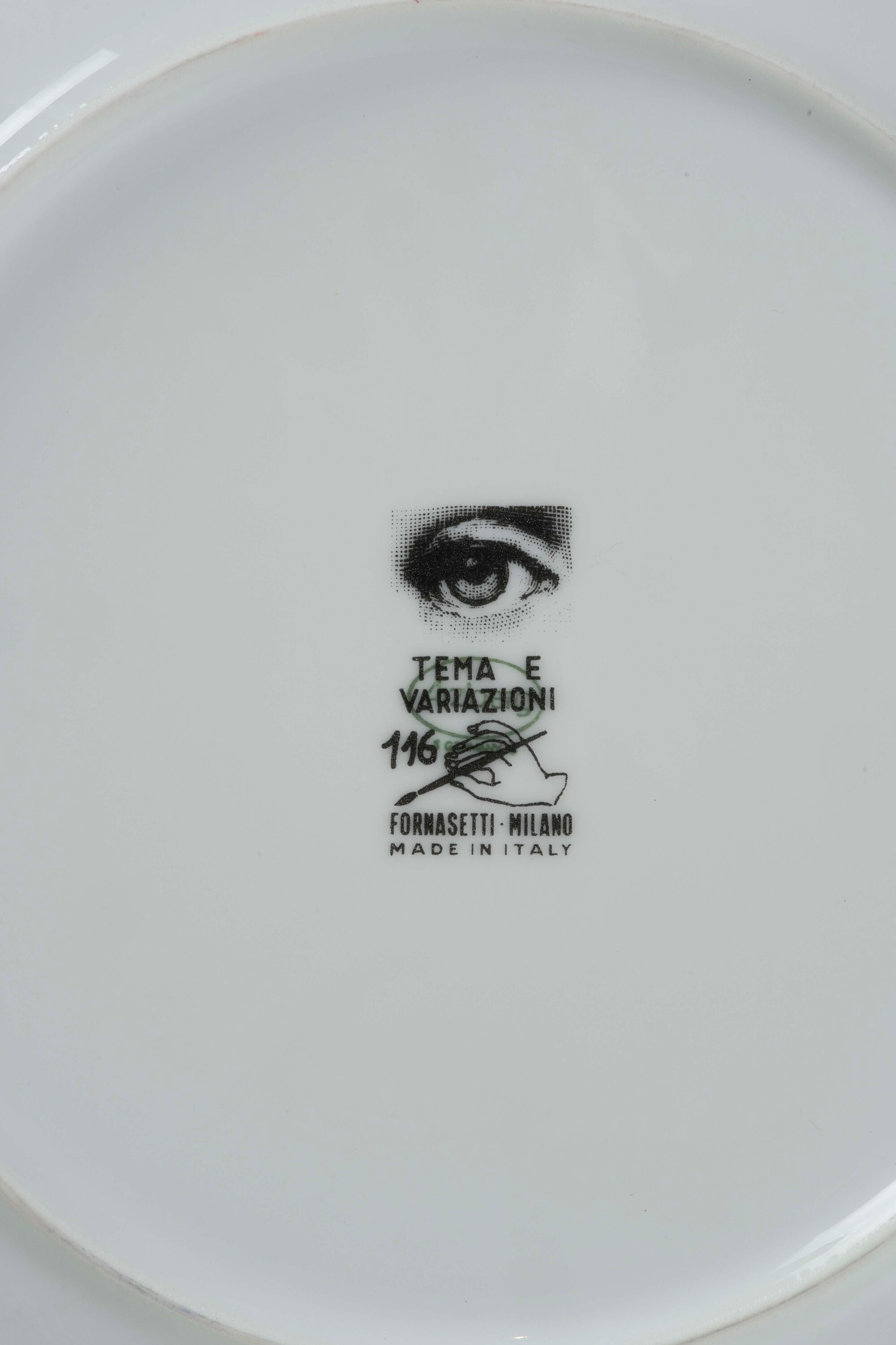 Porcellana. Marca: simbolo grafico con “Tema e Variazioni”, “Fornasetti Milano”. Diametro cm 25,4. Conservazione: ottima