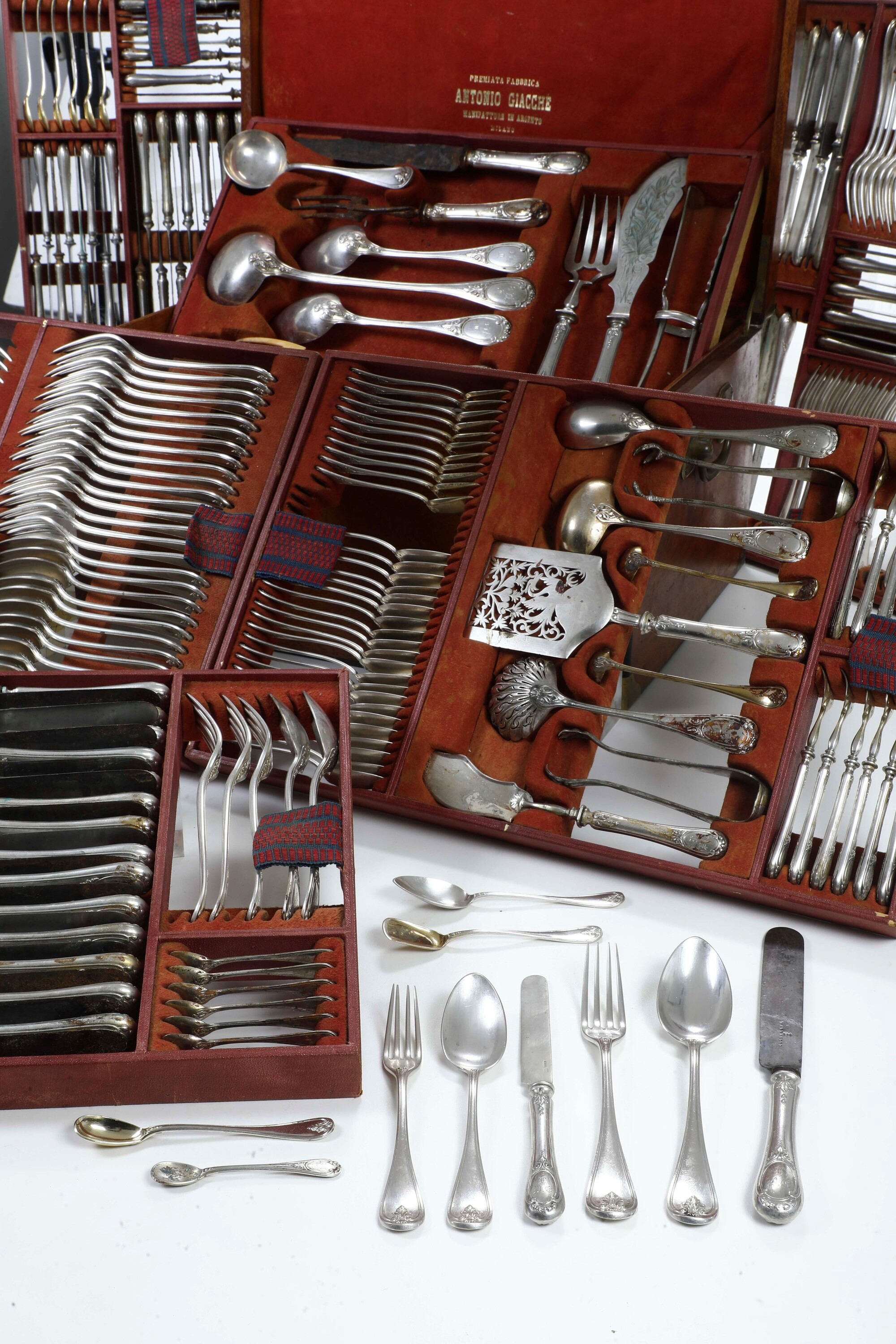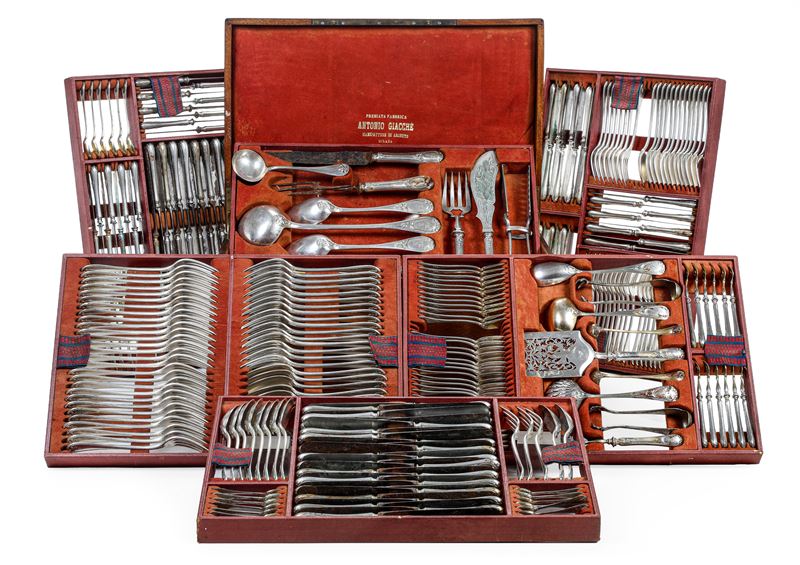 Importante servizio di posate entro custodia in legno. Milano seconda metà del XIX secolo, argentiere Anatolio Henin (186 [..]