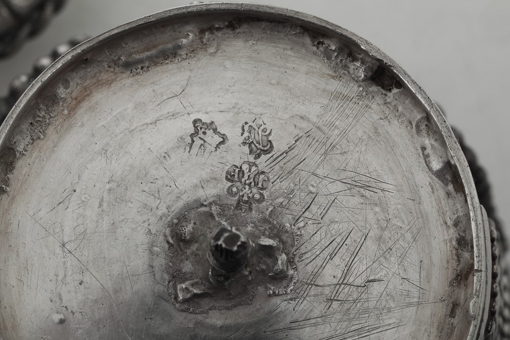 Argento fuso, sagomato e cesellato e ampolle in cristallo molato