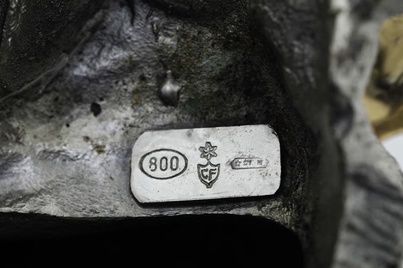 Saliera centrotavola con figura di cervo. Argenteria artistica milanese del XX-XXI secolo. Argentiere Francesco Caputo