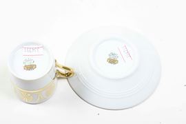 Queste tazze cilindriche con piattino troncoconico riprendono quelle dei primi anni del XIX secolo, sia per la forma sia per la decorazione, realizzata con fregi dorati a motivi vegetali stilizzati su fondo bianco