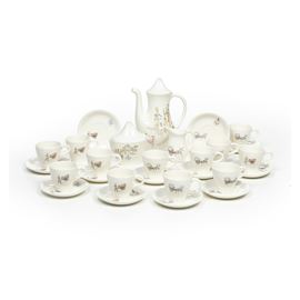 Il servizio per 12 persone conta 15 pezzi ed è così composto: 12 tazze da caffè con piattino (altezza tazza cm 6; diametro piattino cm 11,5); 1 caffettiera (altezza cm 20,5); 1 lattiera (altezza cm 9); 1 zuccheriera (altezza cm 11)