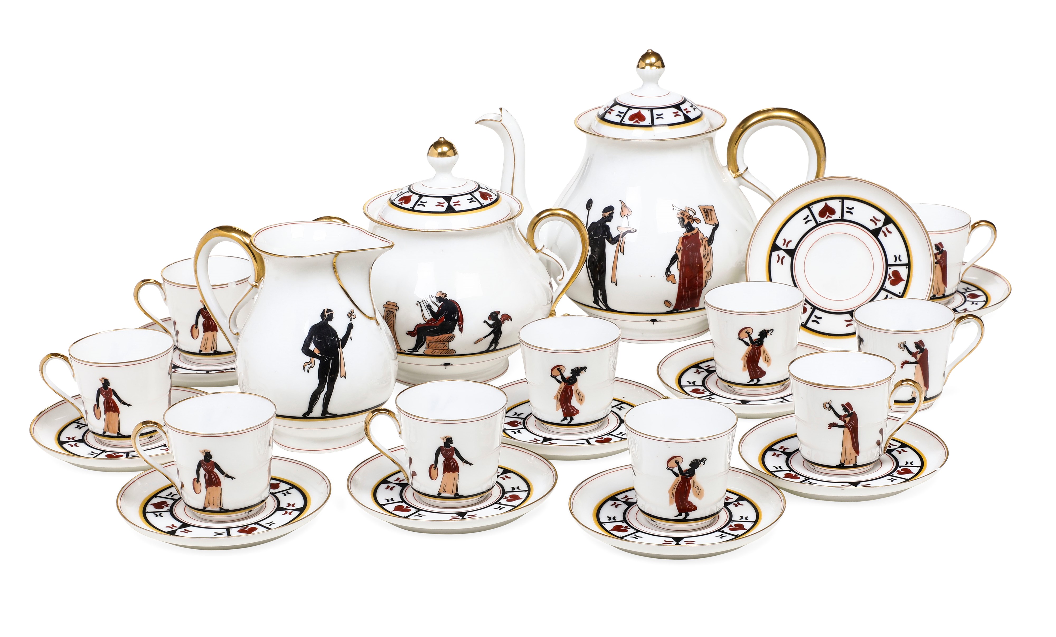 La decorazione di questo insolito servizio da tè, eseguita in policromia e con profilature in oro, trae ispirazione dai motivi classici dell'antica Grecia e dell'Etruria