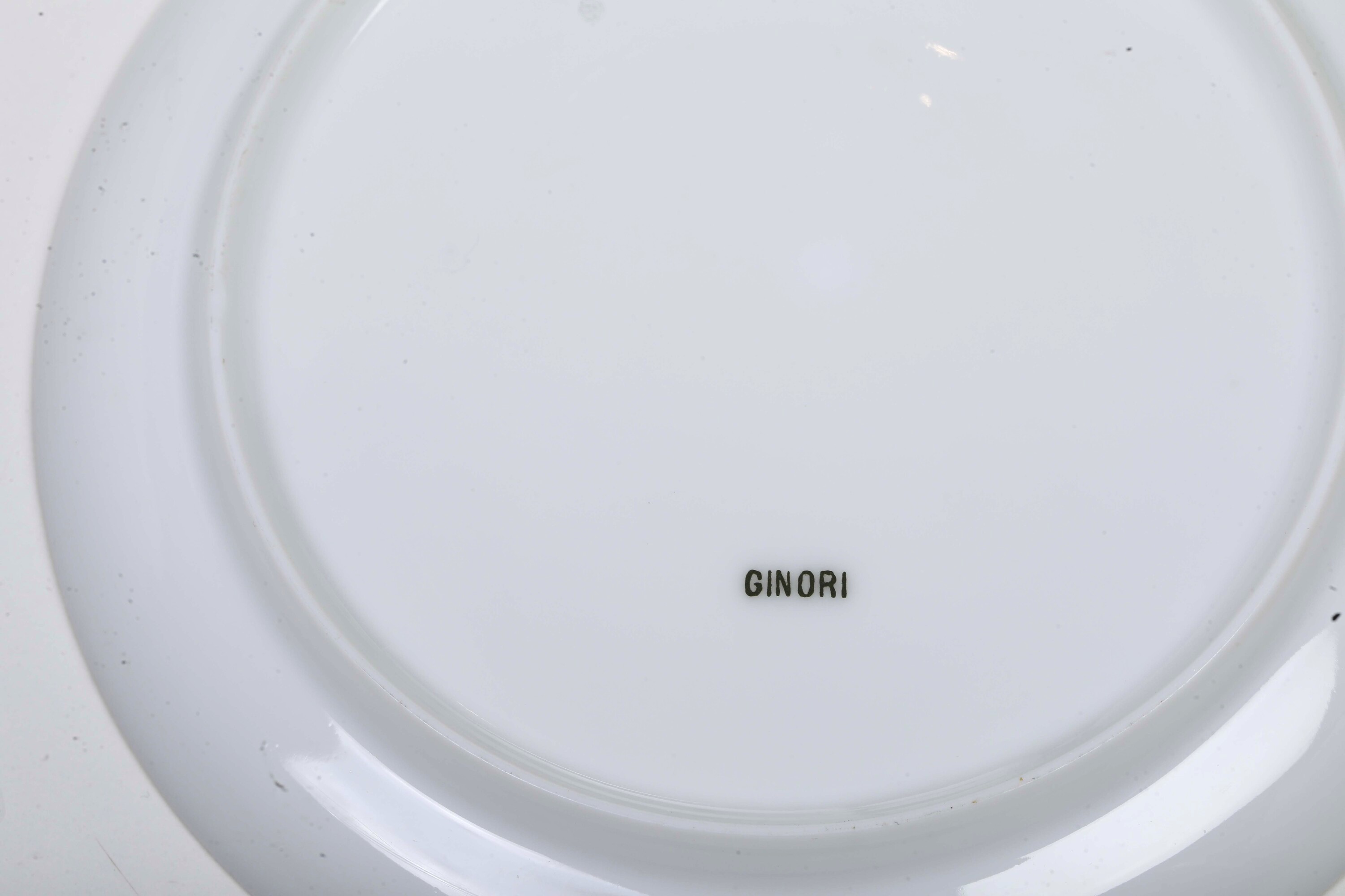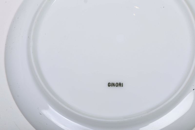 Porcellana. Marca: “Ginori” in verde. Conservazione: ottima; un piattino e una tazzina con piccola seccatura al bordo; caffettiera con leggere usure all’oro del manico