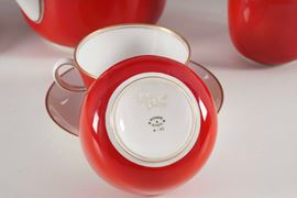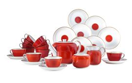 Queste porcellane sono state ideate da Giovanni Gariboldi (1908-1971), che ha lavorato come apprendista di Gio Ponti prima di diventare, nel 1946, direttore creativo della Manifattura di Doccia. Questo set si distingue per il design in perfetto equilibrio tra funzionalità e bellezza, nonché per il meraviglioso colore rosso con filettature in oro