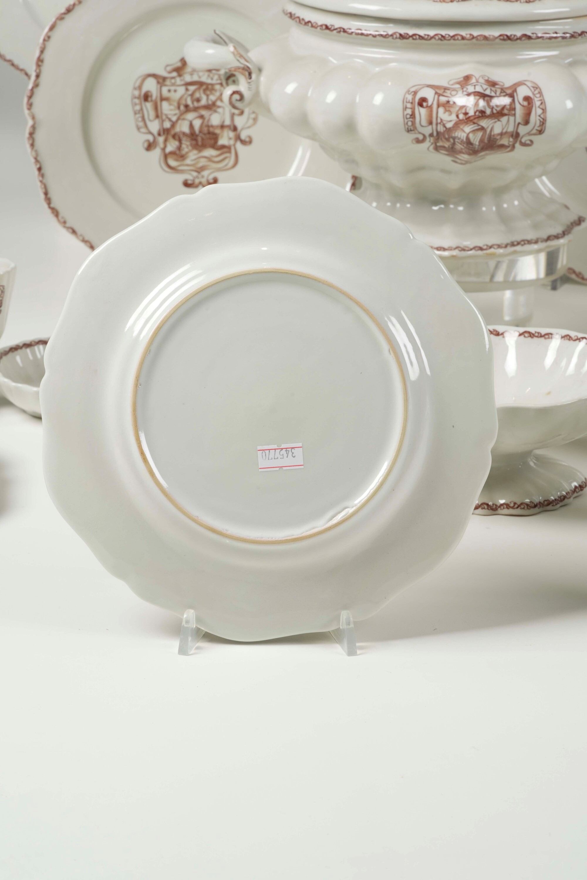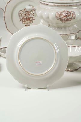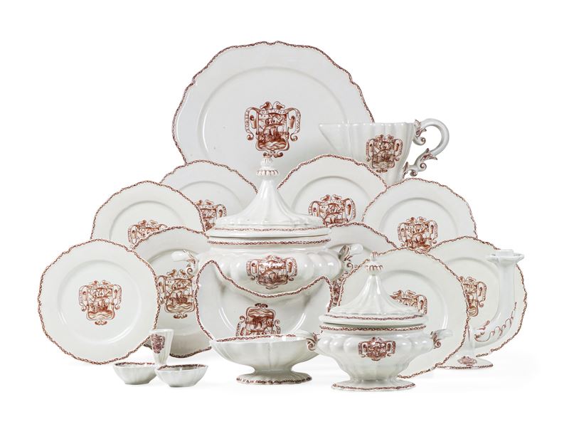Il servizio conta 73 pezzi ed è così composto: 12 piatti fondi (diametro cm 25); 18 piatti piani (diametro cm 25); 9 piatti da dessert (diametro cm 22); 12 piattini per insalata a forma di mezzaluna (cm 23x13); 4 portauovo; 1 zuppiera (altezza cm 34; cm 34x19); 2 legumiere (altezza cm 21; cm 22,5x14); 1 insalatiera (altezza cm 10; diametro cm 31); 2 saliere; 4 piatti da portata ovali (cm 41x38); 1 mestolino; 1 alzata (altezza cm 14; diametro cm 28); 2 alzate piccole (altezza cm 7,5; cm 21,5x17); 2 brocche (altezza cm 18); 2 candelieri (altezza cm 22)