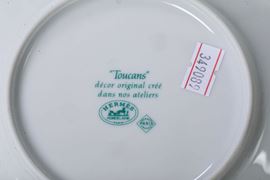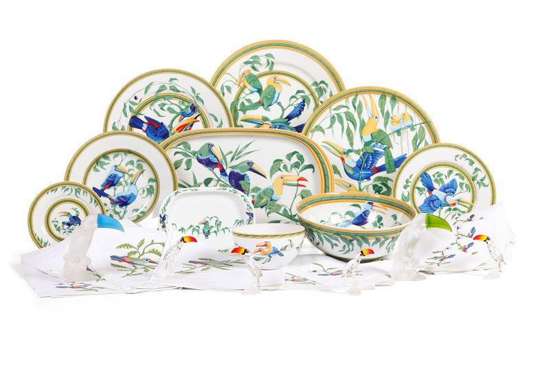 La casa di moda parigina Hermès, fondata nel 1837, è famosa per la creazione di beni di lusso e articoli per la casa dallo stile inconfondibile. Le porcellane con il motivo "Toucans", che raffigura tucani blu con becchi multicolori, fogliame verde e fasce gialle e verdi, sono state prodotte dal 1991 al 2017