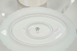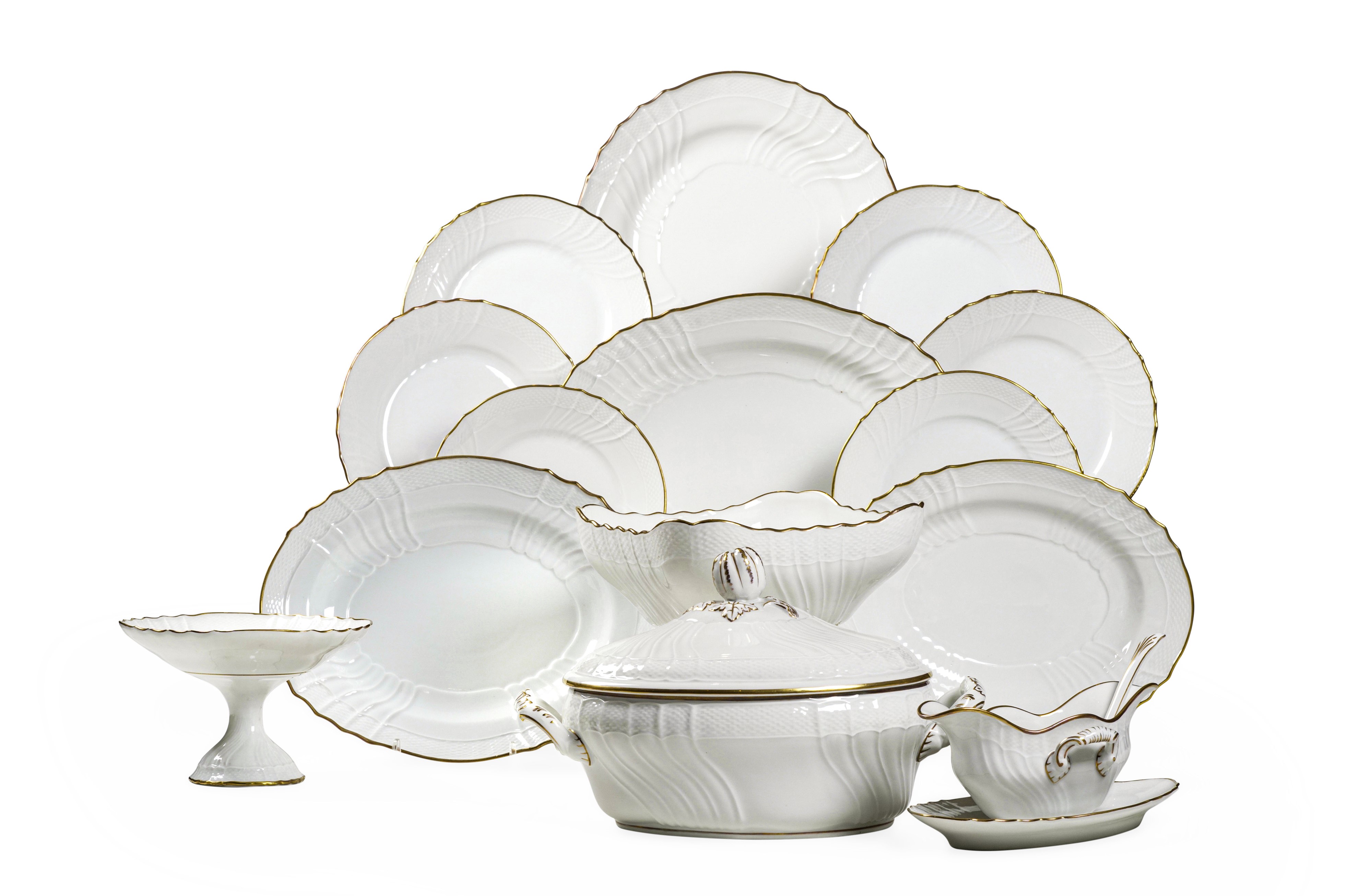 Il servizio per 11 persone conta 71 pezzi ed è così composto: 11 piatti fondi (diametro cm 24,5); 36 piatti piani (diametro cm 24,5); 12 piatti da dessert (diametro cm 22,3); 1 zuppiera (altezza cm 21; cm 28x21); 1 insalatiera (altezza cm 10,8; cm 24x24); 1 salsiera con mestolino; 1 piatto da portata tondo (diametro cm 33,5); 4 piatti da portata ovali (2 pezzi cm 31,4x23,9; cm 35,8x26,5; cm 39,5x28); 2 vassoietti (cm 23,5x13,8); 2 alzatine (altezza cm 13; diametro cm 22)