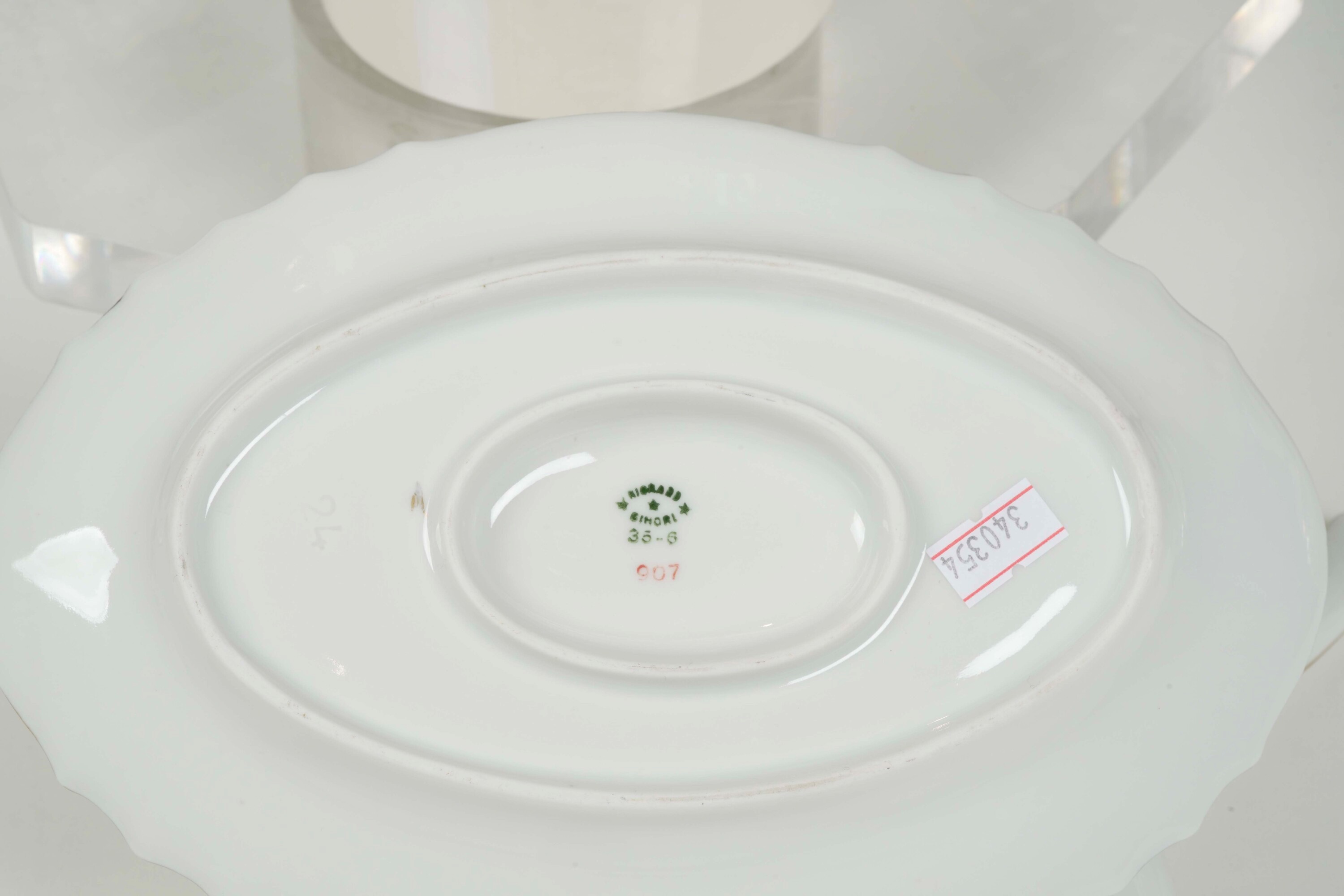 Porcellana. Marca: "Richard Ginori ***" in verde. Conservazione: ottima; 1 piatto fondo e 1 alzatina con piccola sbeccatura al bordo superiore