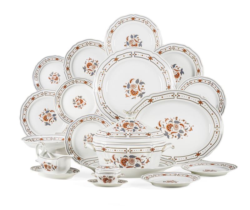 Il servizio per 12 persone conta 57 pezzi ed è così composto: 12 piatti fondi (diametro cm 25); 24 piatti piani (diametro cm 25); 13 piatti da dessert (diametro cm 21); 1 zuppiera (altezza cm 24; cm 30x21); 1 insalatiera (altezza cm 10; cm 25x20); 1 salsiera con mestolo; 1 mostardiera; 1 piatto da portata tondo (diametro cm 35); 2 piatti da portata ovali (cm 40x38; cm 30x29); 1 alzatina (altezza cm 9,5x22)