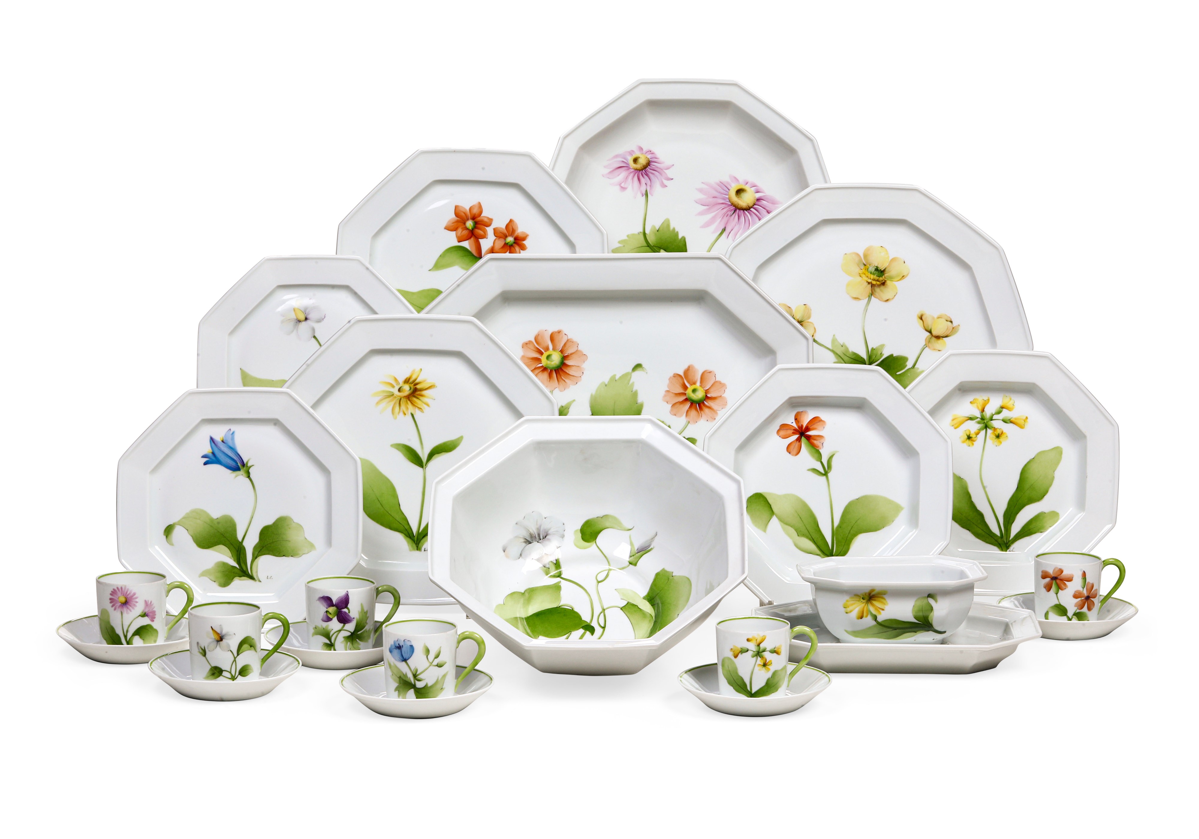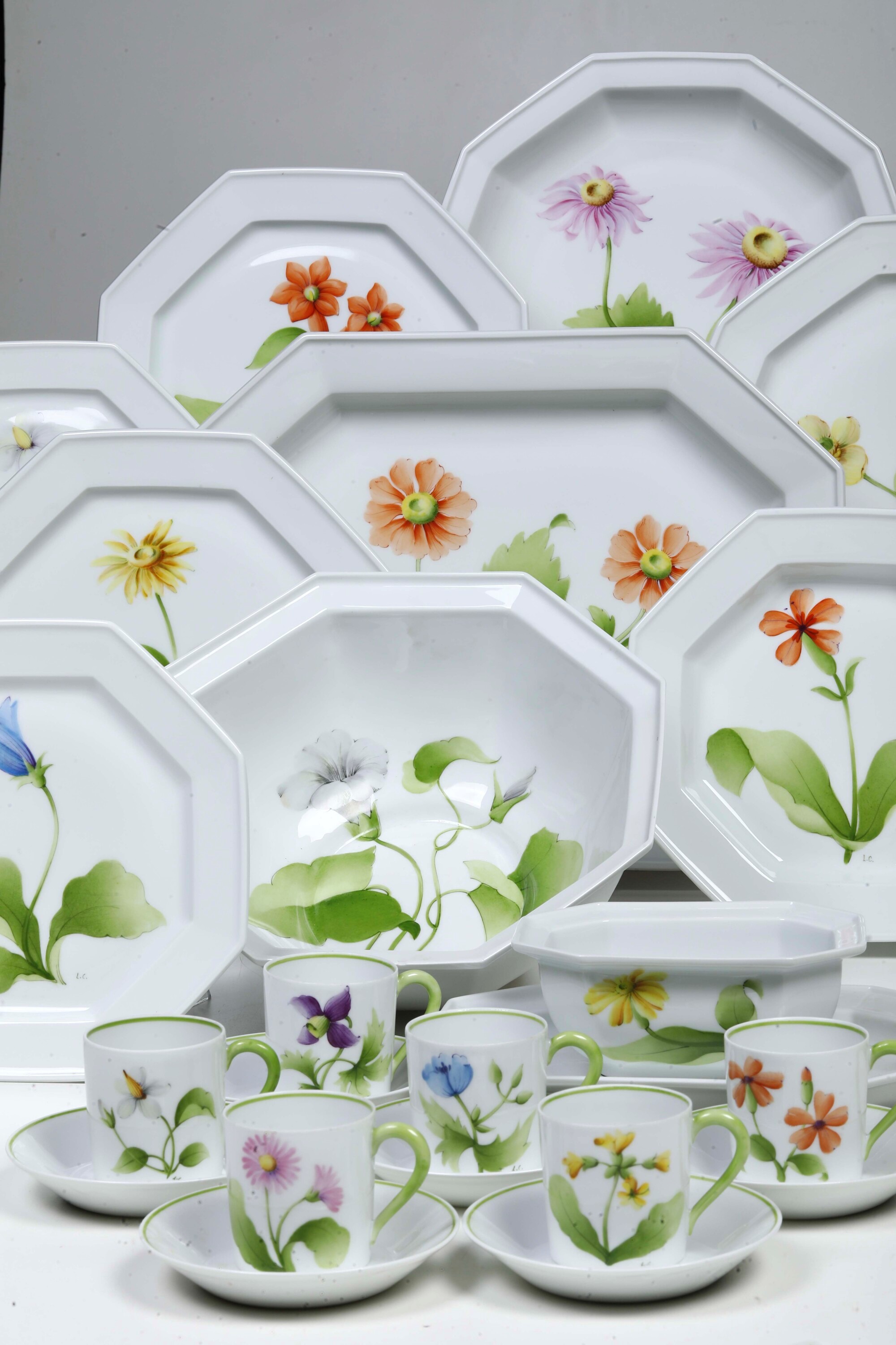 I pezzi di questo servizio hanno forma ottagonale e sono stati dipinti a mano nello storico atelier parigino Le Chambrelain, nato attorno alla metà del secolo scorso e ancora attivo oggi. La sua fama lo ha portato a collaborare con prestigiose manifatture di porcellane, come quelle di Limoges