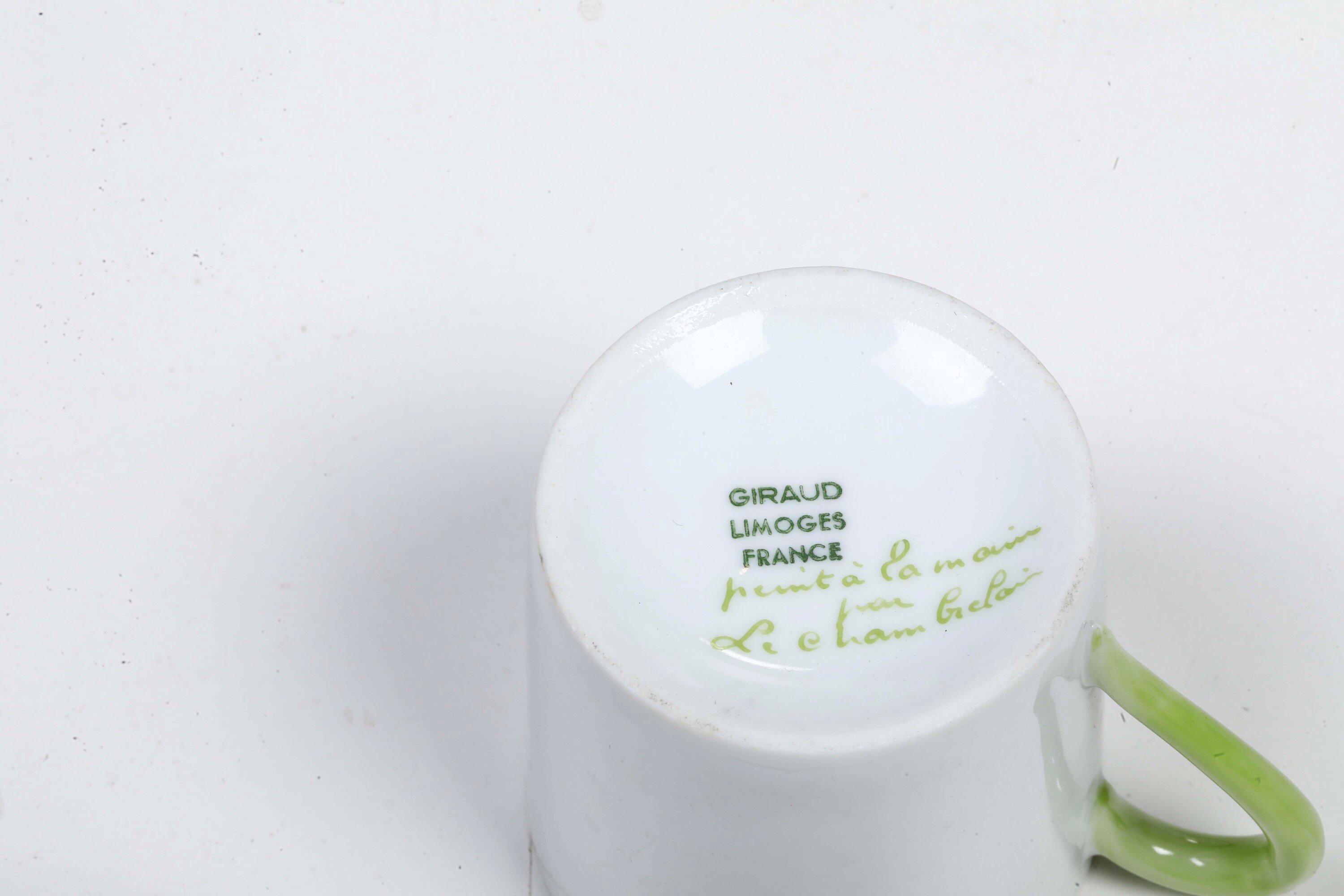 Porcellana. Marca: “Coquet Limoges-France Forme Lotus” in nero; “Peint à la main par Le Chambrelain” in rosso; “Limoges France” in verde. Conservazione: 1 piattino da caffè e insalatiera con sbeccatura al bordo
